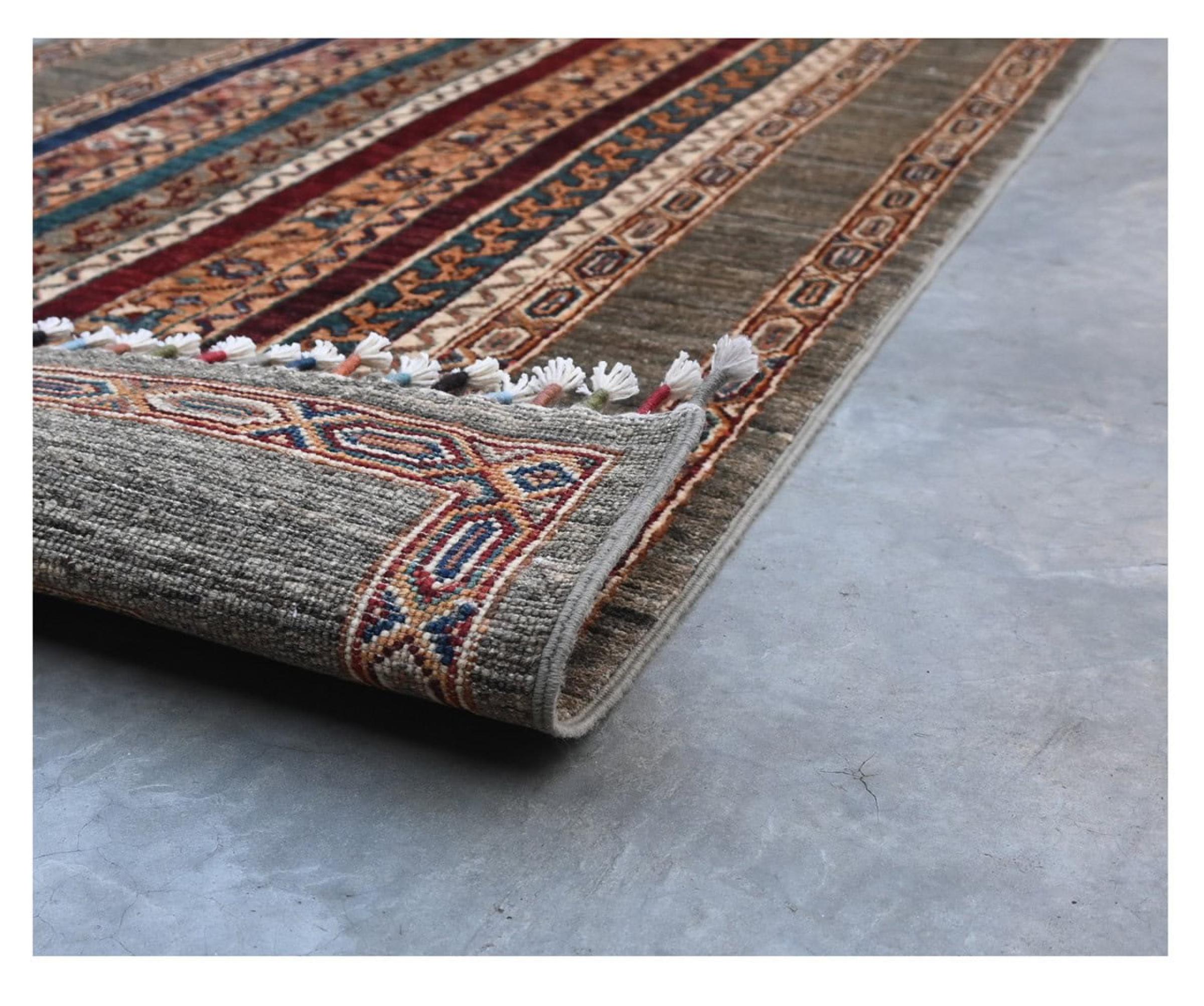 Dieser Teppich besteht aus von Hand gesponnener Schafwolle in höchster Qualitätsstufe. Vor allem im Iran (ehem. Persien), Afghanistan und Pakistan wird Wolle noch von Hand gesponnen, bevor die eigentliche Knüpfung des Teppichs beginnt. Wolle hat sich als natürliches und extrem strapazierfähiges Material über Jahrhunderte hinweg bewährt. Sie besitzt unter Anderem schmutzabweisende und wärmedämmende Eigenschaften. Zugleich ist Wolle unvergleichlich weich und bringt einen natürlichen Glanz mit sich.