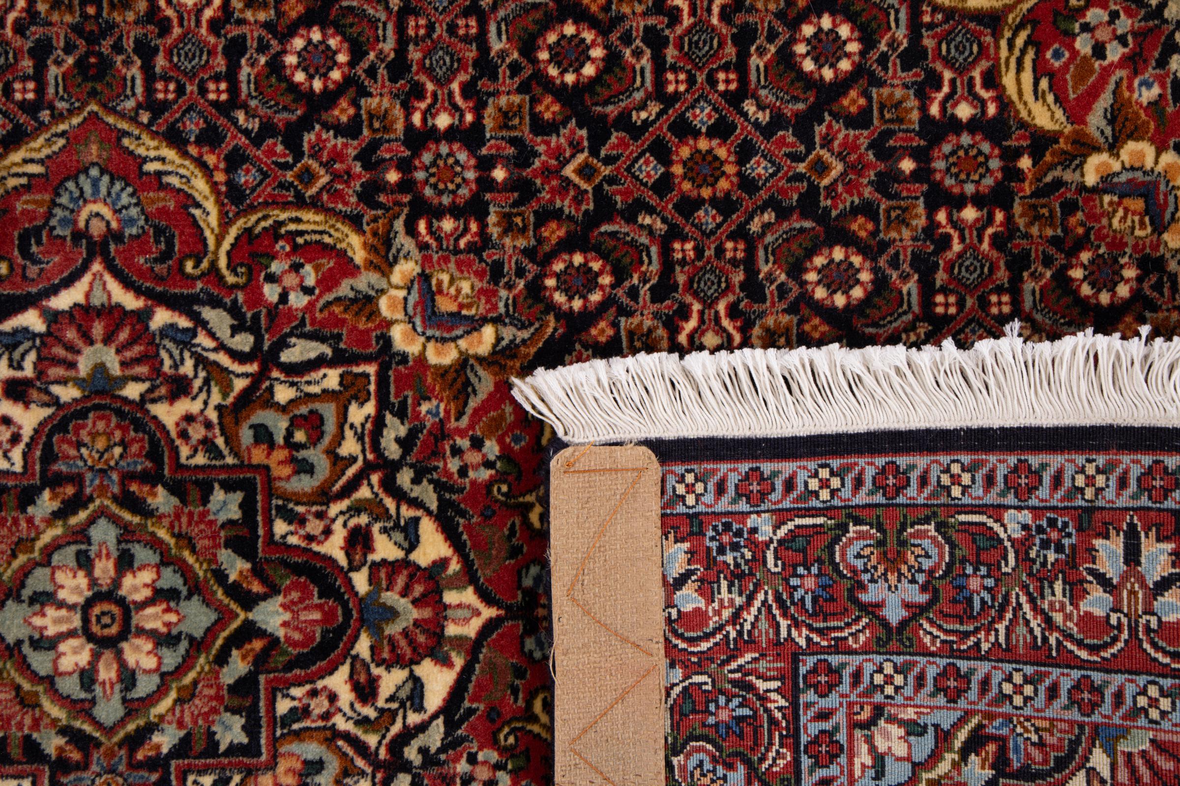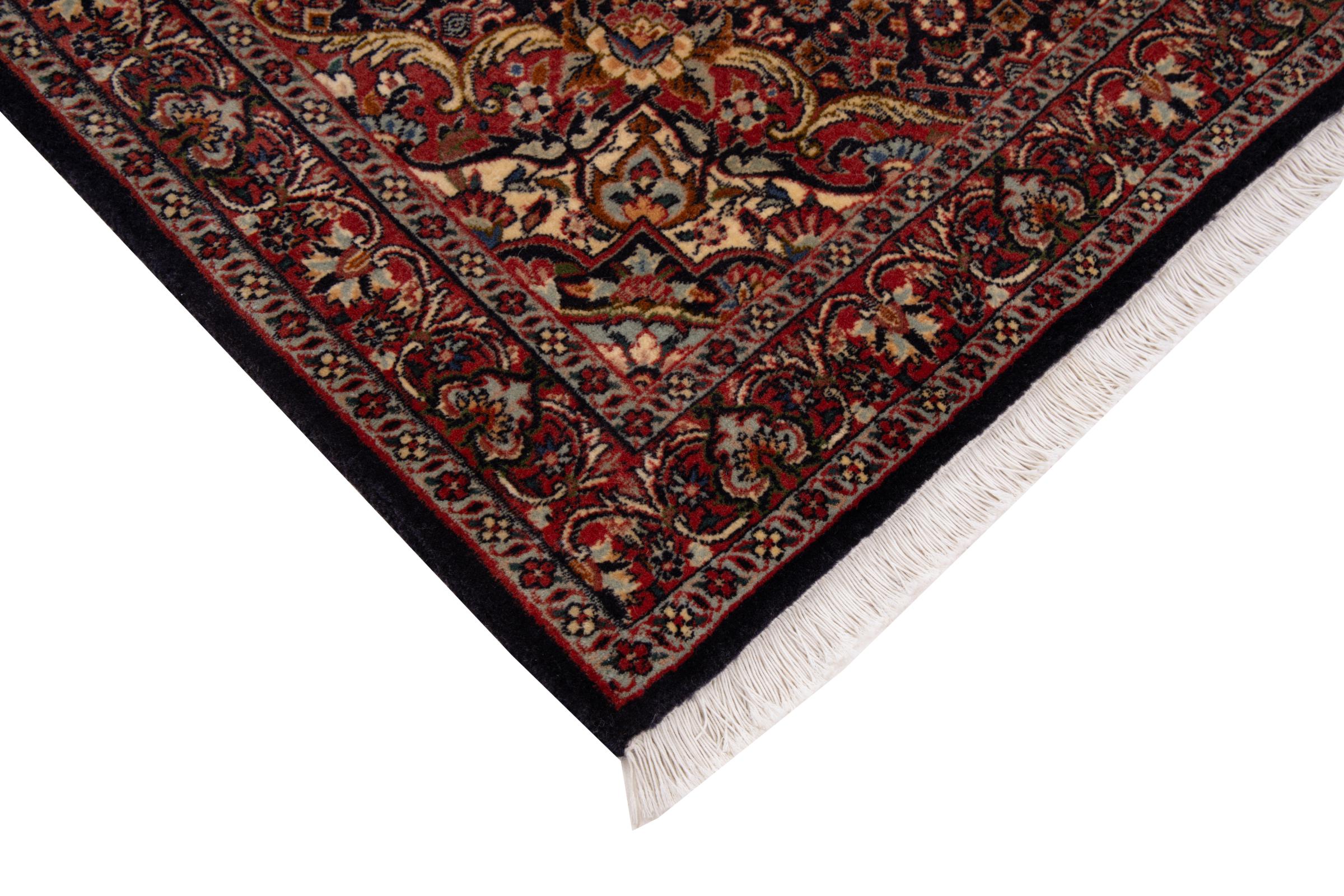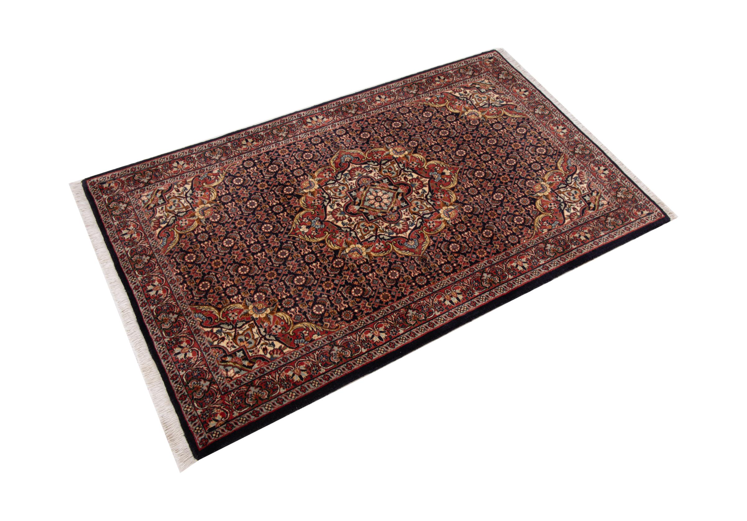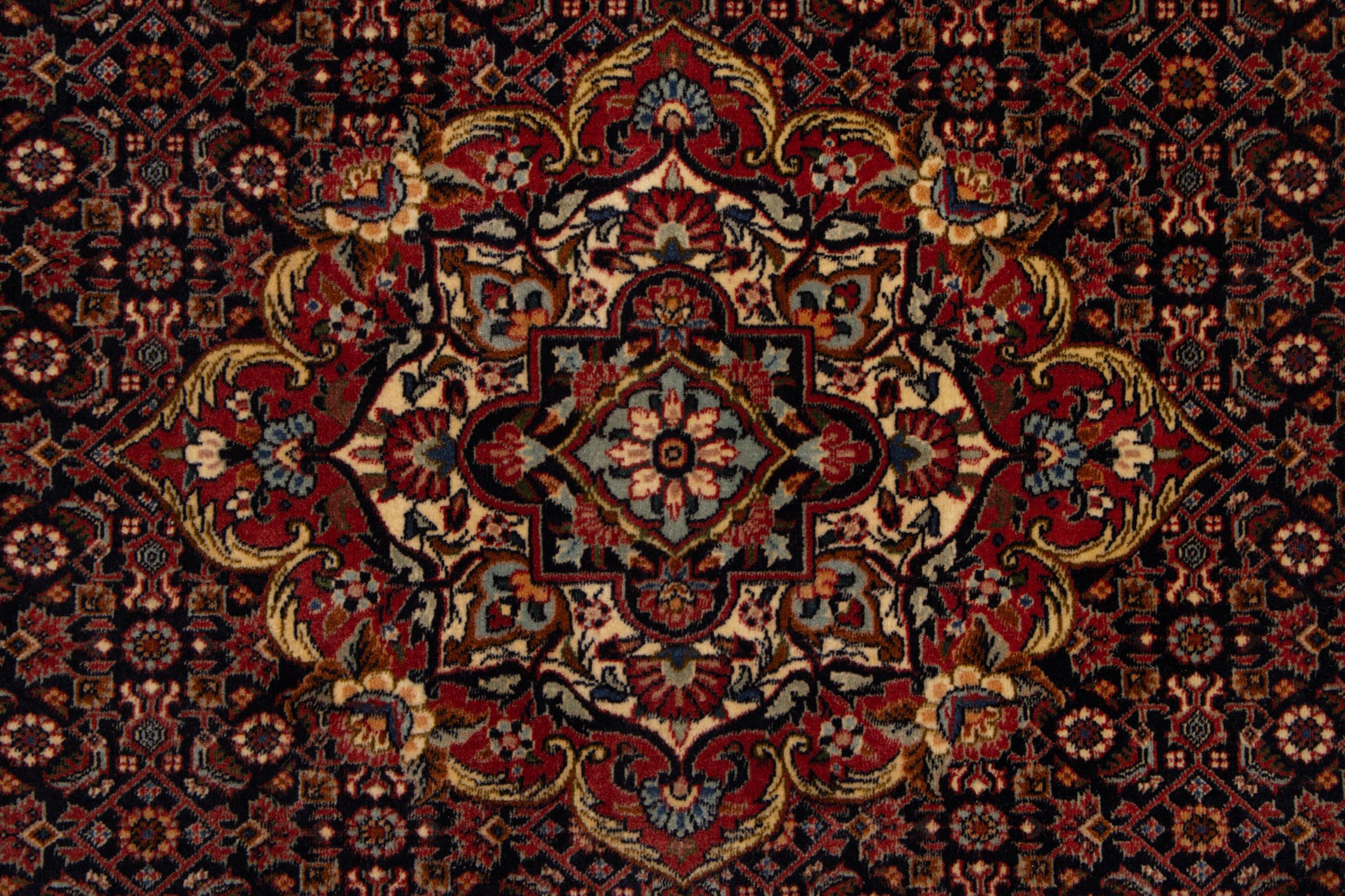 Dieser Perserteppich wurde in einer kurdischen Kleinstadt im westlichen Iran handgeknüpft. Der Bidjar-Teppich steht für hervorragende Qualität. Sein fester Flor besticht durch seine Kompaktheit und damit Verschleißfestigkeit. So wird die Wolle mit einem Kamm so fest zusammengedrückt, dass der Flor nahezu senkrecht nach oben steht. Gröbere Schmutzpartikel haben so kaum eine Chance einzudringen.