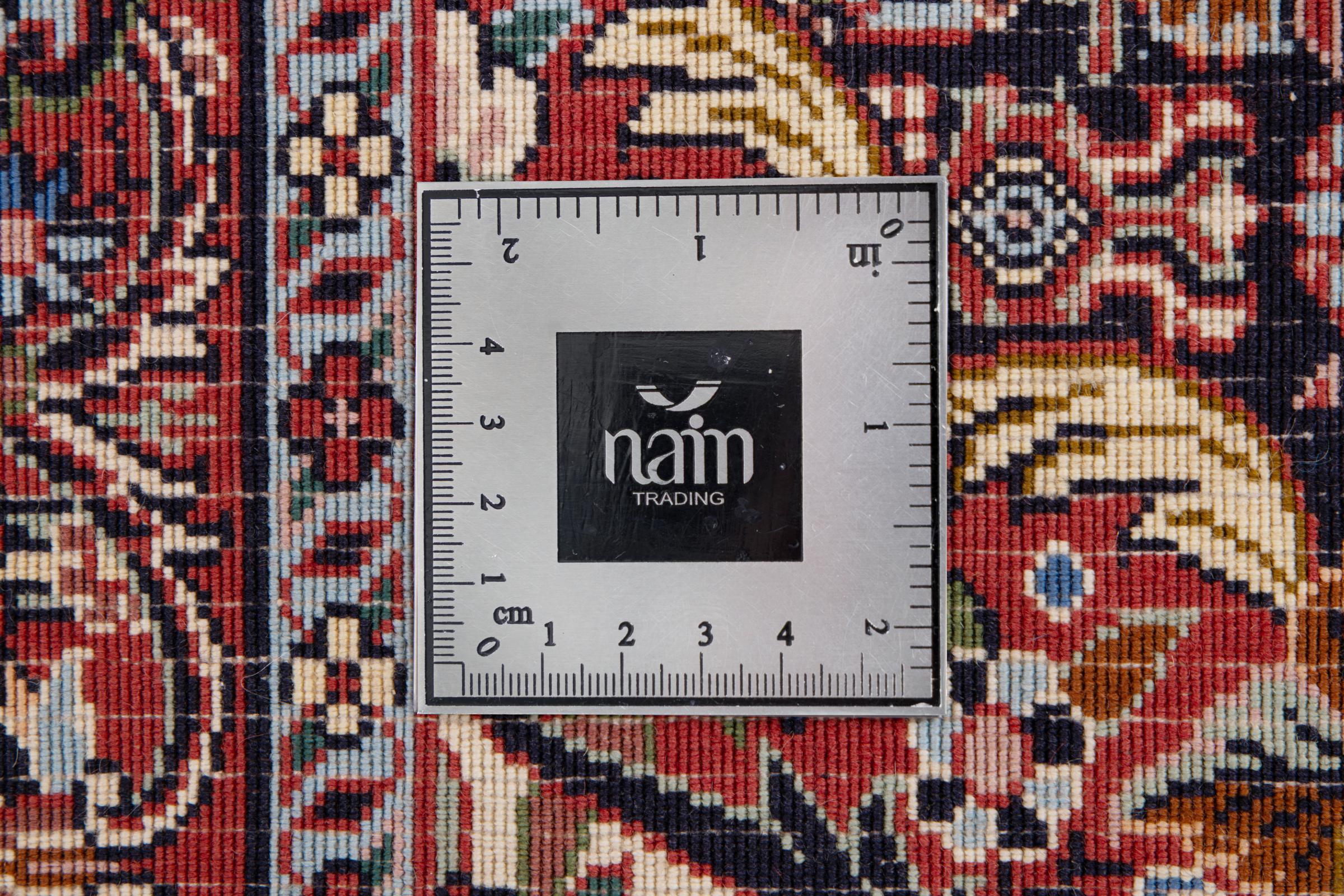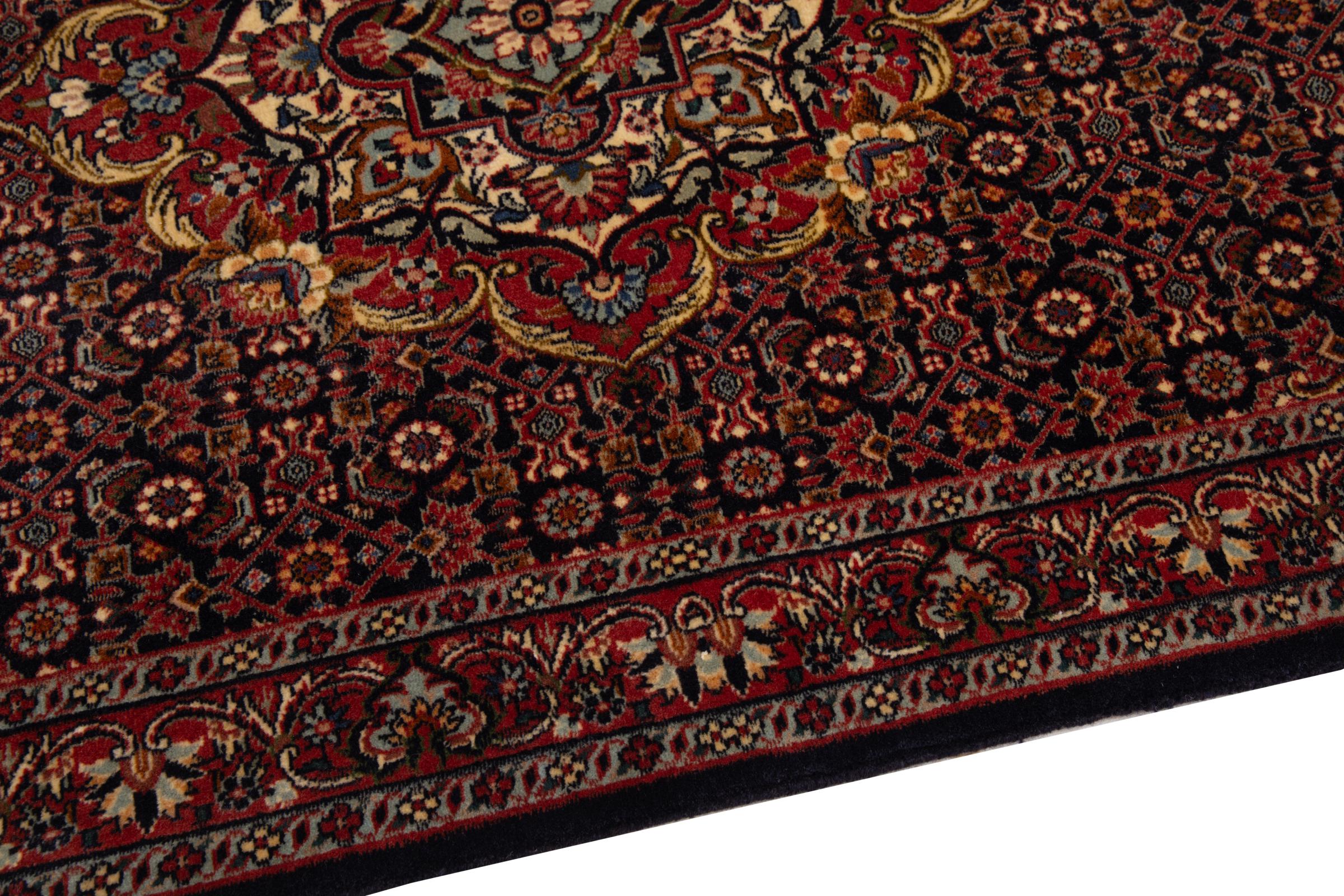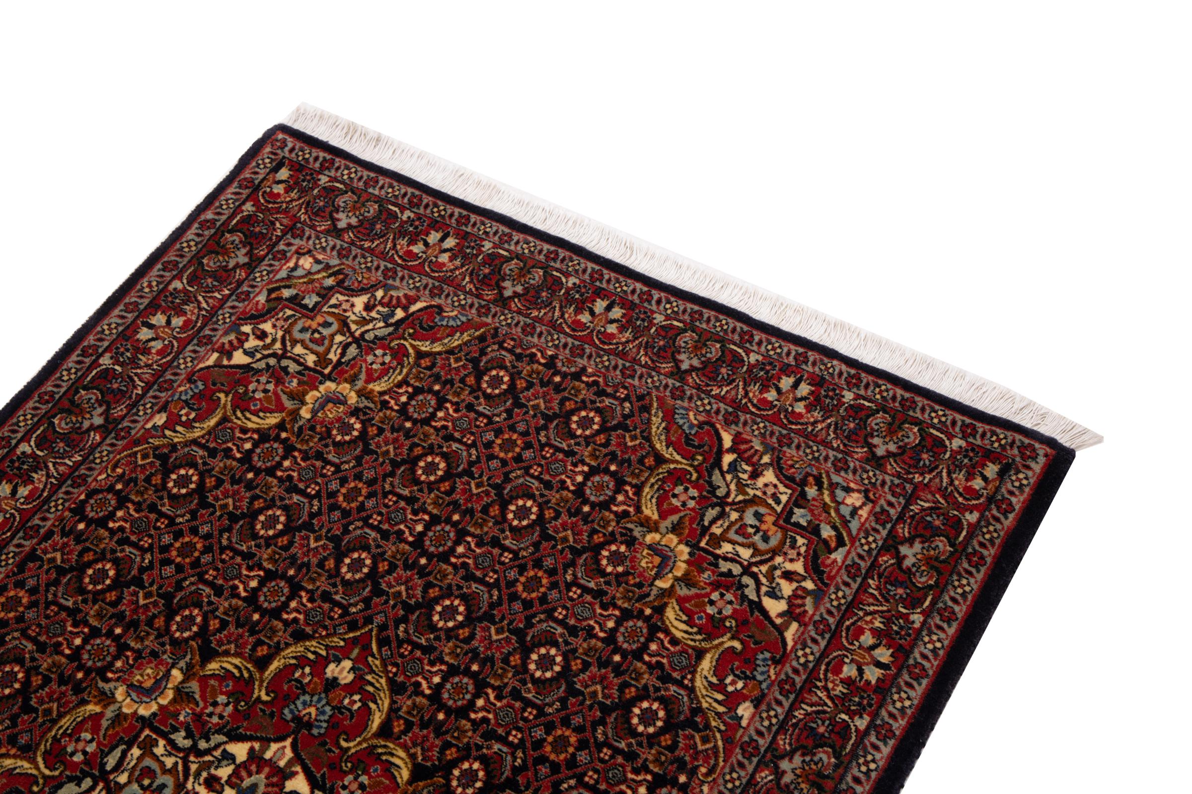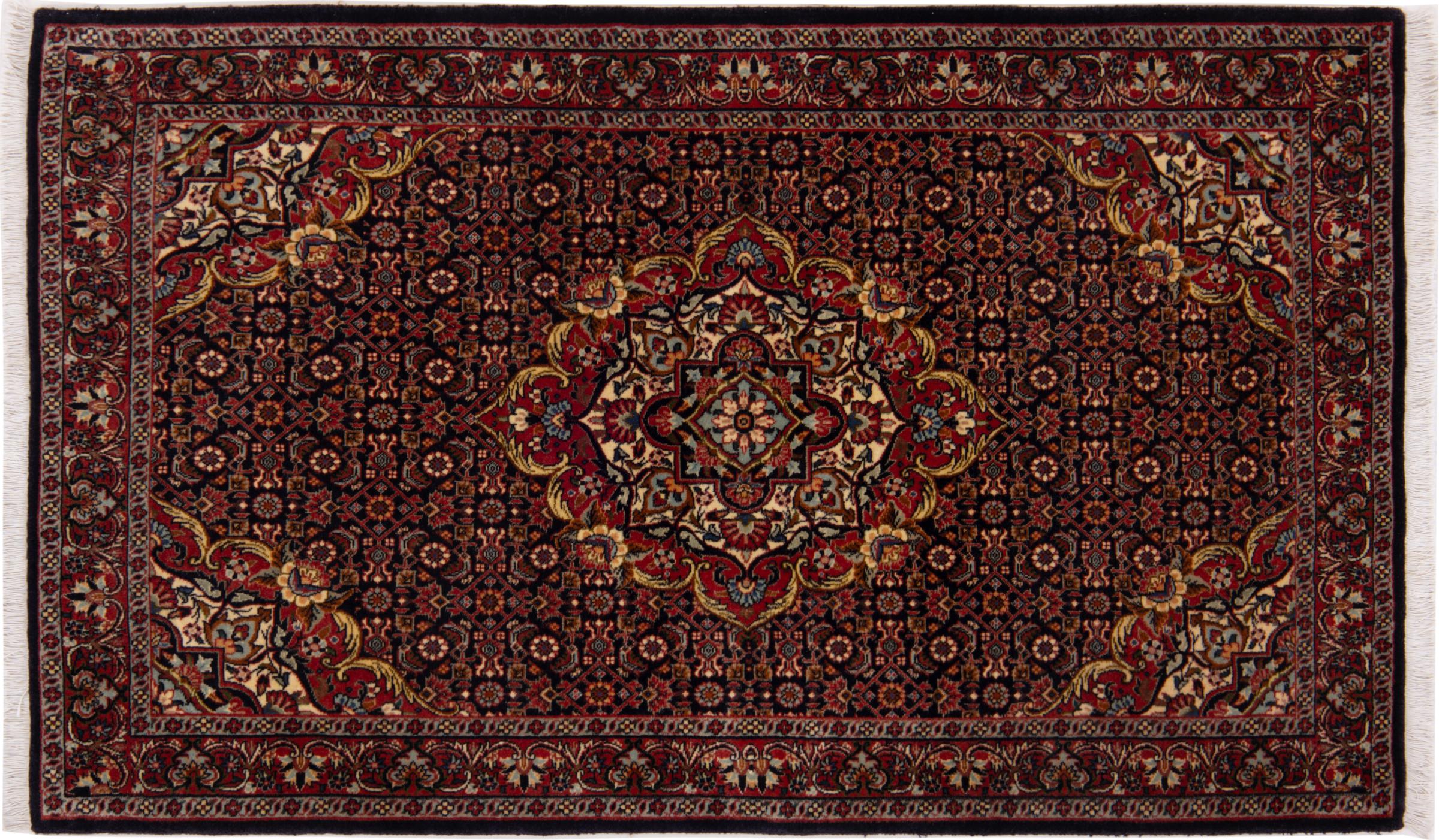 Dieser Perserteppich wurde in einer kurdischen Kleinstadt im westlichen Iran handgeknüpft. Der Bidjar-Teppich steht für hervorragende Qualität. Sein fester Flor besticht durch seine Kompaktheit und damit Verschleißfestigkeit. So wird die Wolle mit einem Kamm so fest zusammengedrückt, dass der Flor nahezu senkrecht nach oben steht. Gröbere Schmutzpartikel haben so kaum eine Chance einzudringen.