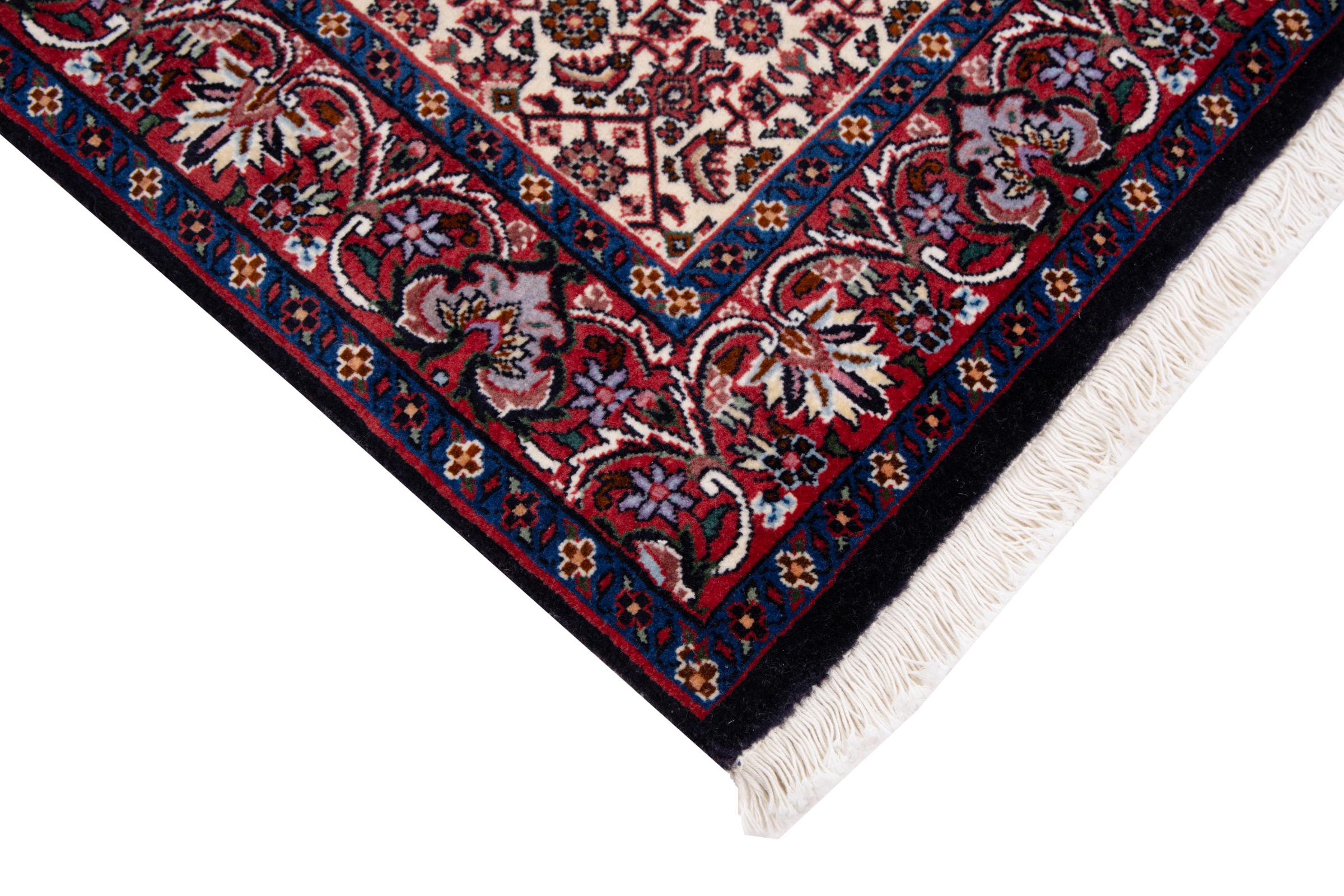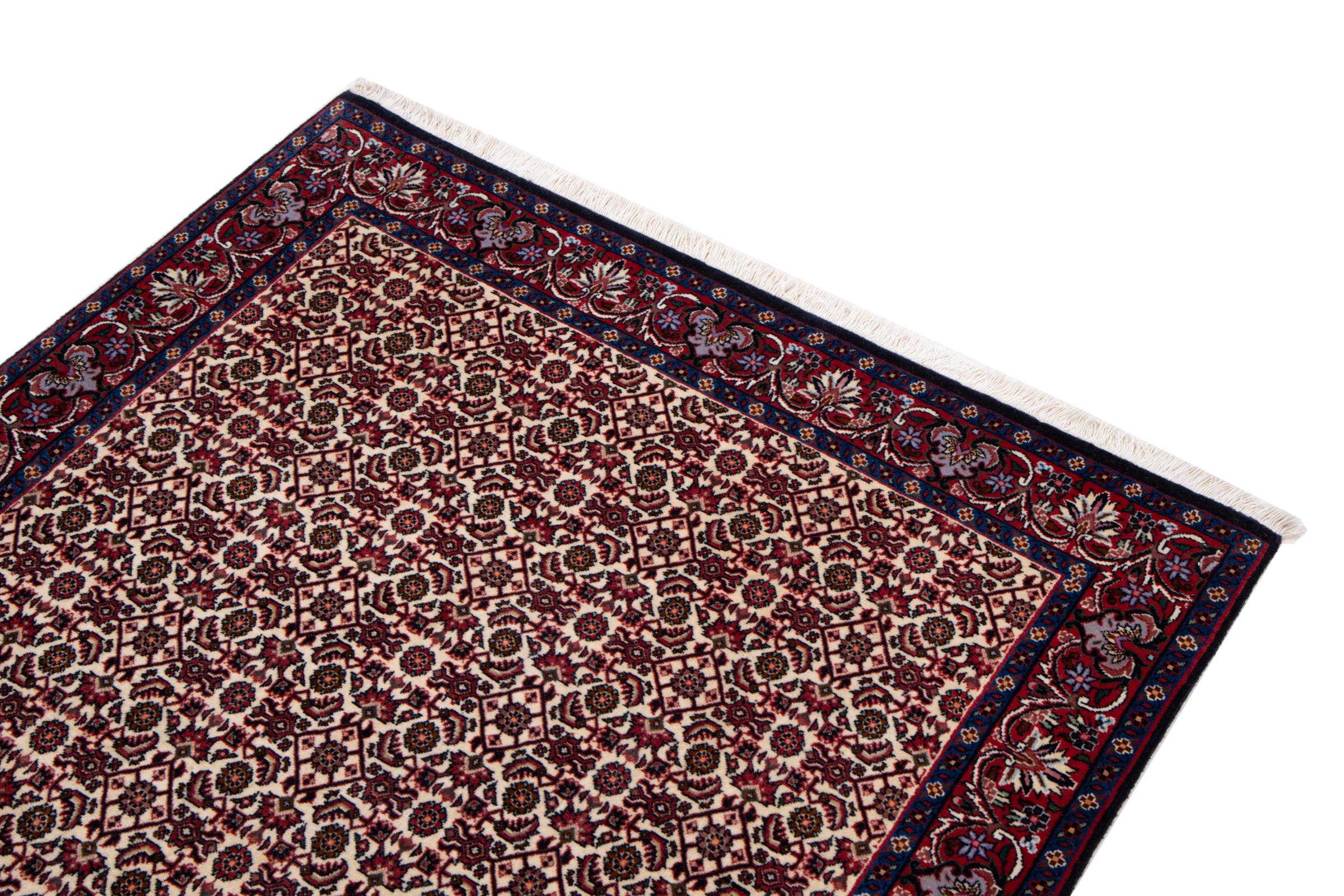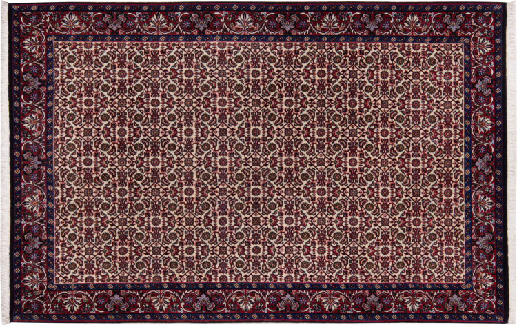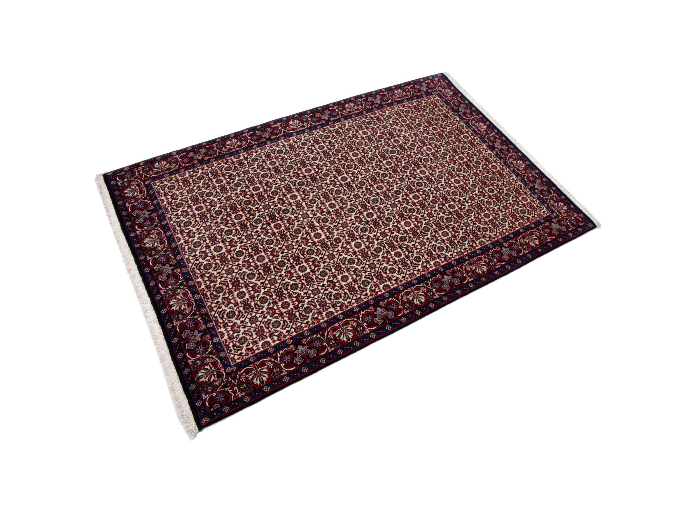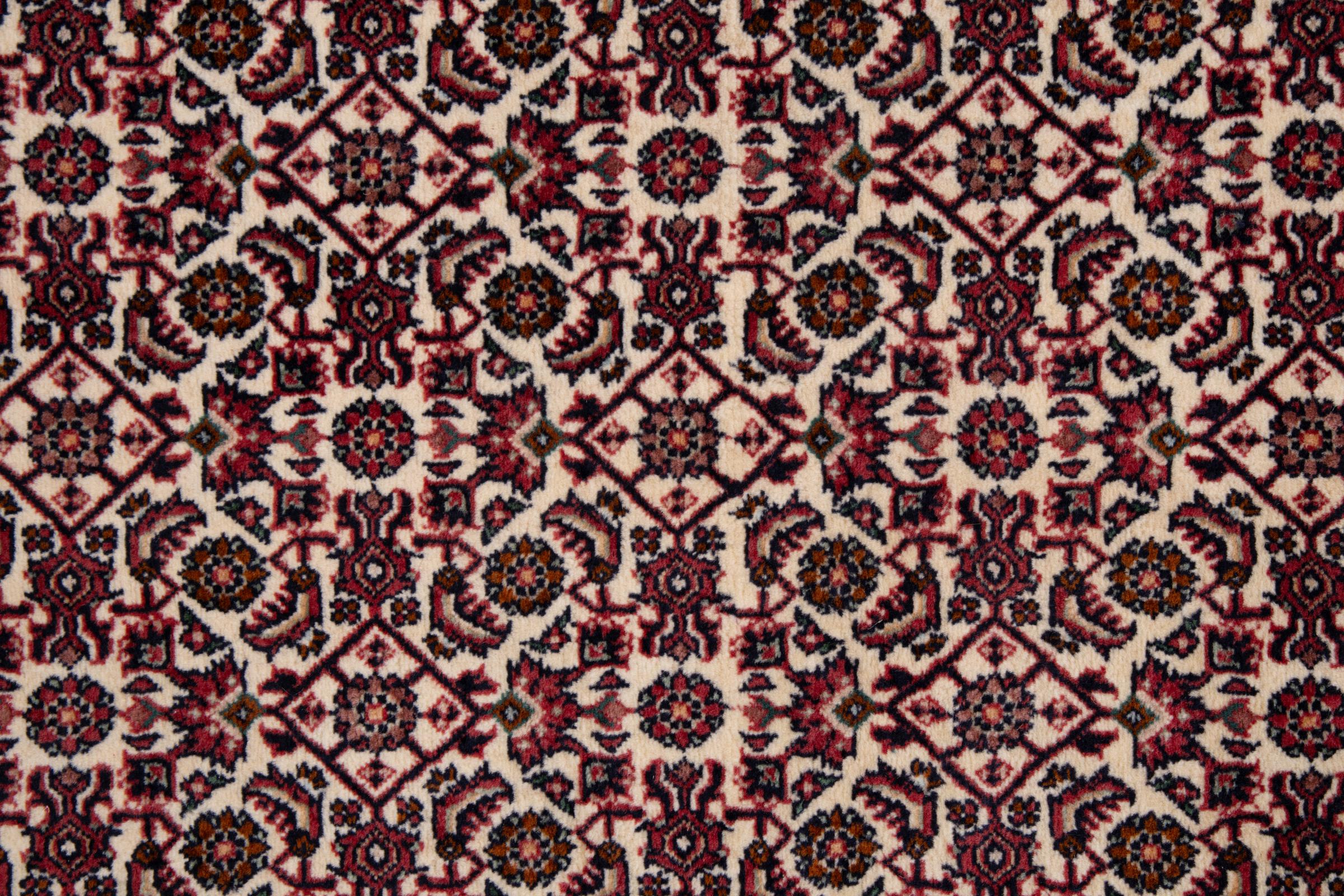 Dieser Perserteppich wurde in einer kurdischen Kleinstadt im westlichen Iran handgeknüpft. Der Bidjar-Teppich steht für hervorragende Qualität. Sein fester Flor besticht durch seine Kompaktheit und damit Verschleißfestigkeit. So wird die Wolle mit einem Kamm so fest zusammengedrückt, dass der Flor nahezu senkrecht nach oben steht. Gröbere Schmutzpartikel haben so kaum eine Chance einzudringen.