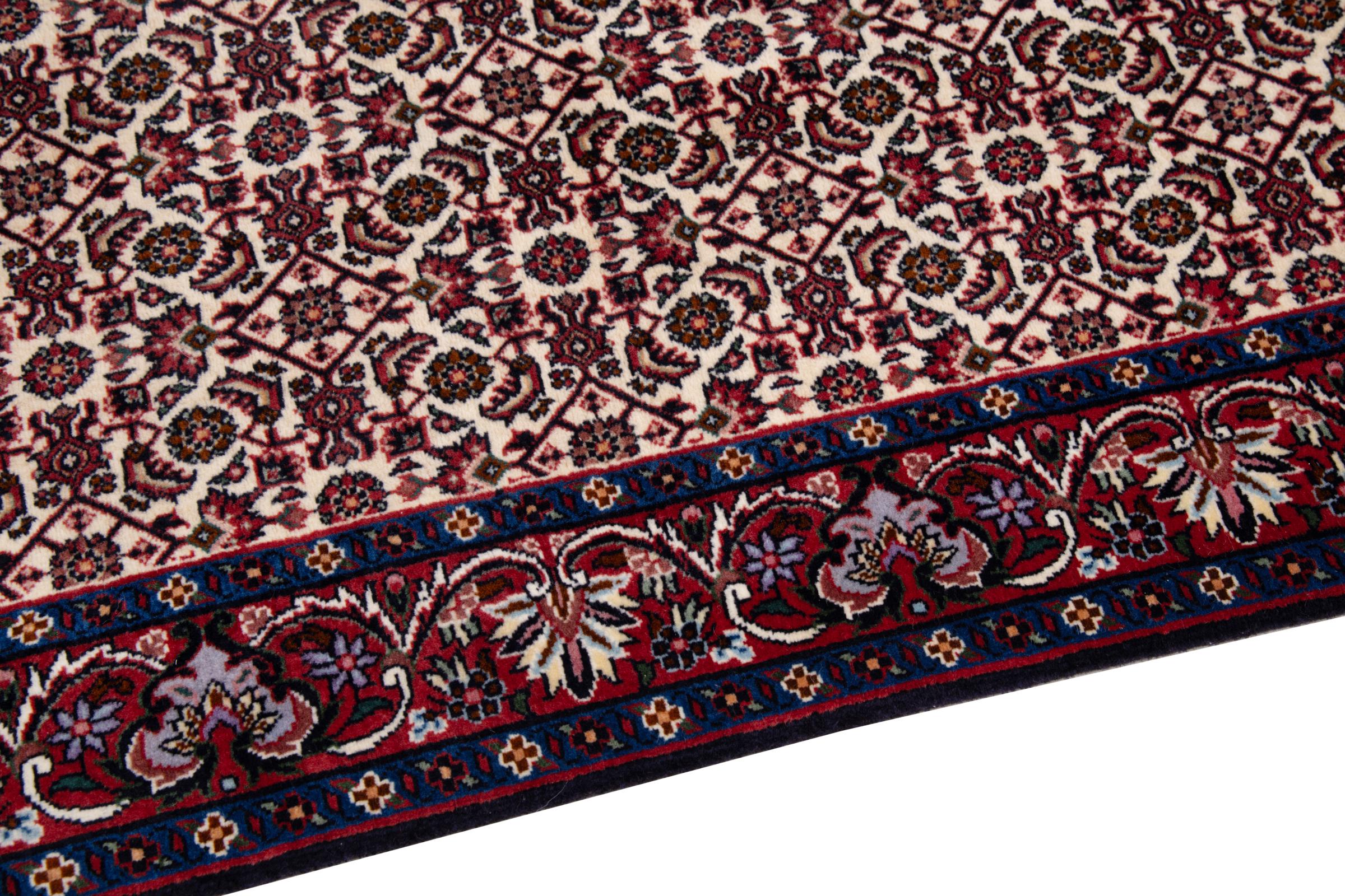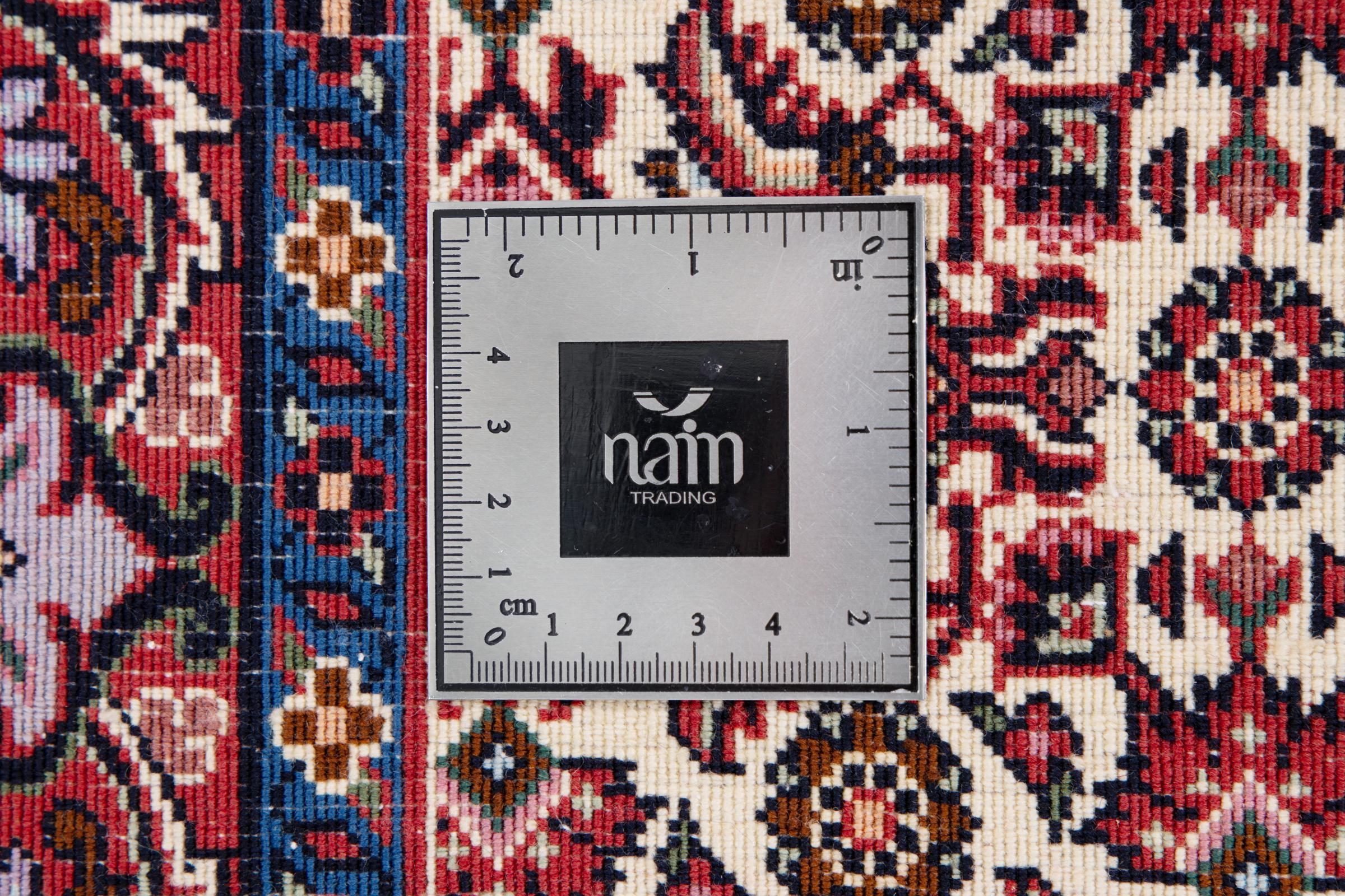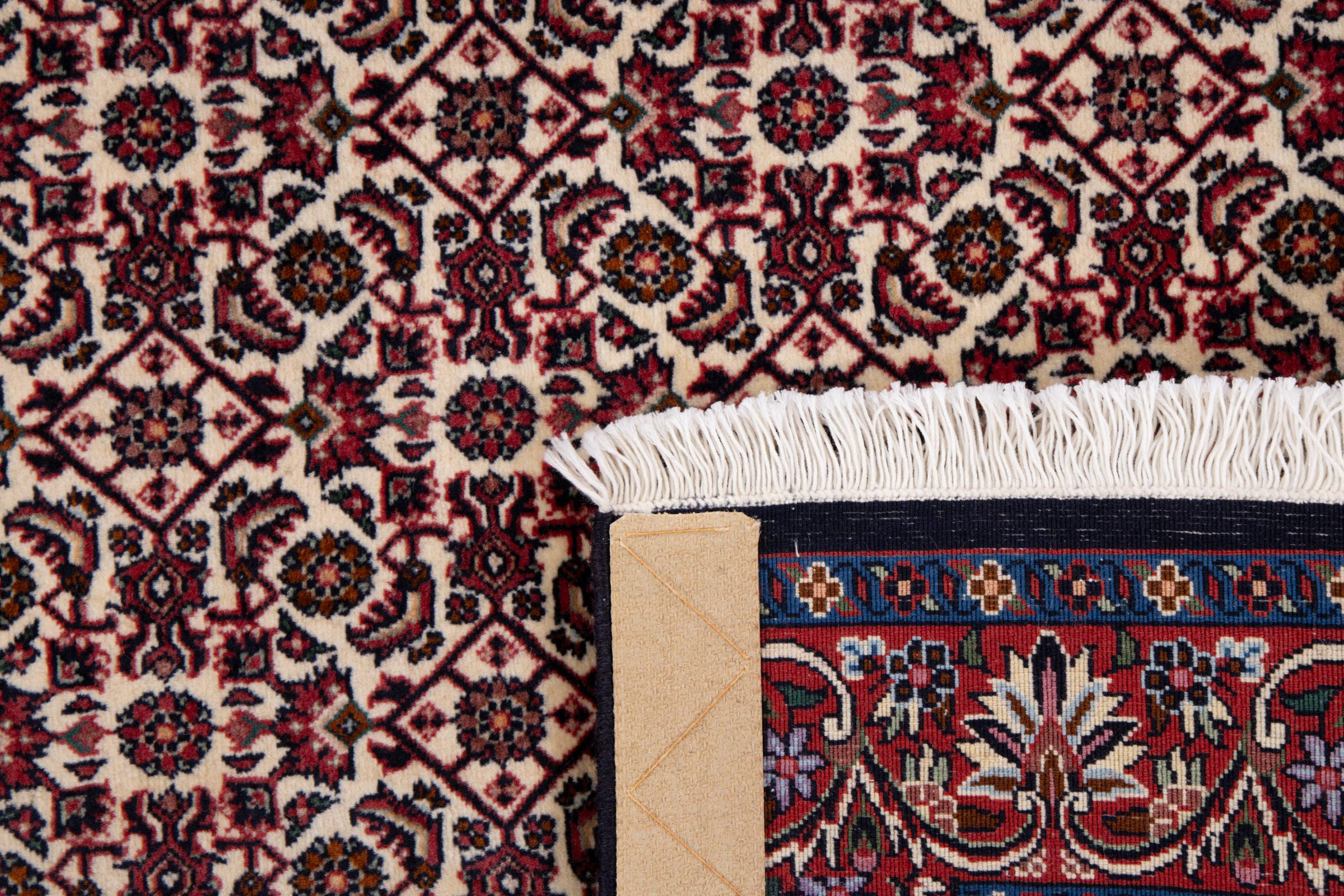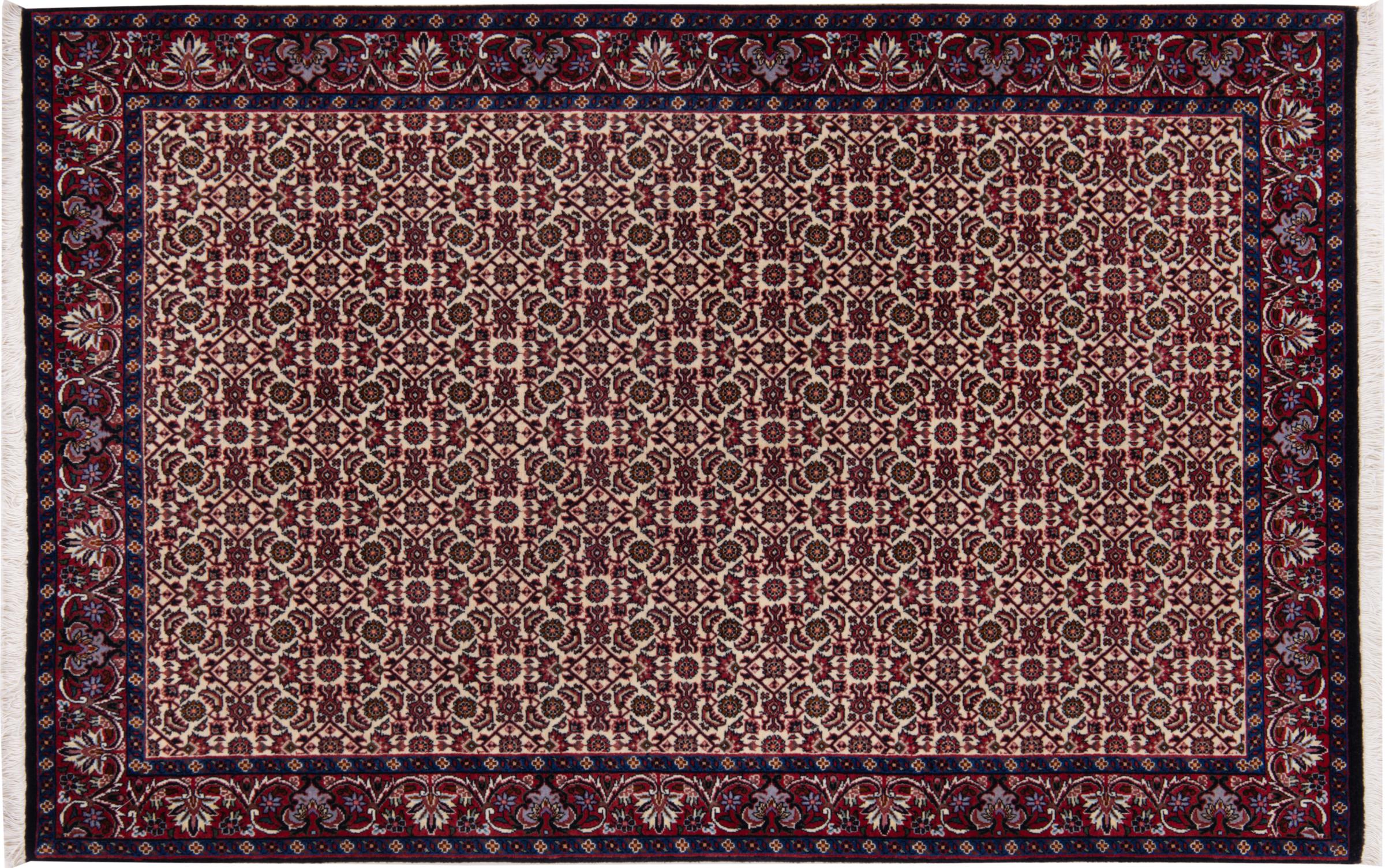 Dieser Perserteppich wurde in einer kurdischen Kleinstadt im westlichen Iran handgeknüpft. Der Bidjar-Teppich steht für hervorragende Qualität. Sein fester Flor besticht durch seine Kompaktheit und damit Verschleißfestigkeit. So wird die Wolle mit einem Kamm so fest zusammengedrückt, dass der Flor nahezu senkrecht nach oben steht. Gröbere Schmutzpartikel haben so kaum eine Chance einzudringen.