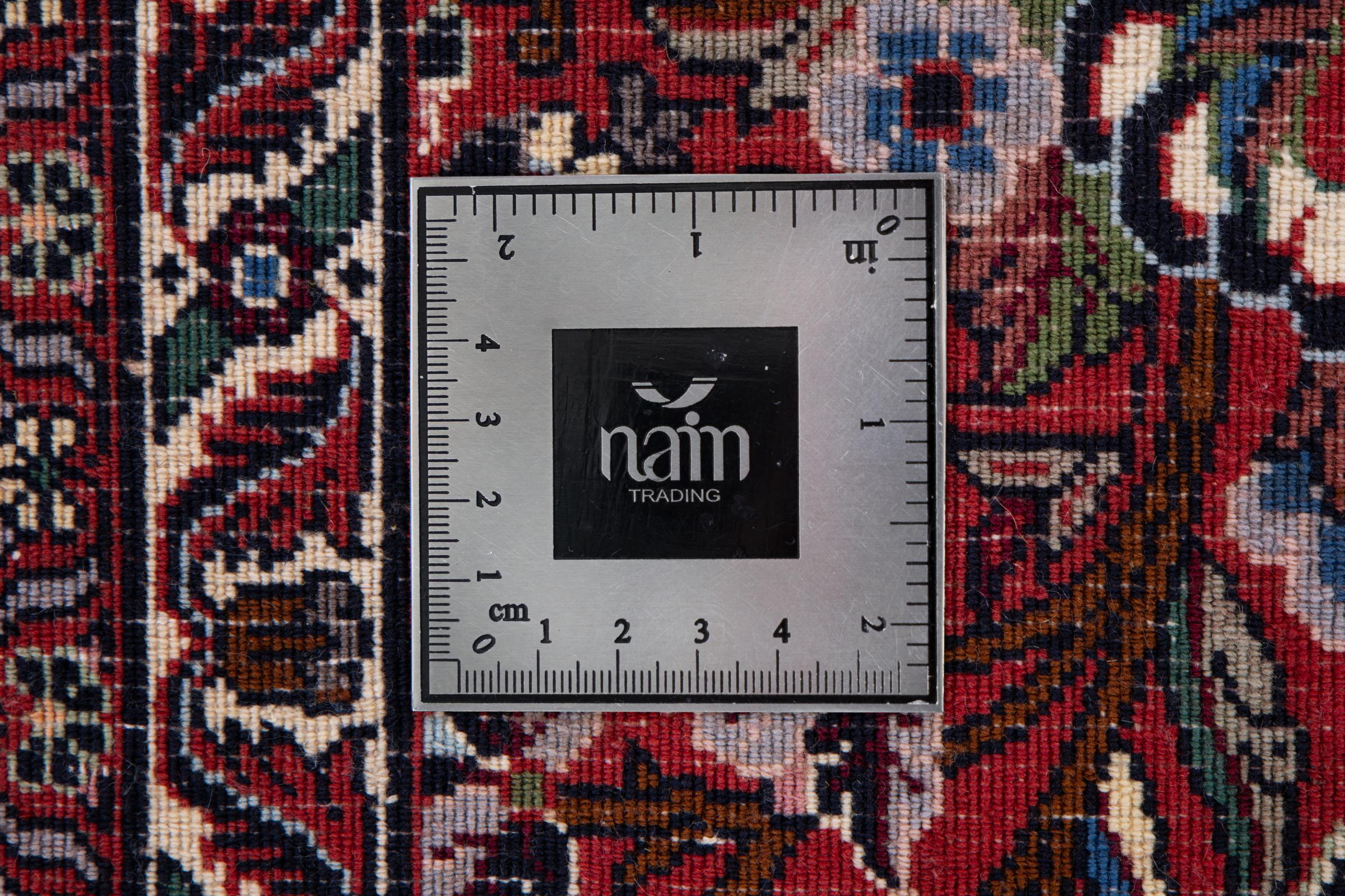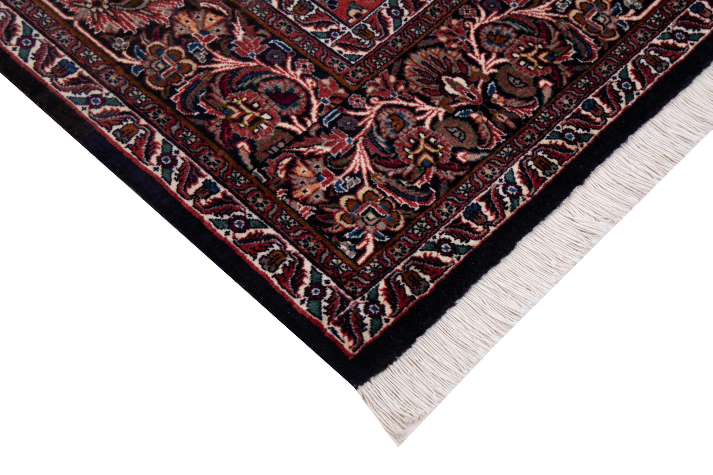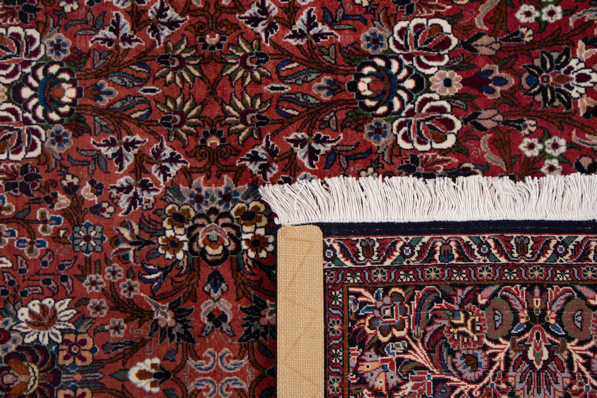 Dieser Perserteppich wurde in einer kurdischen Kleinstadt im westlichen Iran handgeknüpft. Der Bidjar-Teppich steht für hervorragende Qualität. Sein fester Flor besticht durch seine Kompaktheit und damit Verschleißfestigkeit. So wird die Wolle mit einem Kamm so fest zusammengedrückt, dass der Flor nahezu senkrecht nach oben steht. Gröbere Schmutzpartikel haben so kaum eine Chance einzudringen.