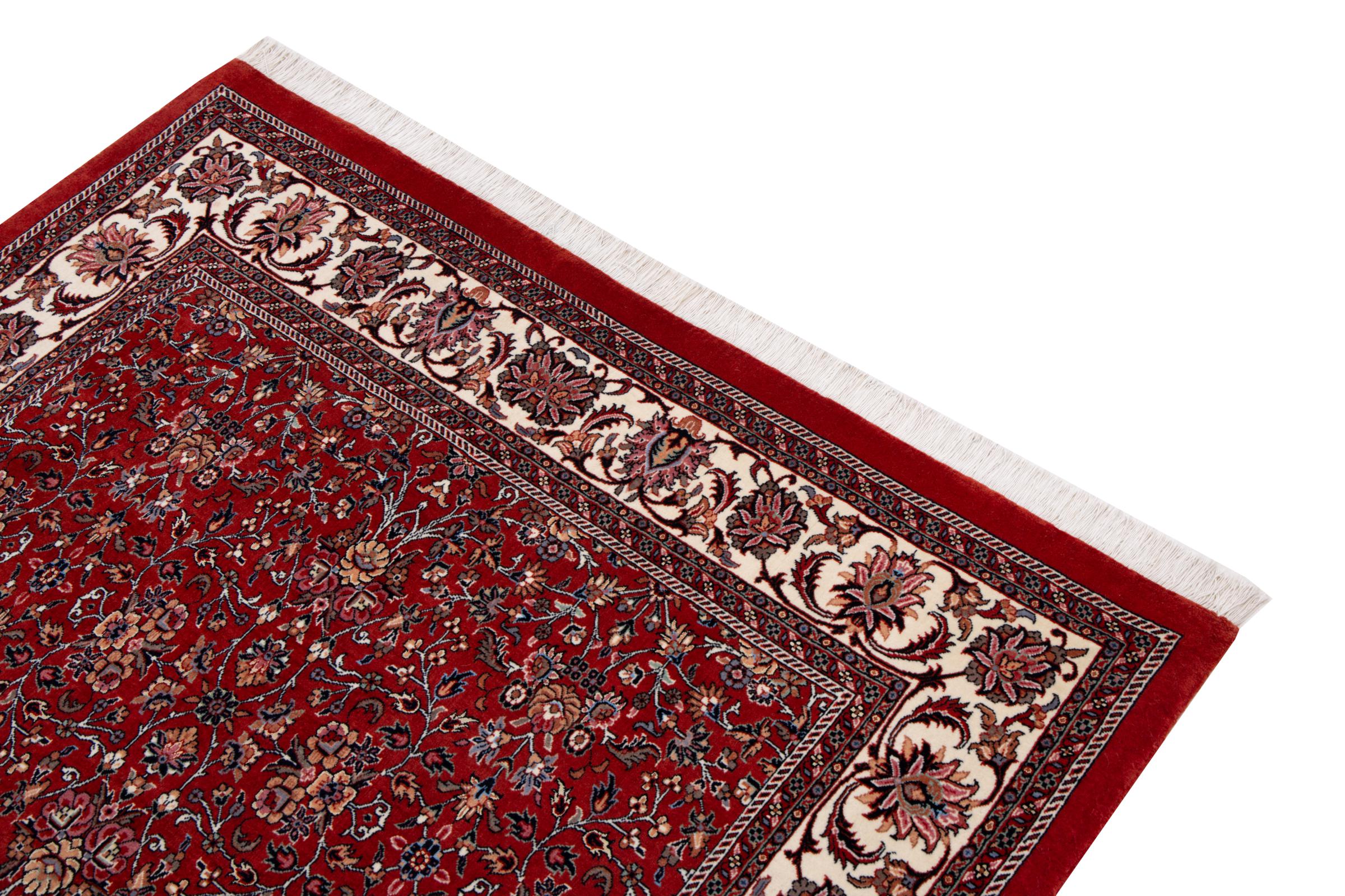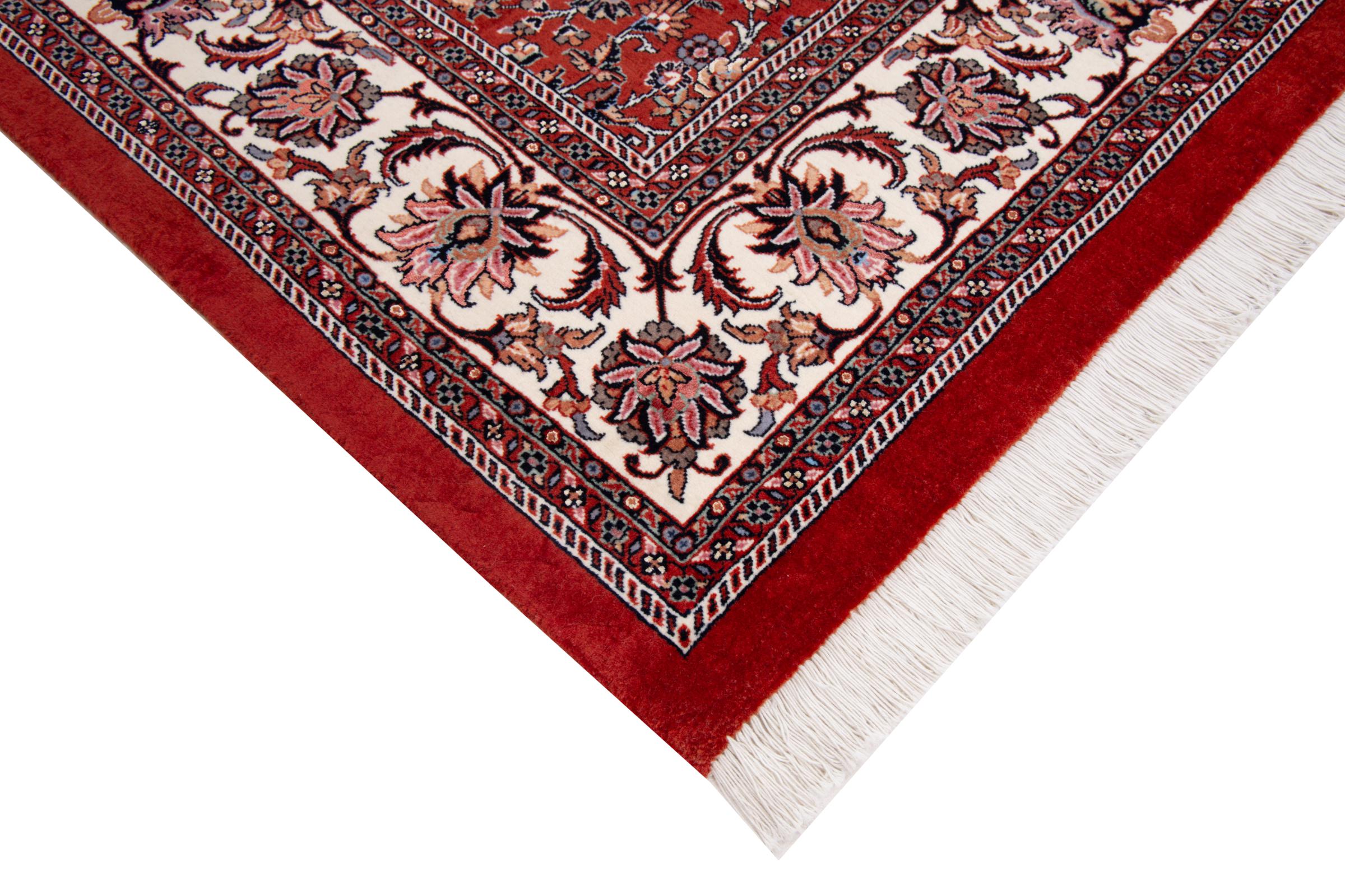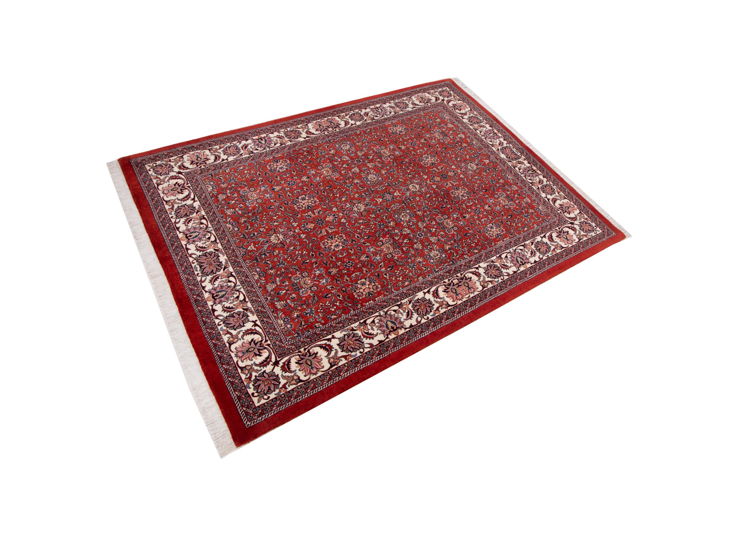 Dieser Perserteppich wurde in einer kurdischen Kleinstadt im westlichen Iran handgeknüpft. Der Bidjar-Teppich steht für hervorragende Qualität. Sein fester Flor besticht durch seine Kompaktheit und damit Verschleißfestigkeit. So wird die Wolle mit einem Kamm so fest zusammengedrückt, dass der Flor nahezu senkrecht nach oben steht. Gröbere Schmutzpartikel haben so kaum eine Chance einzudringen.