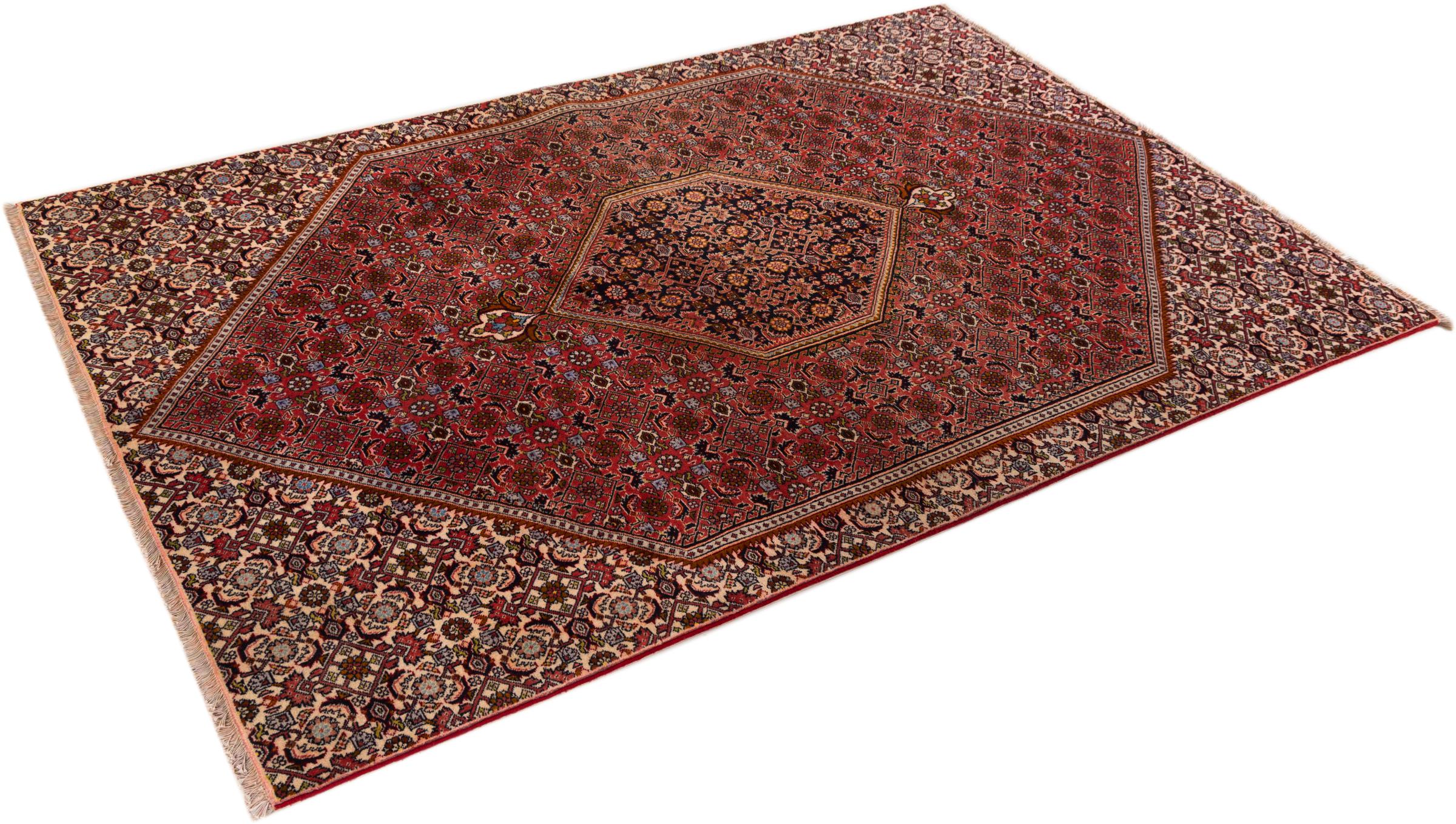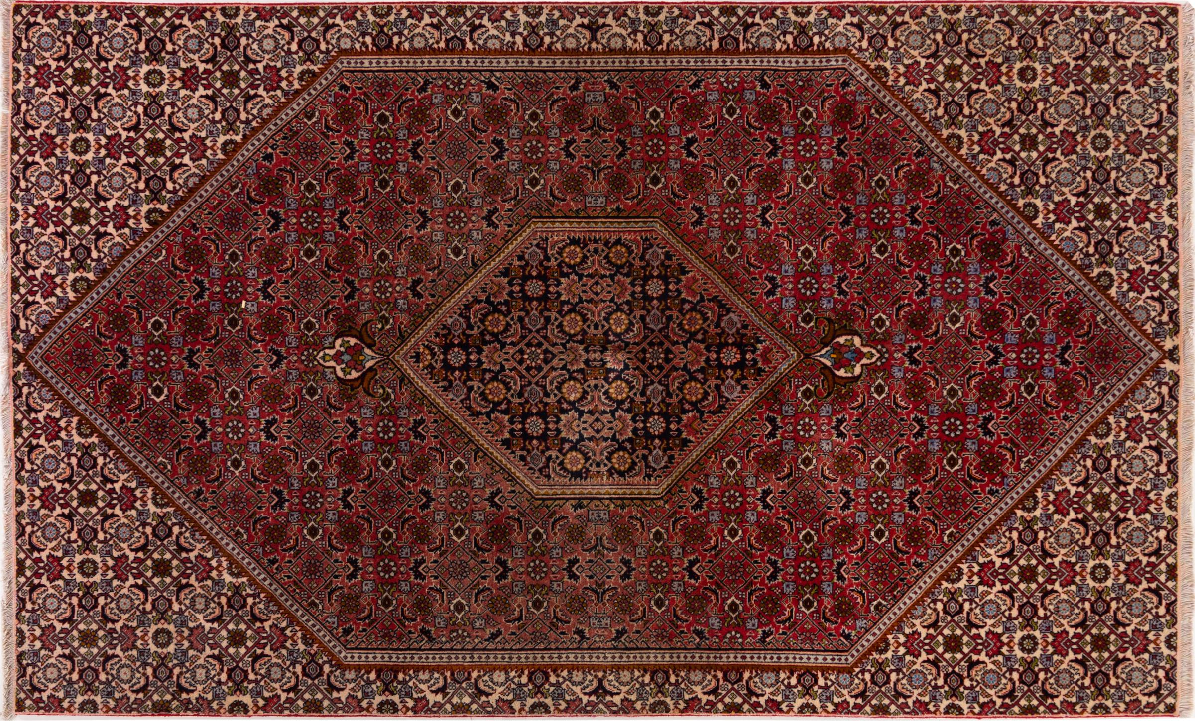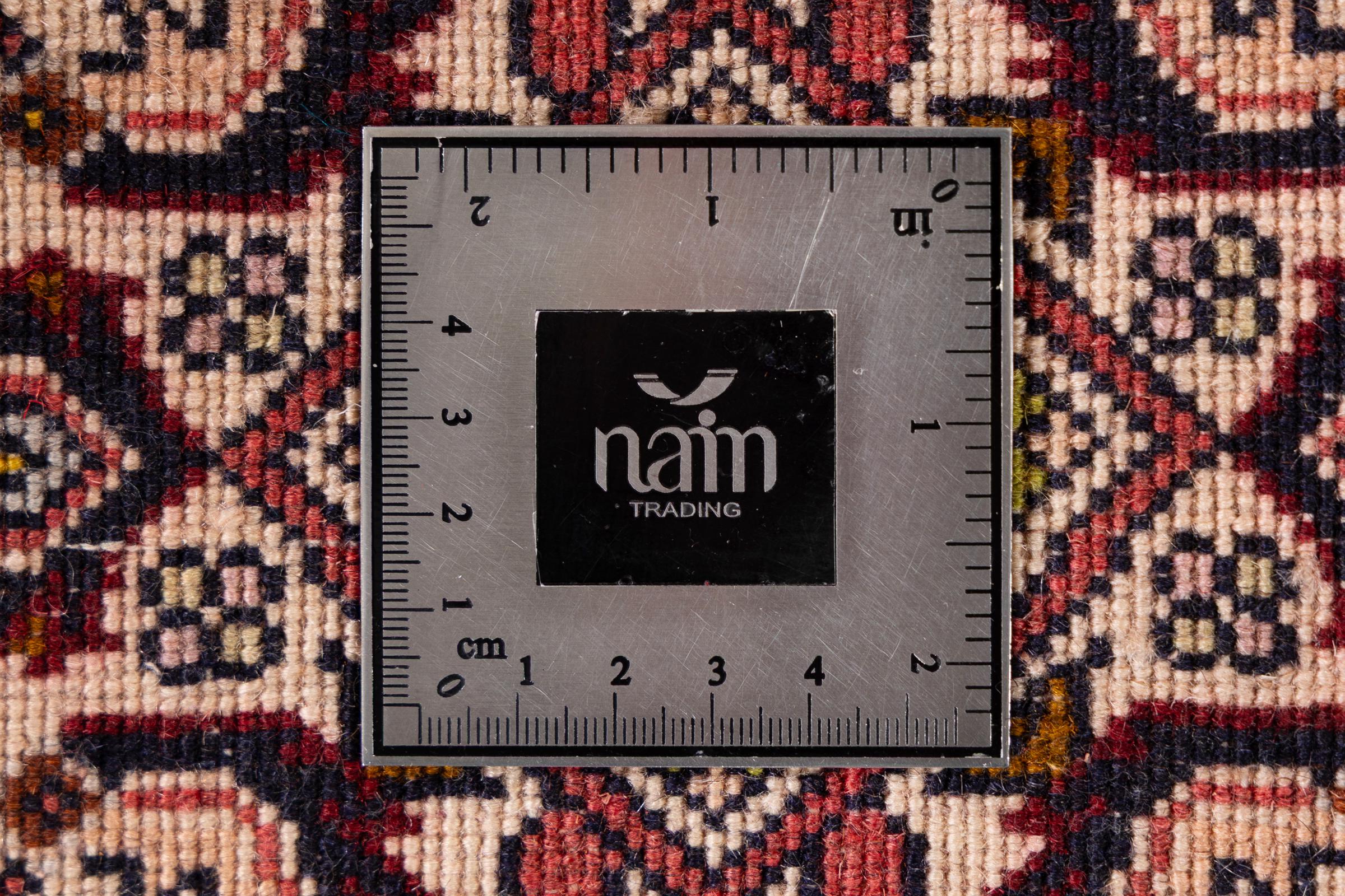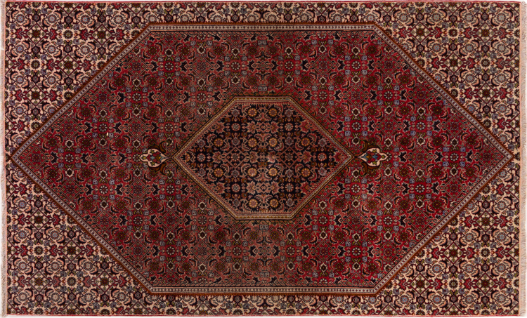 Dieser Perserteppich wurde in einer kurdischen Kleinstadt im westlichen Iran handgeknüpft. Der Bidjar-Teppich steht für hervorragende Qualität. Sein fester Flor besticht durch seine Kompaktheit und damit Verschleißfestigkeit. So wird die Wolle mit einem Kamm so fest zusammengedrückt, dass der Flor nahezu senkrecht nach oben steht. Gröbere Schmutzpartikel haben so kaum eine Chance einzudringen.