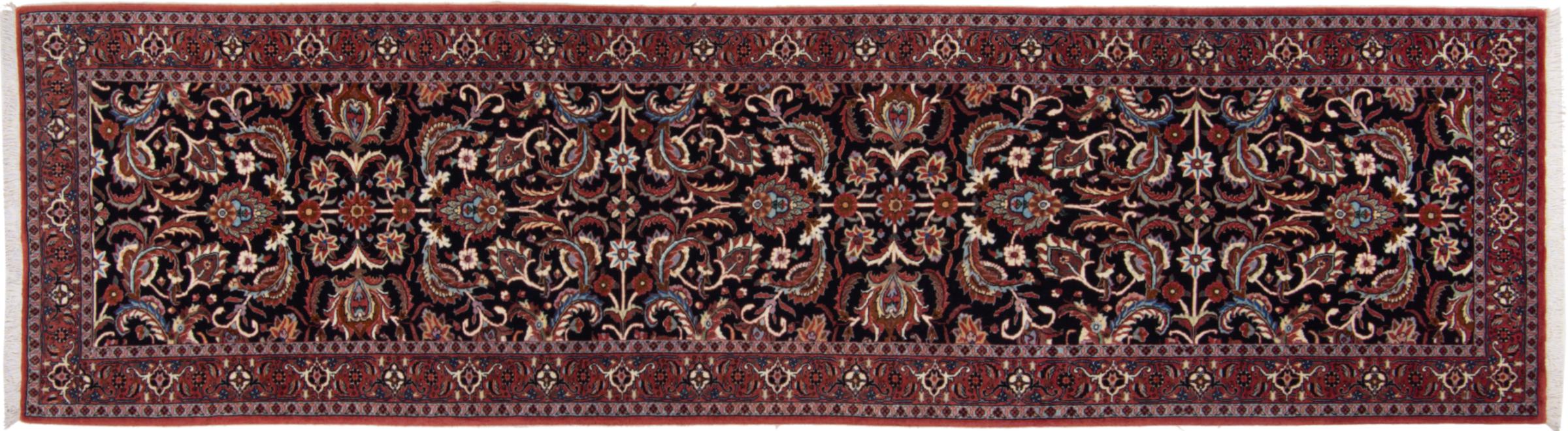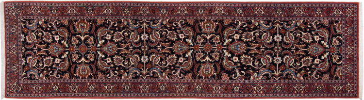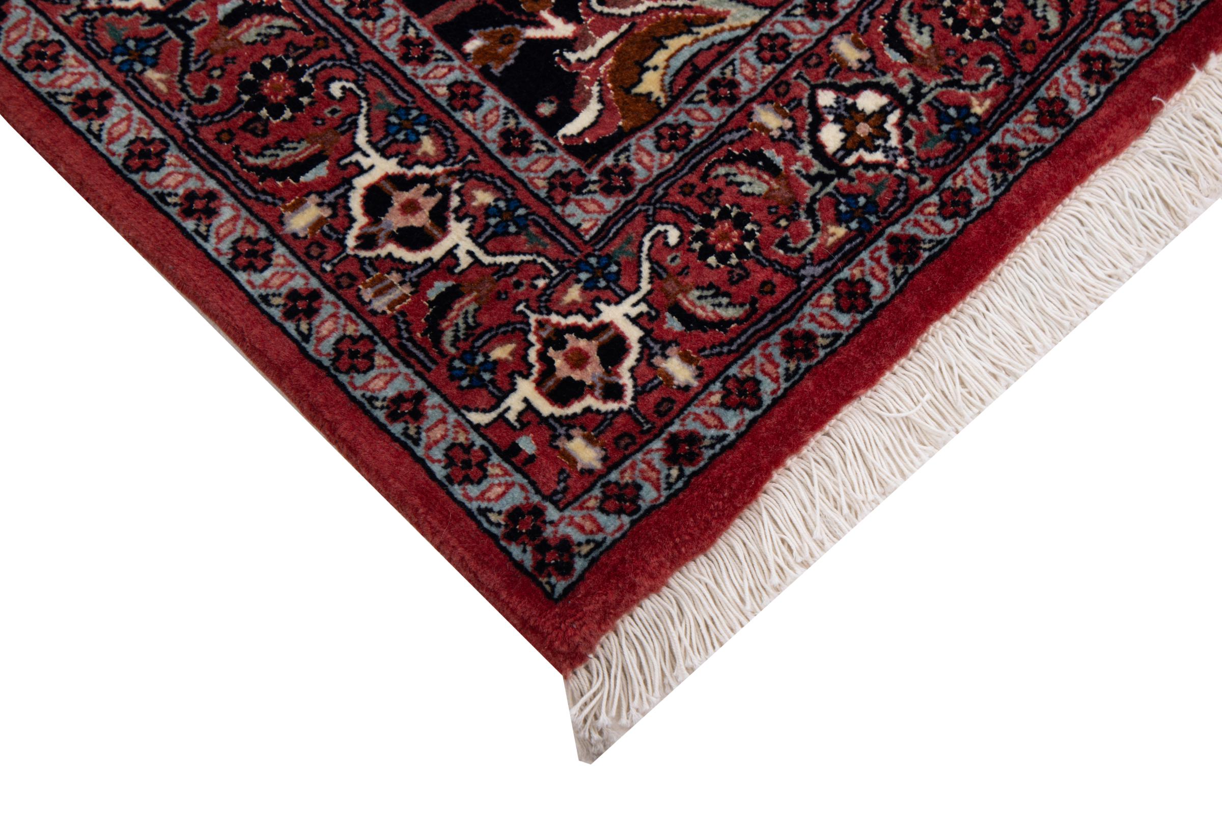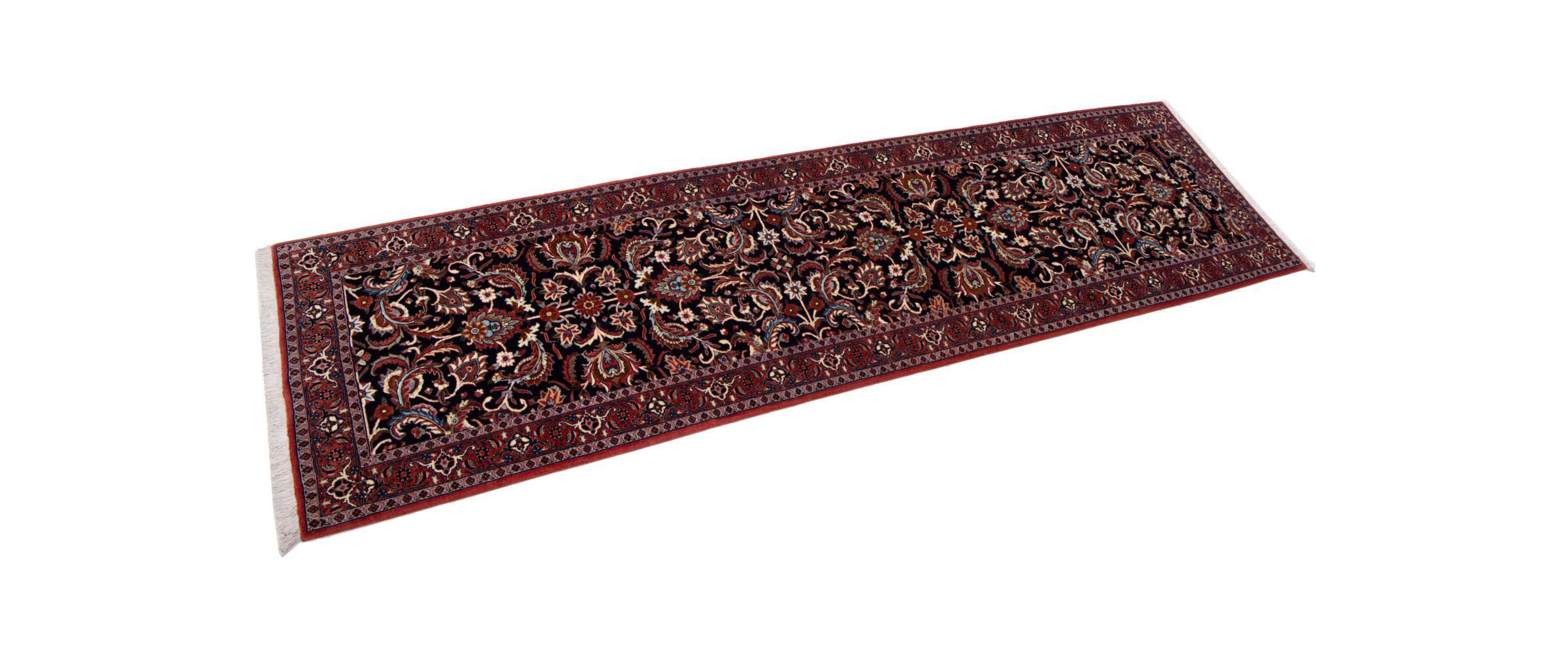 Dieser Perserteppich wurde in einer kurdischen Kleinstadt im westlichen Iran handgeknüpft. Der Bidjar-Teppich steht für hervorragende Qualität. Sein fester Flor besticht durch seine Kompaktheit und damit Verschleißfestigkeit. So wird die Wolle mit einem Kamm so fest zusammengedrückt, dass der Flor nahezu senkrecht nach oben steht. Gröbere Schmutzpartikel haben so kaum eine Chance einzudringen.