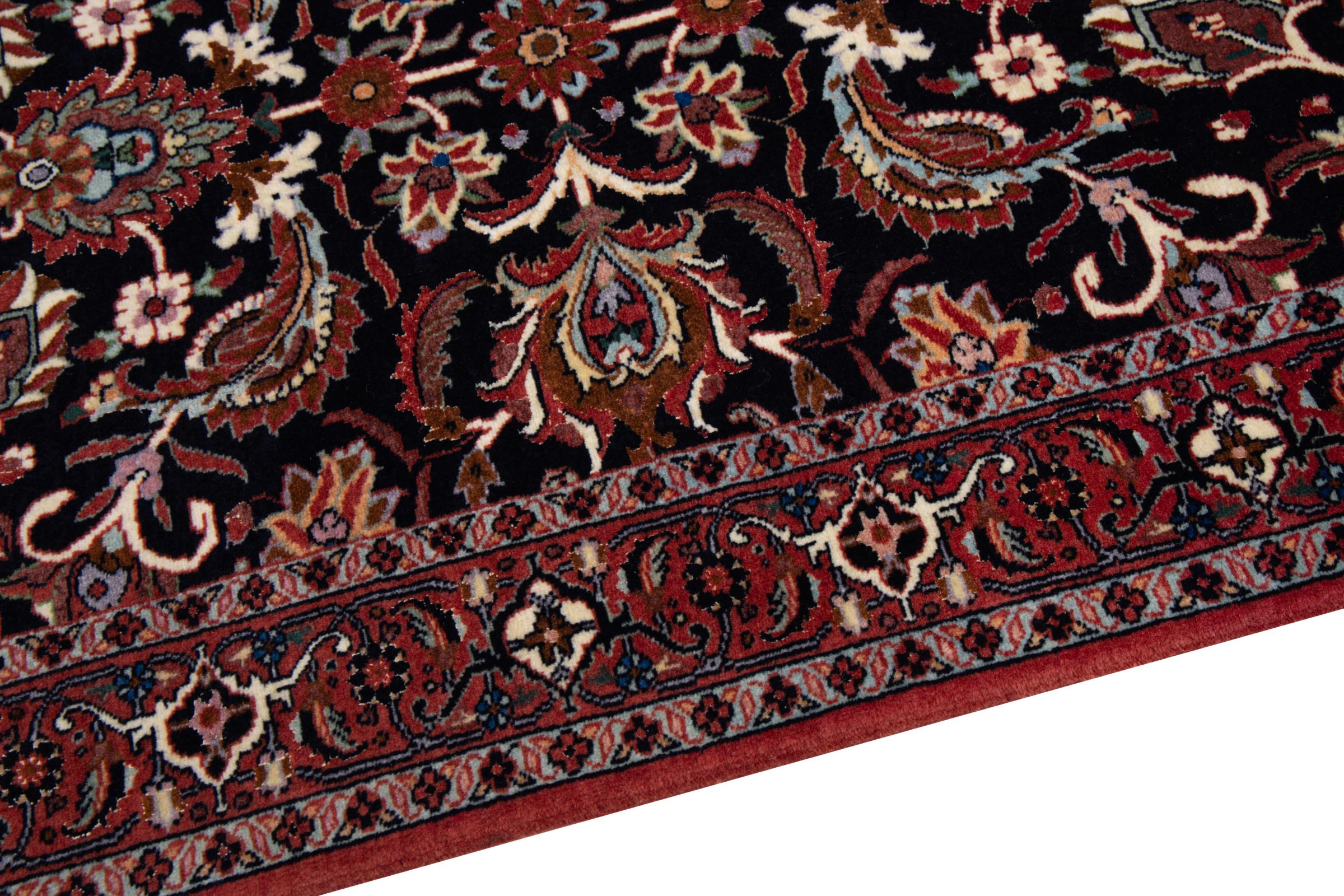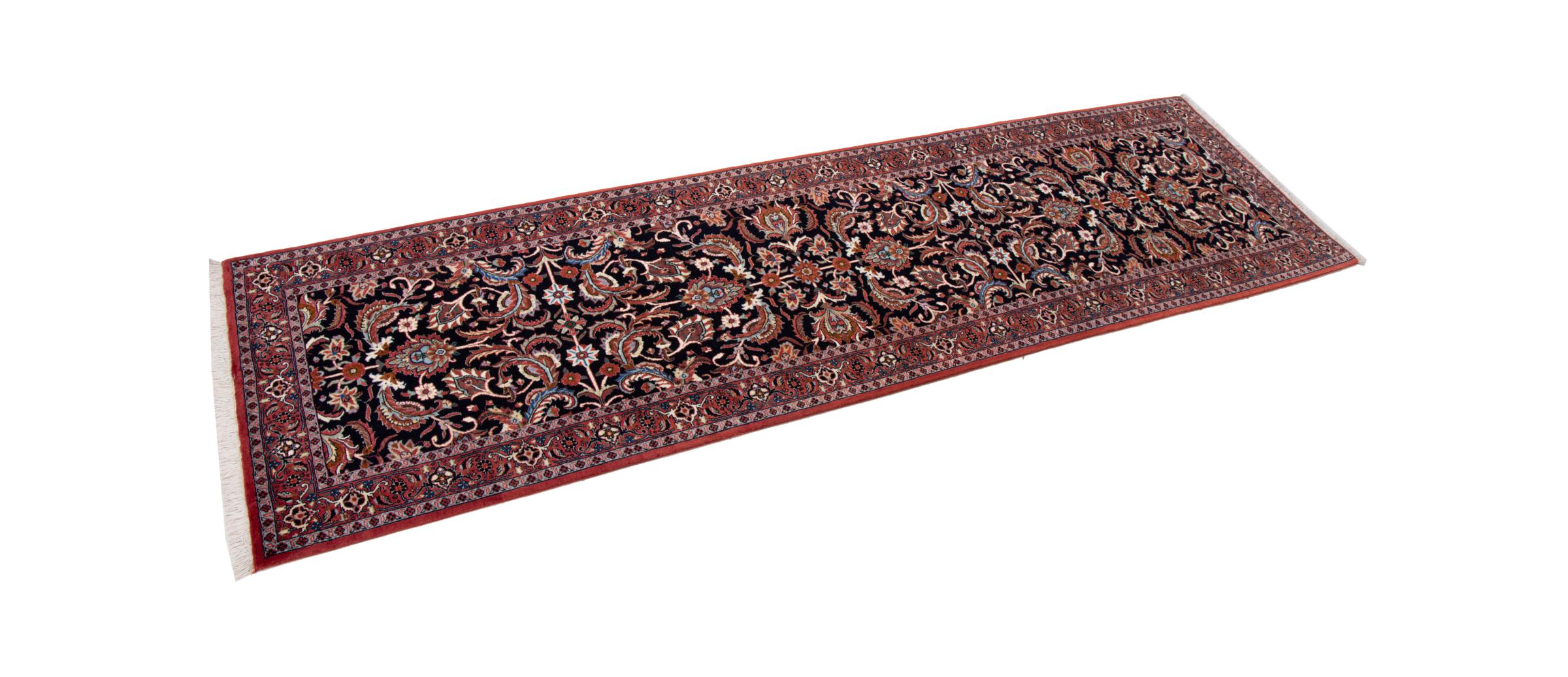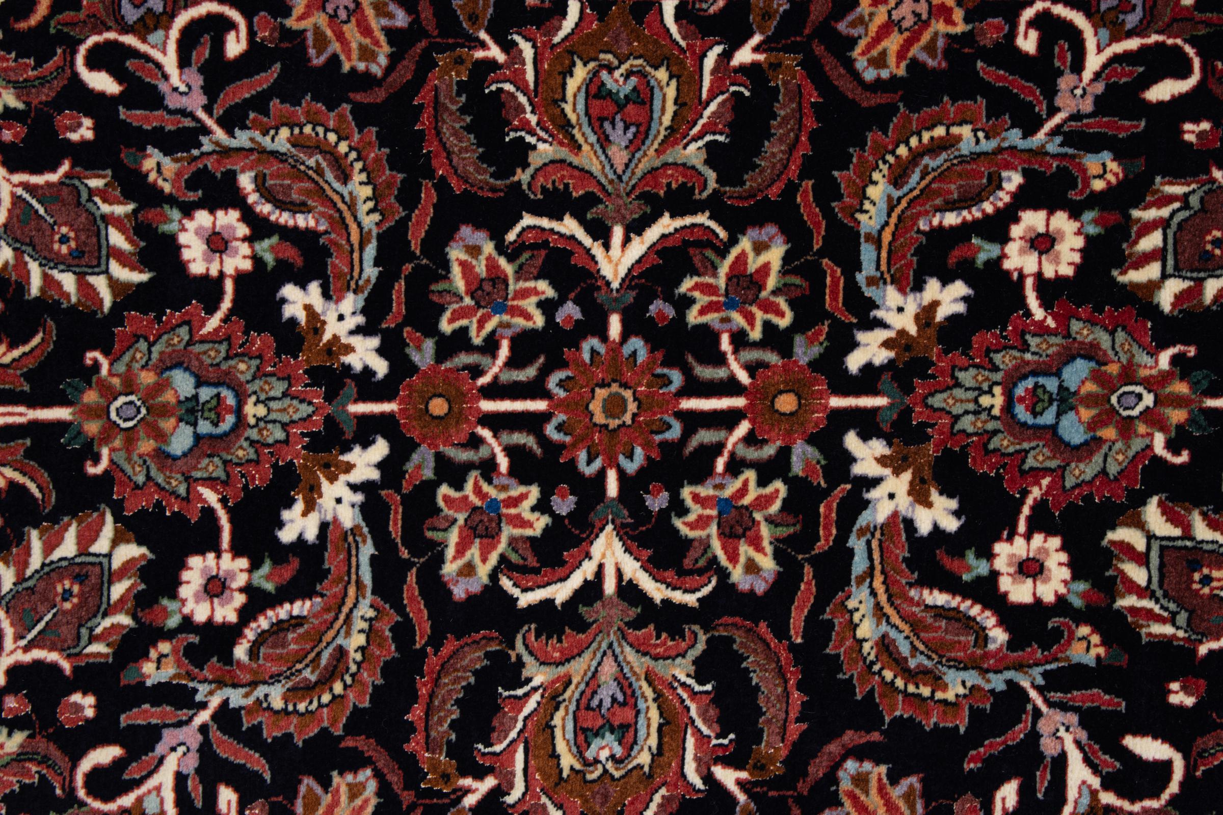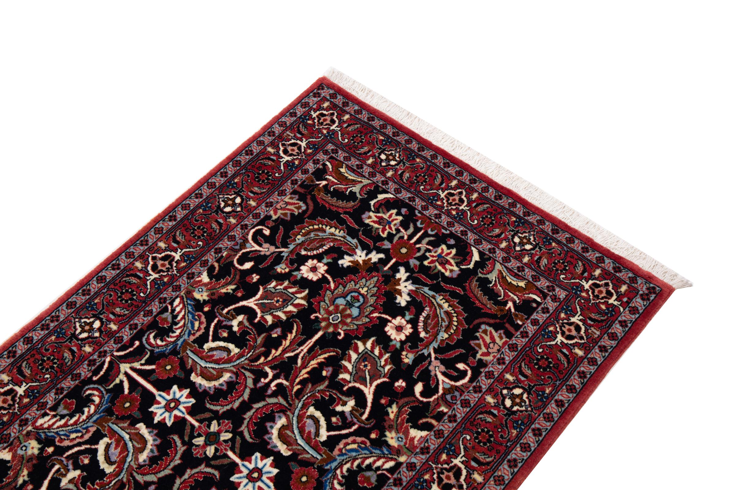 Dieser Perserteppich wurde in einer kurdischen Kleinstadt im westlichen Iran handgeknüpft. Der Bidjar-Teppich steht für hervorragende Qualität. Sein fester Flor besticht durch seine Kompaktheit und damit Verschleißfestigkeit. So wird die Wolle mit einem Kamm so fest zusammengedrückt, dass der Flor nahezu senkrecht nach oben steht. Gröbere Schmutzpartikel haben so kaum eine Chance einzudringen.
