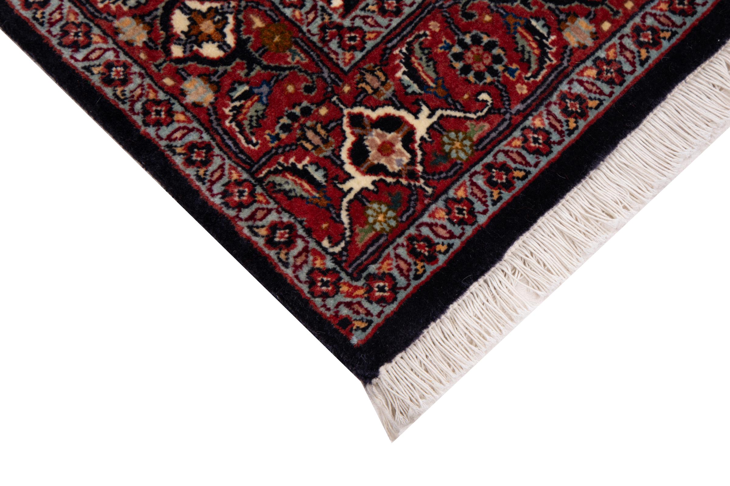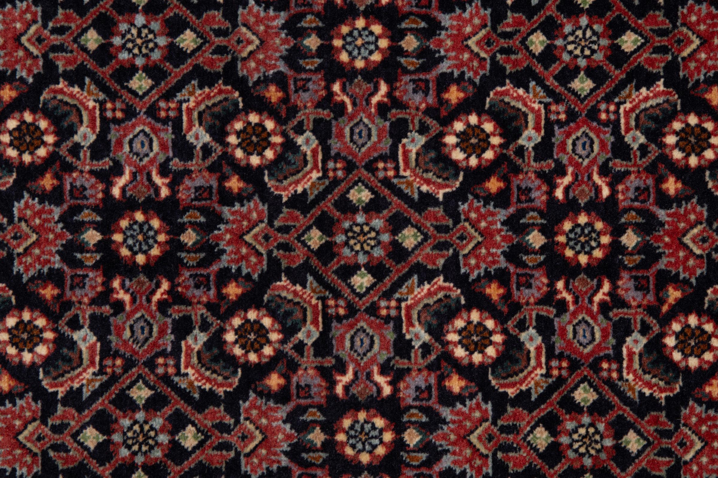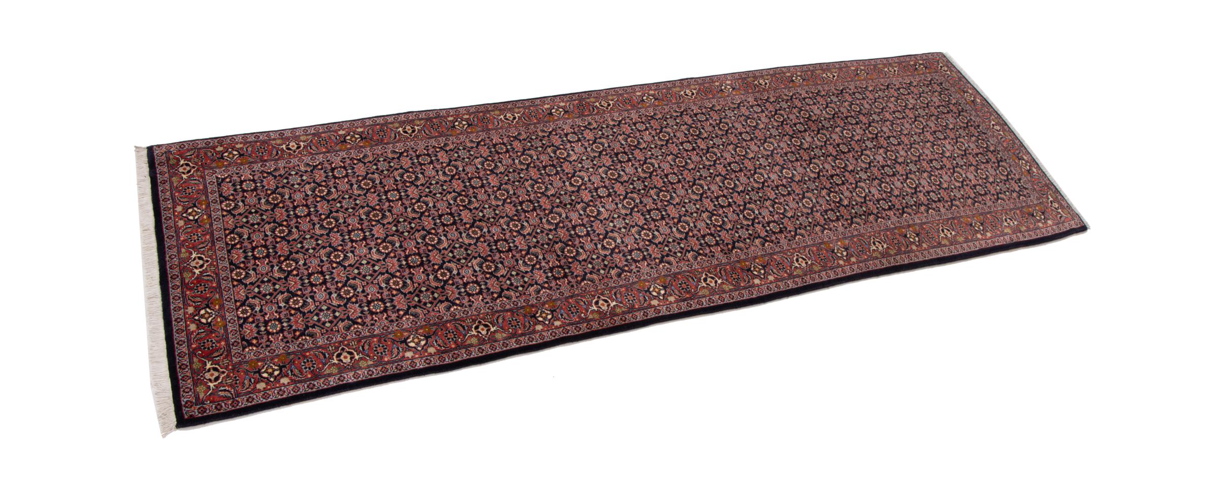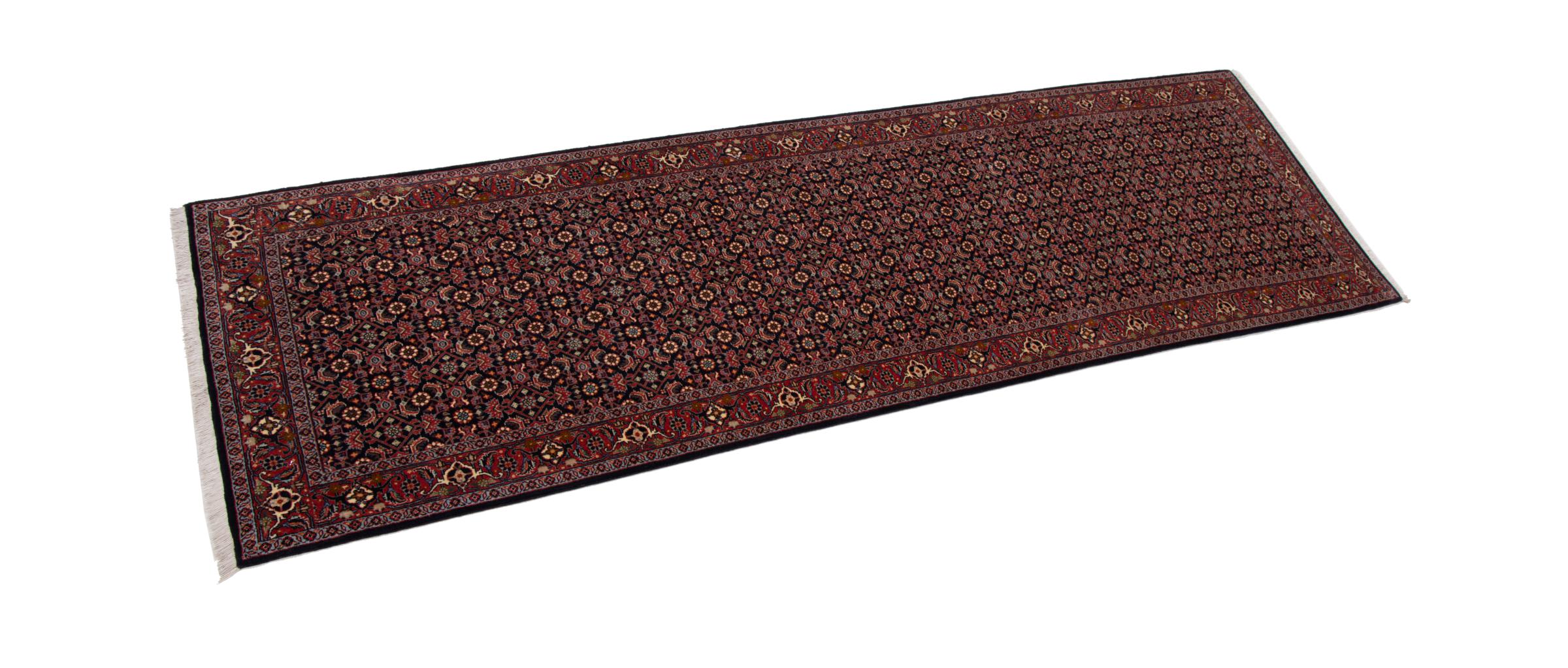 Dieser Perserteppich wurde in einer kurdischen Kleinstadt im westlichen Iran handgeknüpft. Der Bidjar-Teppich steht für hervorragende Qualität. Sein fester Flor besticht durch seine Kompaktheit und damit Verschleißfestigkeit. So wird die Wolle mit einem Kamm so fest zusammengedrückt, dass der Flor nahezu senkrecht nach oben steht. Gröbere Schmutzpartikel haben so kaum eine Chance einzudringen.