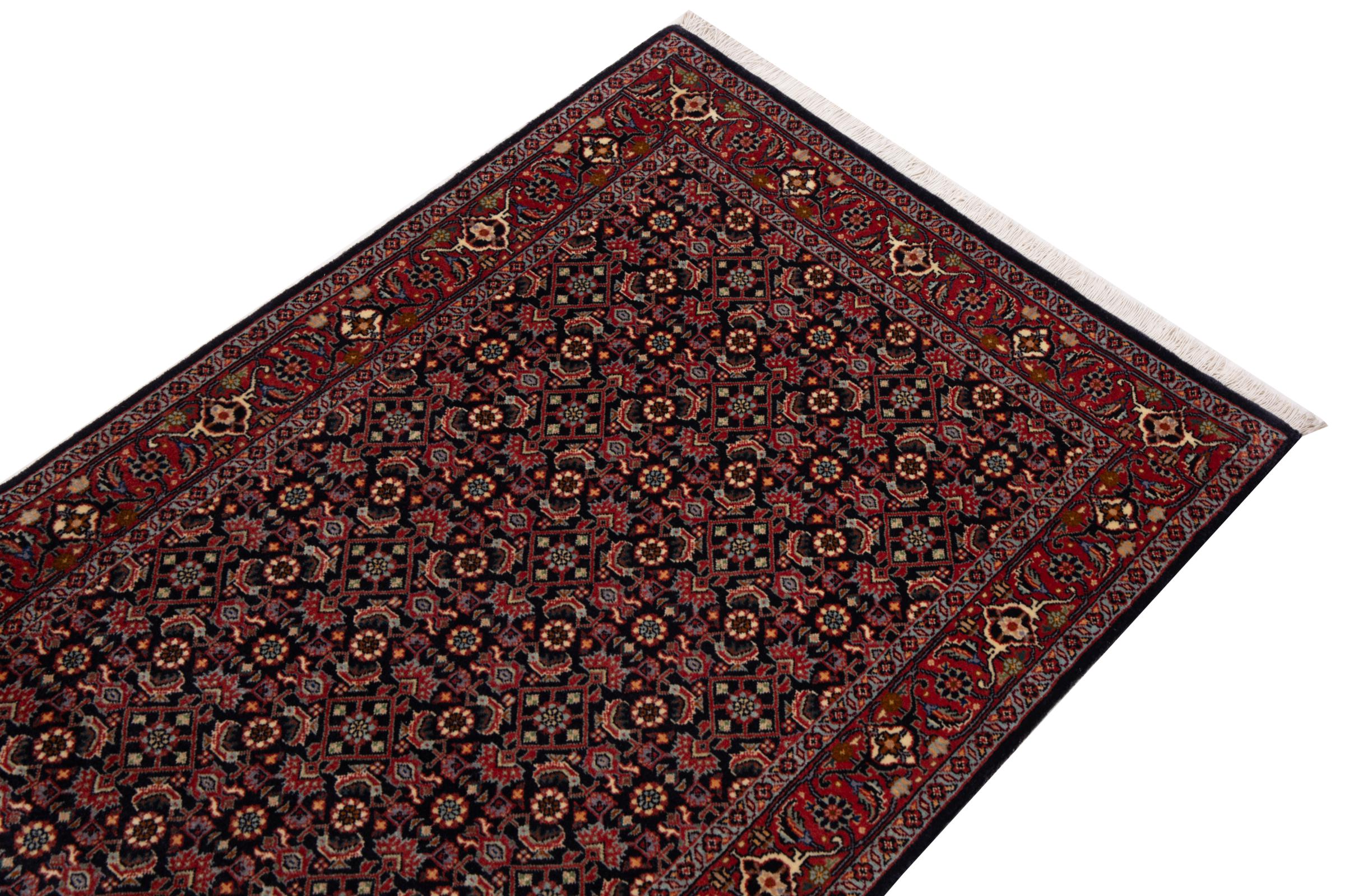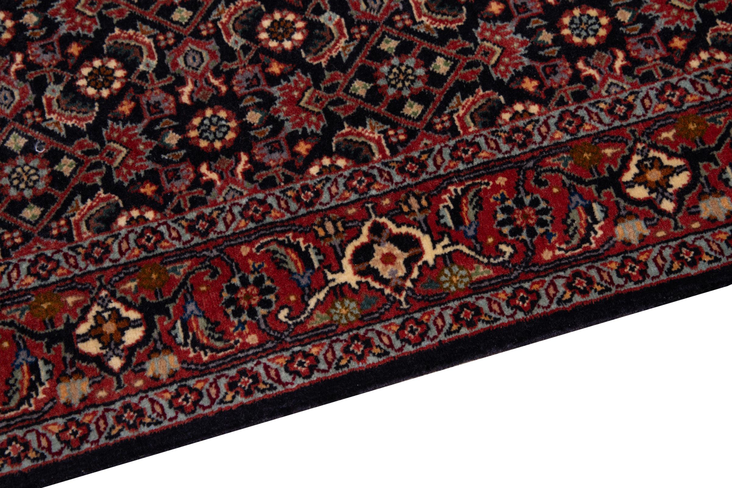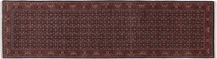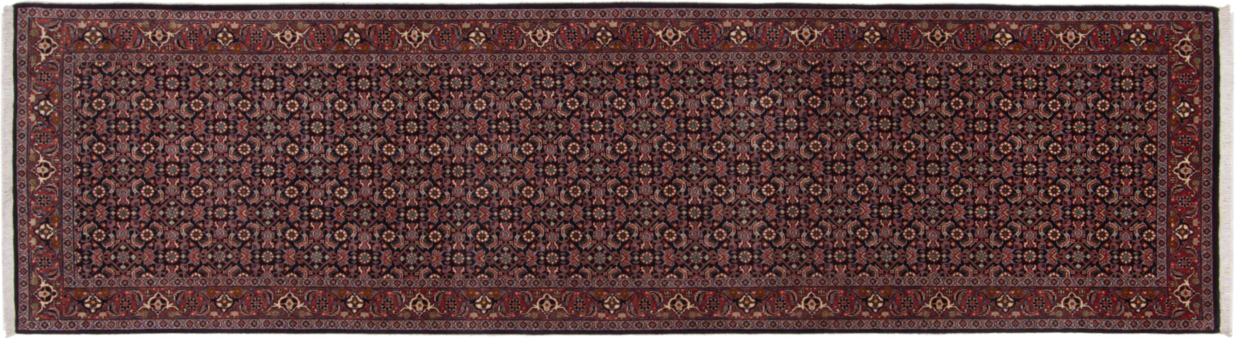 Dieser Perserteppich wurde in einer kurdischen Kleinstadt im westlichen Iran handgeknüpft. Der Bidjar-Teppich steht für hervorragende Qualität. Sein fester Flor besticht durch seine Kompaktheit und damit Verschleißfestigkeit. So wird die Wolle mit einem Kamm so fest zusammengedrückt, dass der Flor nahezu senkrecht nach oben steht. Gröbere Schmutzpartikel haben so kaum eine Chance einzudringen.