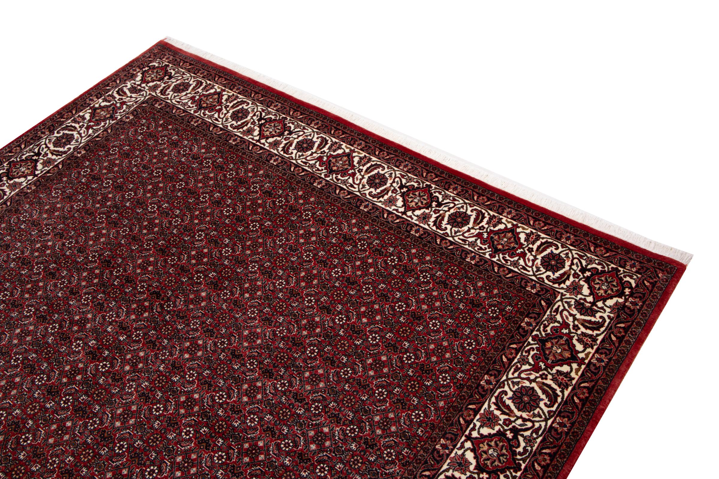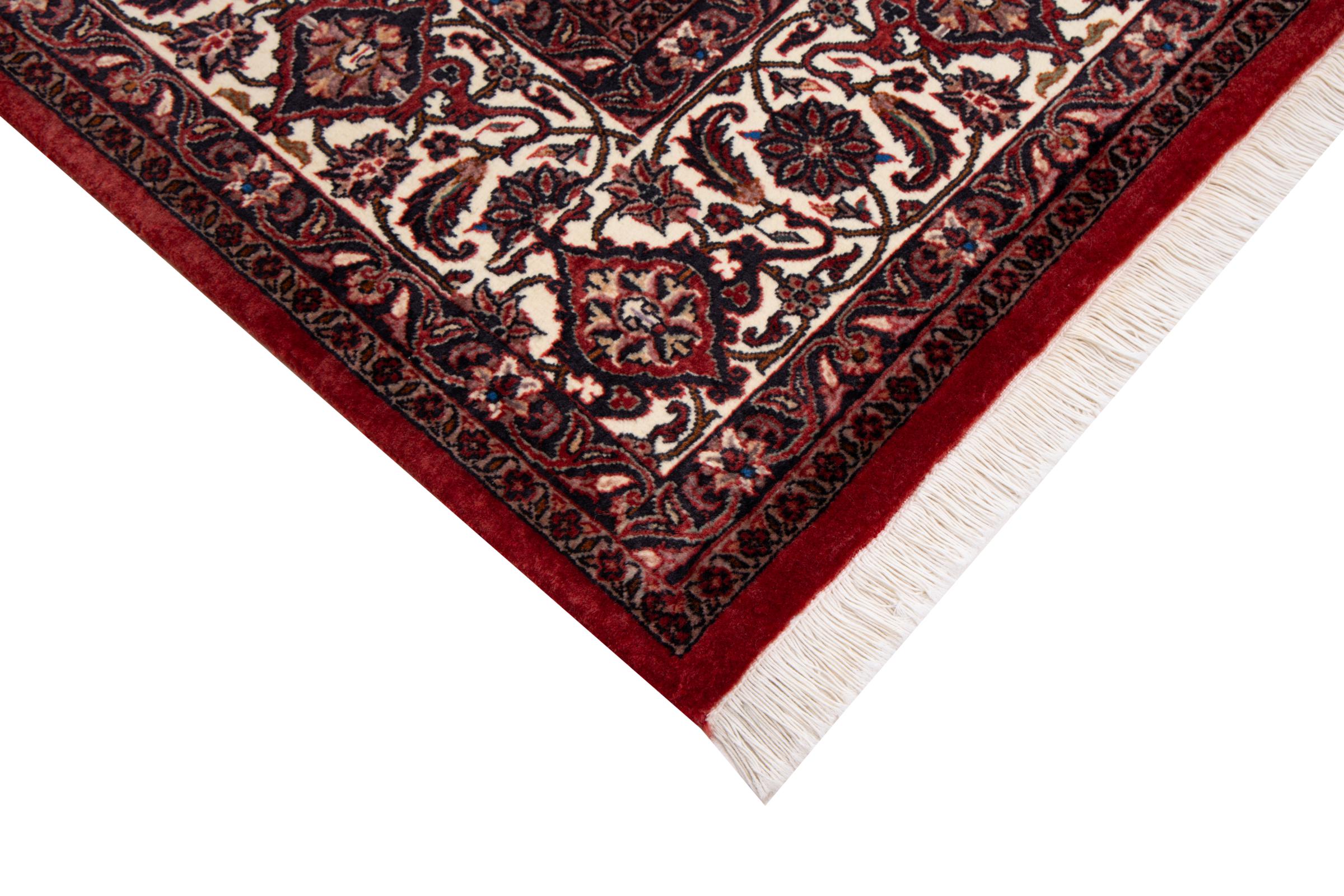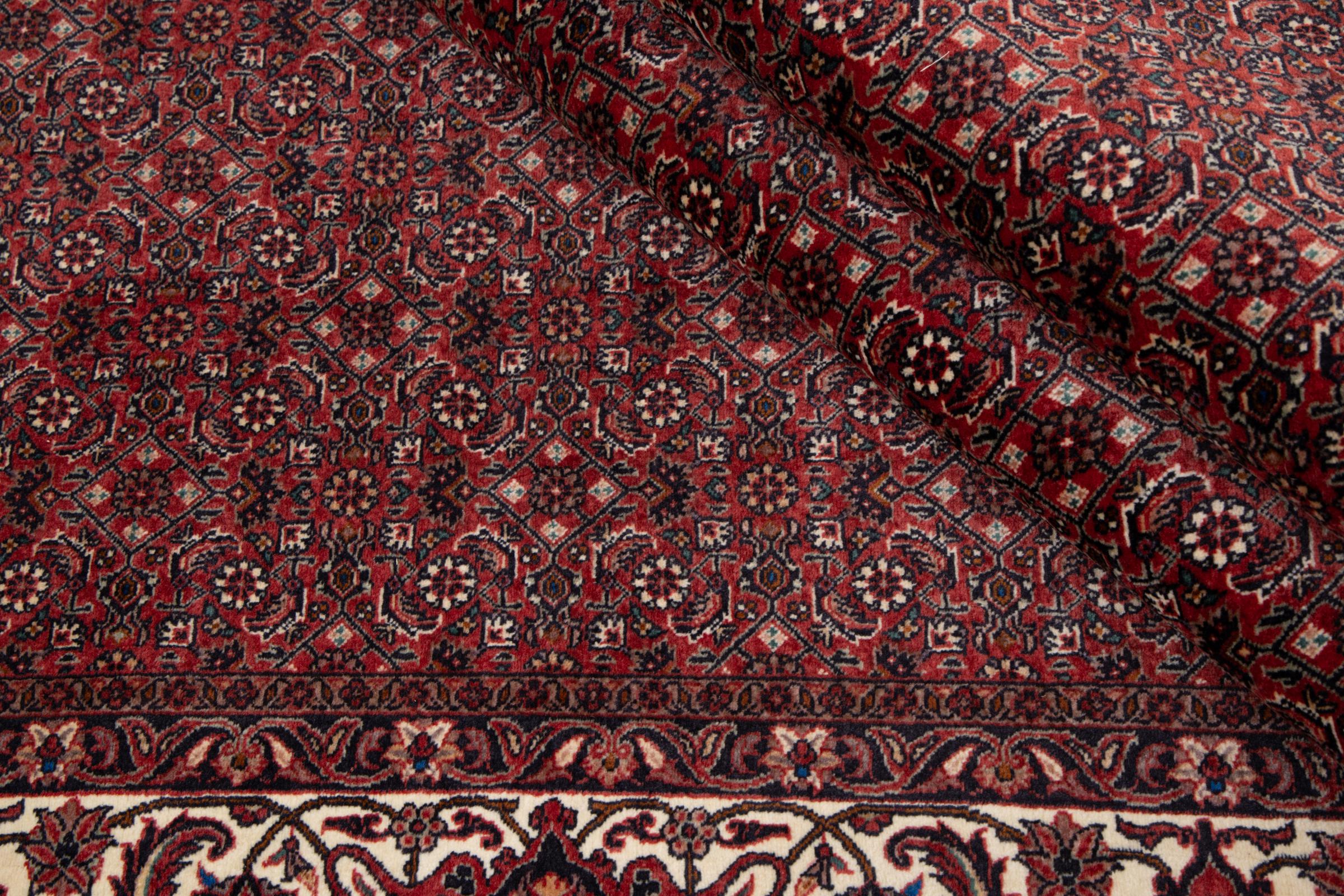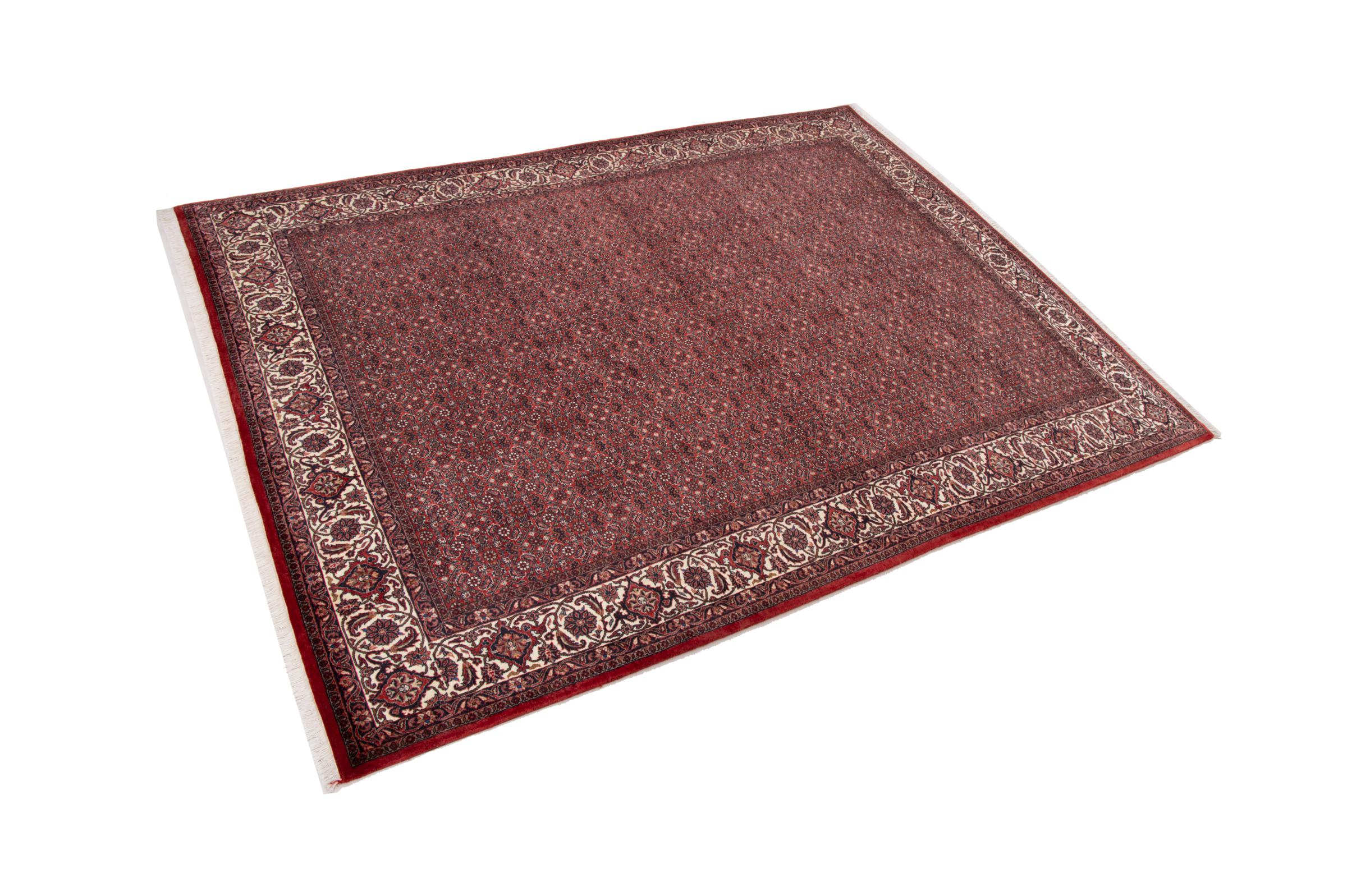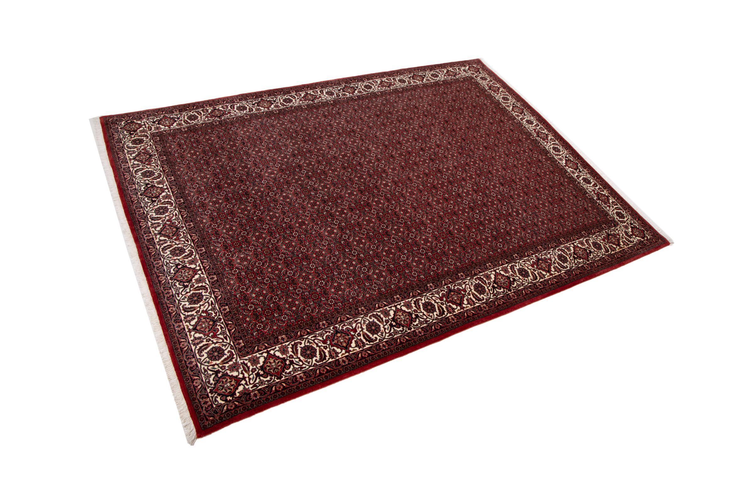 Dieser Perserteppich wurde in einer kurdischen Kleinstadt im westlichen Iran handgeknüpft. Der Bidjar-Teppich steht für hervorragende Qualität. Sein fester Flor besticht durch seine Kompaktheit und damit Verschleißfestigkeit. So wird die Wolle mit einem Kamm so fest zusammengedrückt, dass der Flor nahezu senkrecht nach oben steht. Gröbere Schmutzpartikel haben so kaum eine Chance einzudringen.