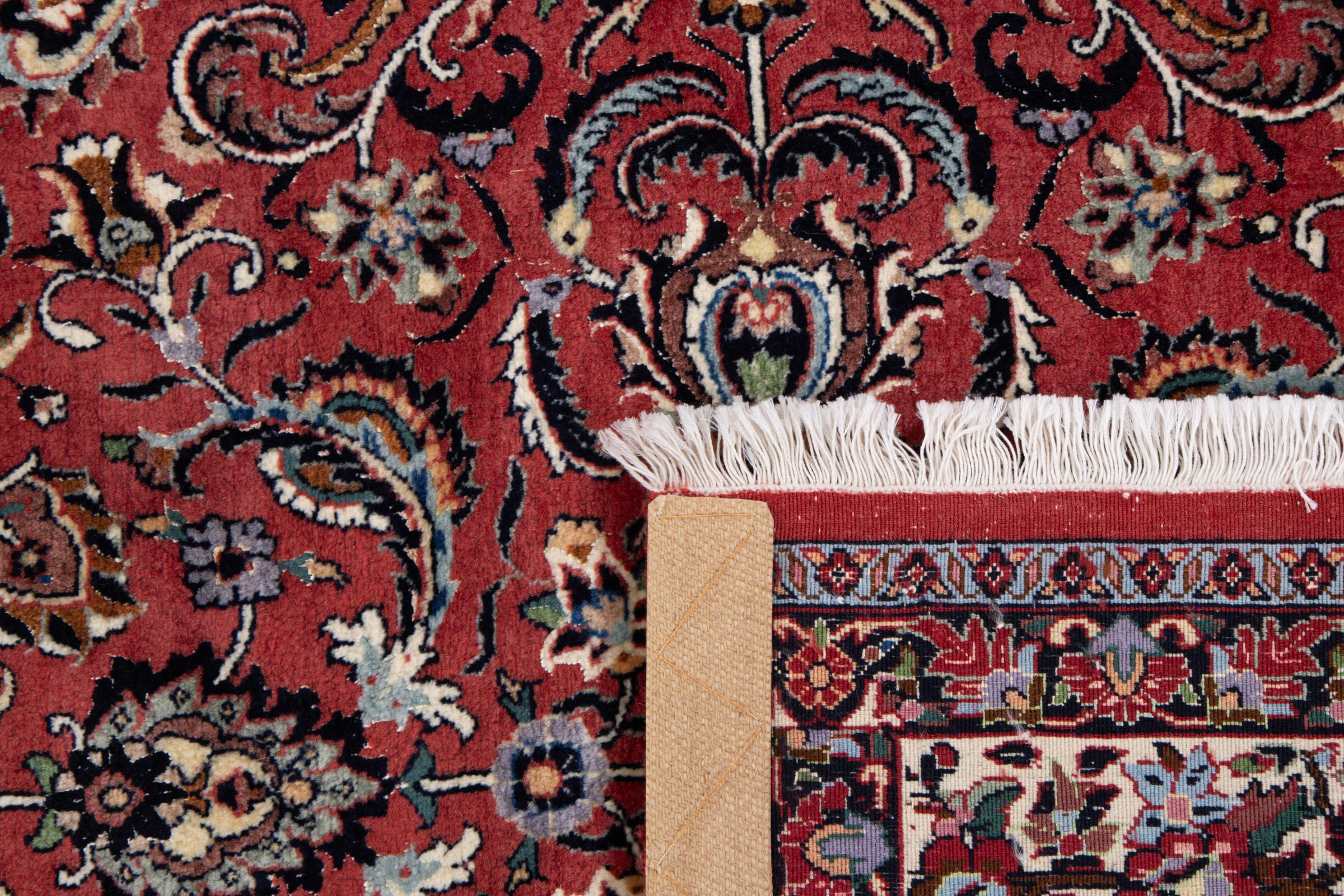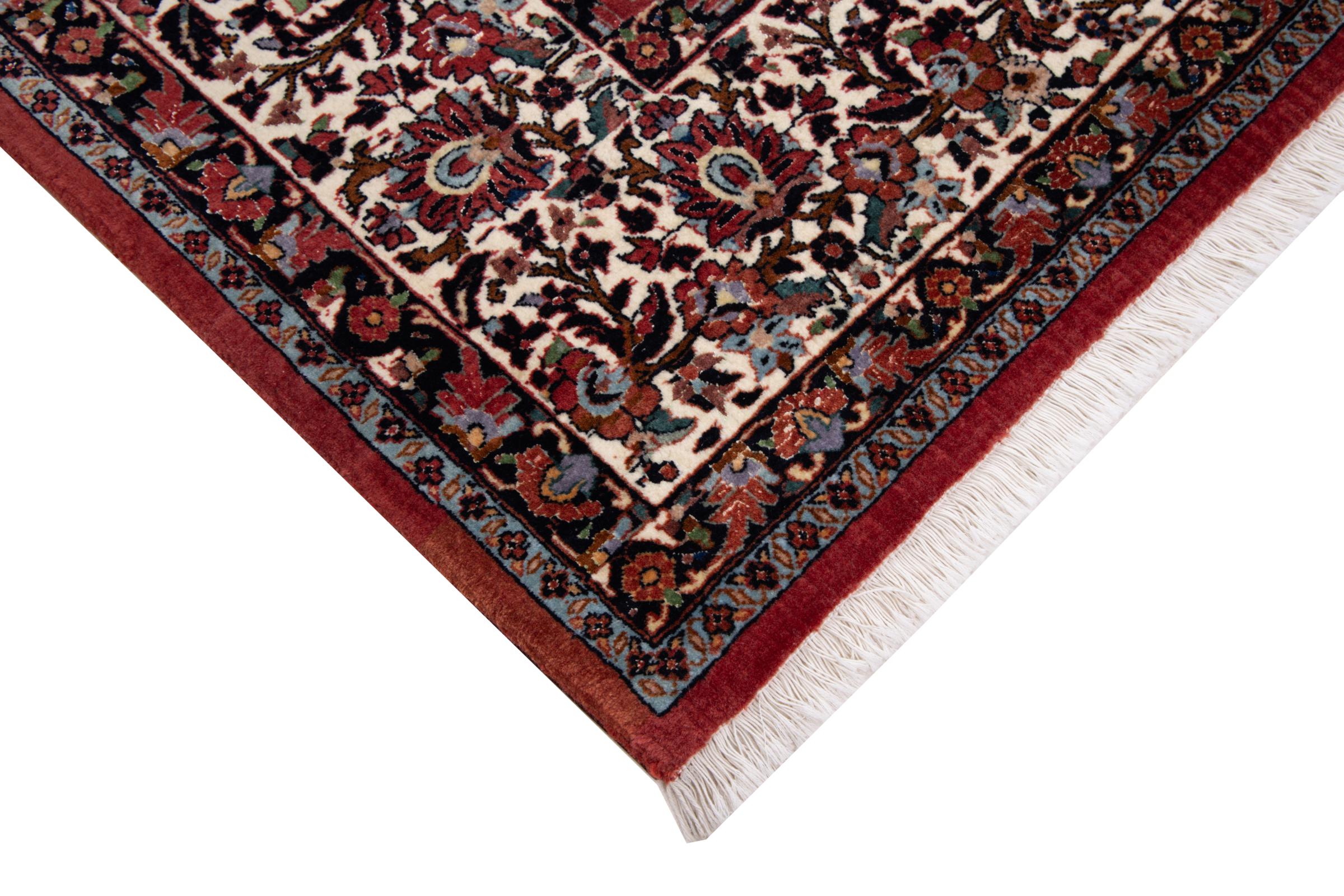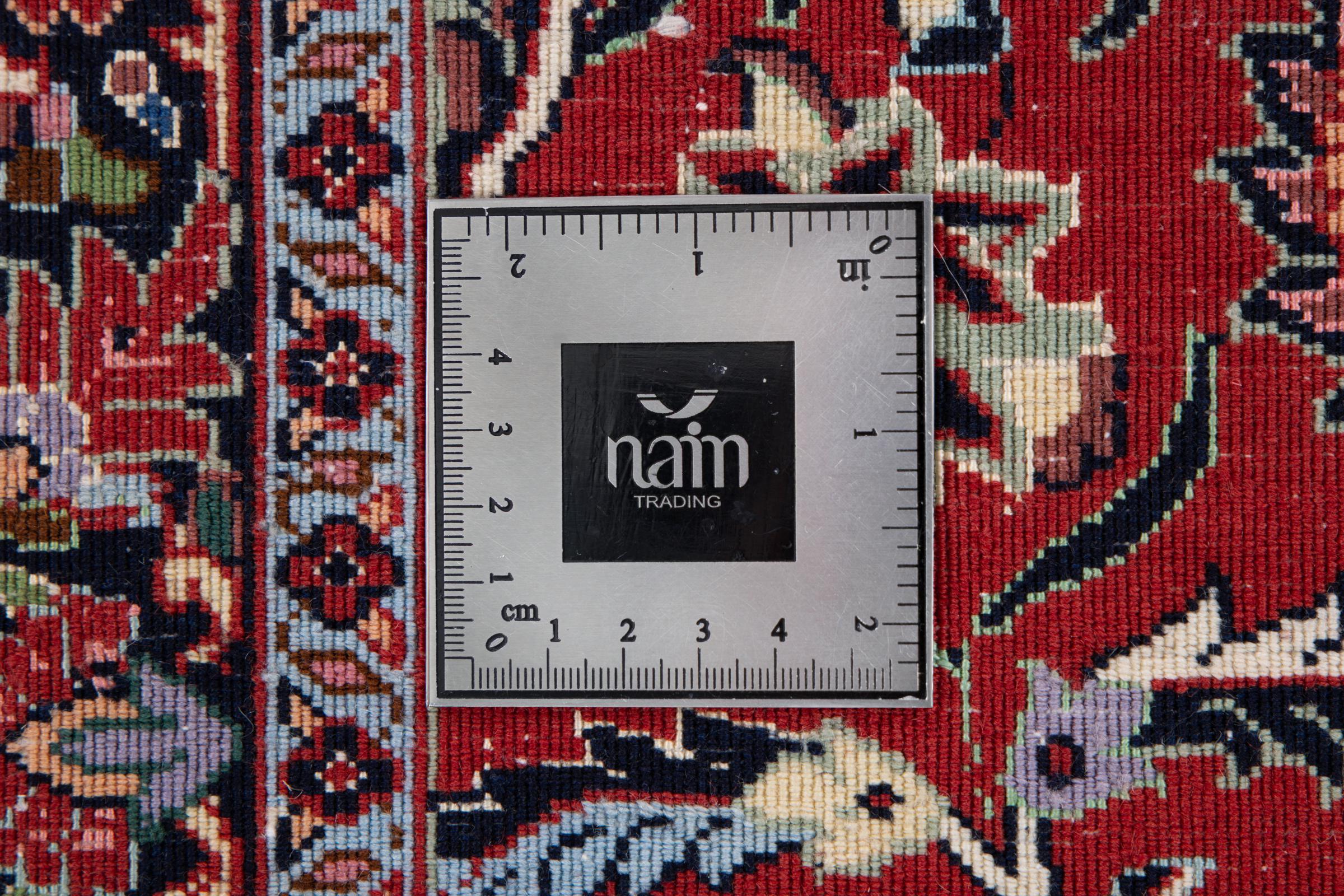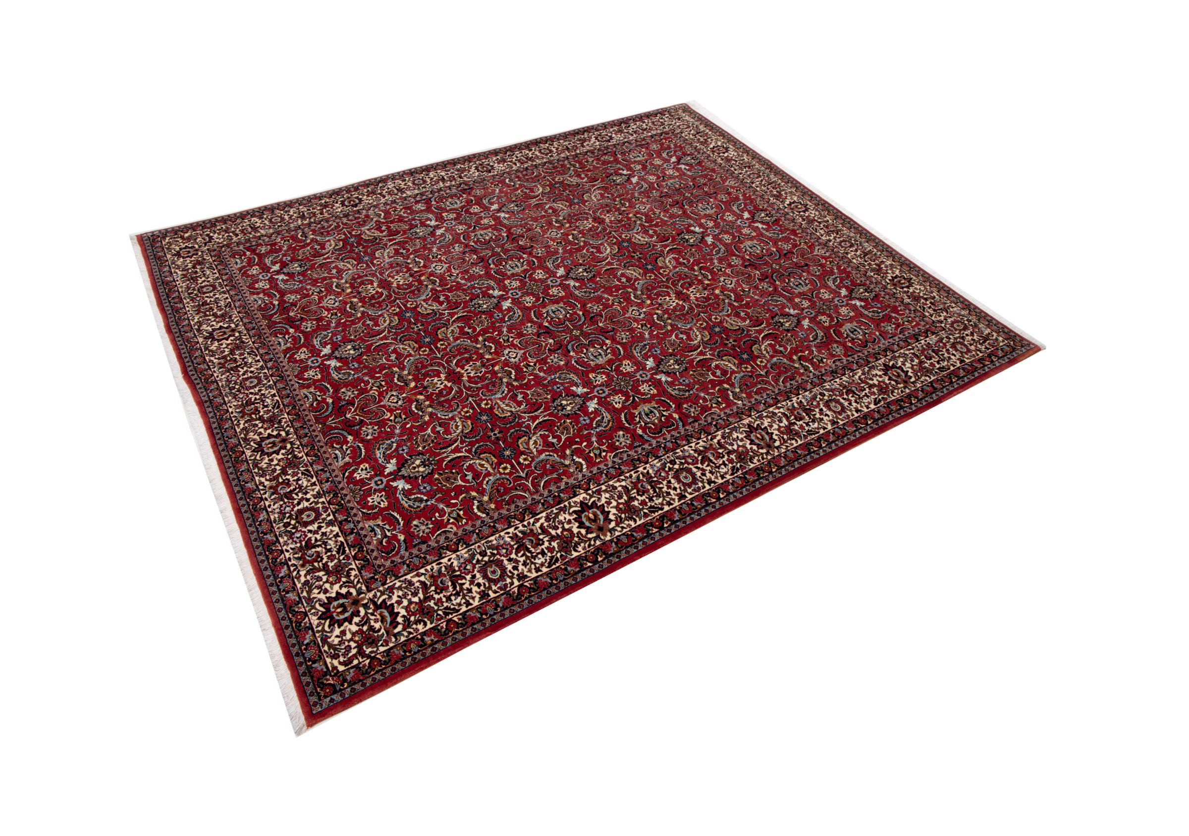 Dieser Perserteppich wurde in einer kurdischen Kleinstadt im westlichen Iran handgeknüpft. Der Bidjar-Teppich steht für hervorragende Qualität. Sein fester Flor besticht durch seine Kompaktheit und damit Verschleißfestigkeit. So wird die Wolle mit einem Kamm so fest zusammengedrückt, dass der Flor nahezu senkrecht nach oben steht. Gröbere Schmutzpartikel haben so kaum eine Chance einzudringen.