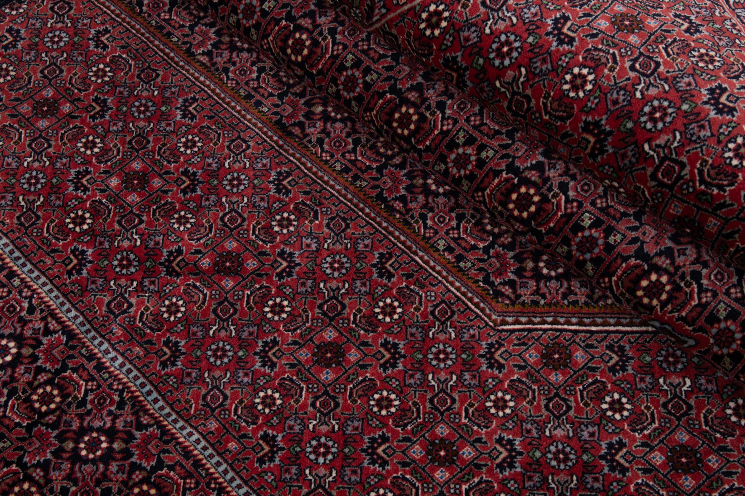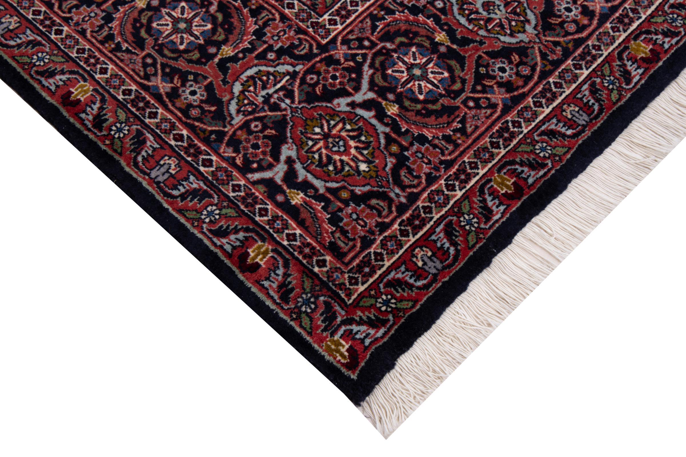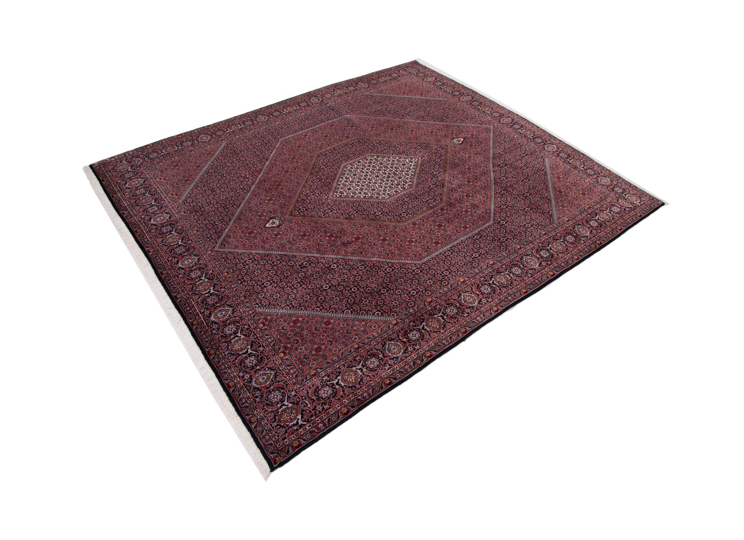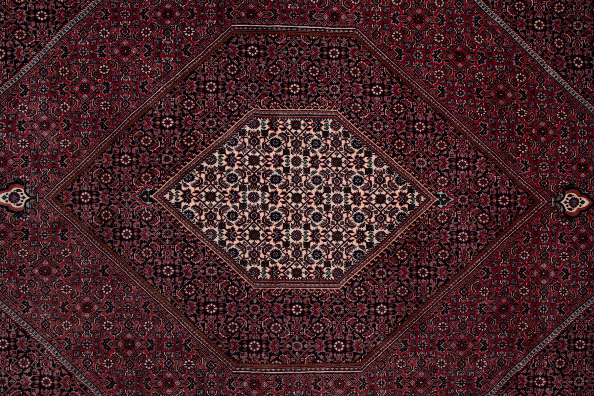Dieser Perserteppich wurde in einer kurdischen Kleinstadt im westlichen Iran handgeknüpft. Der Bidjar-Teppich steht für hervorragende Qualität. Sein fester Flor besticht durch seine Kompaktheit und damit Verschleißfestigkeit. So wird die Wolle mit einem Kamm so fest zusammengedrückt, dass der Flor nahezu senkrecht nach oben steht. Gröbere Schmutzpartikel haben so kaum eine Chance einzudringen.