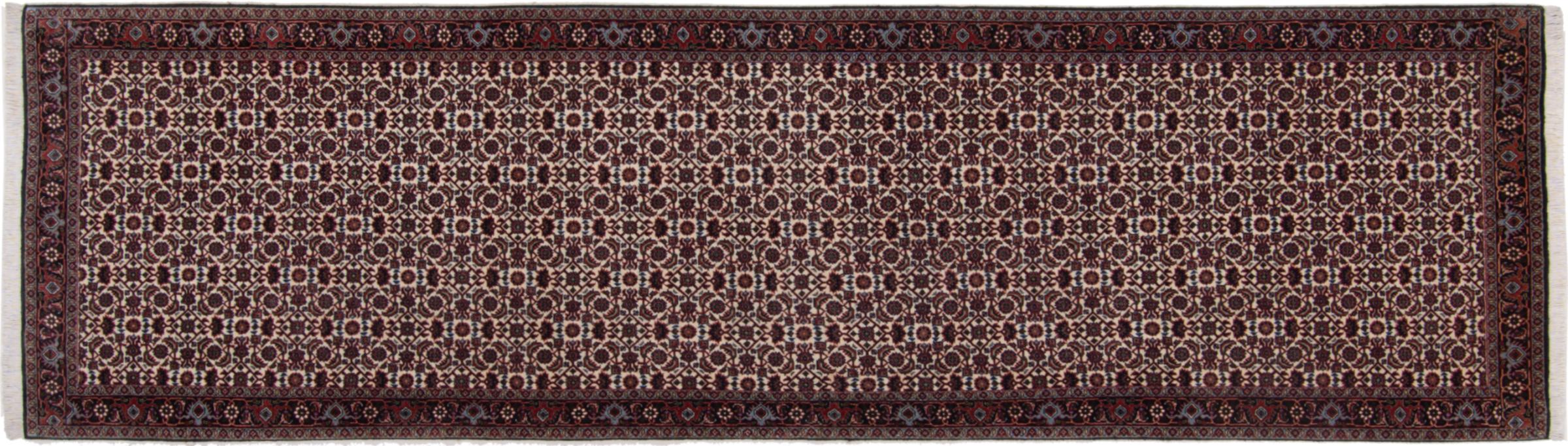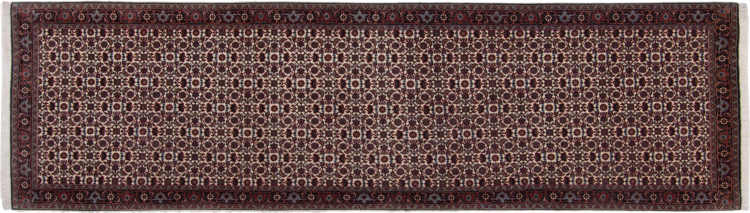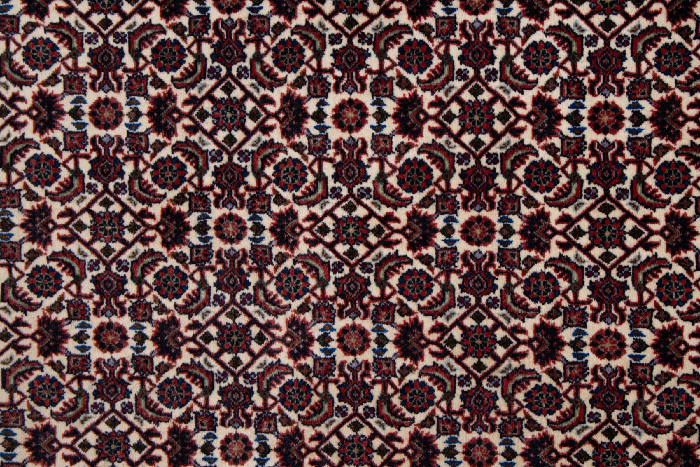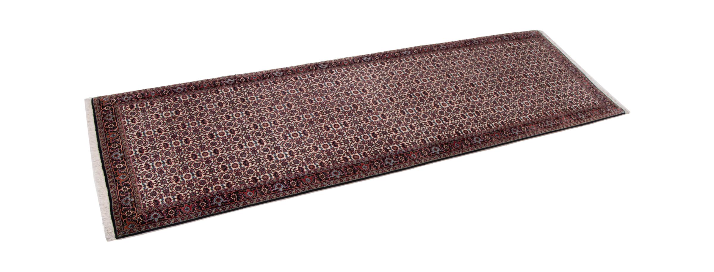 Dieser Perserteppich wurde in einer kurdischen Kleinstadt im westlichen Iran handgeknüpft. Der Bidjar-Teppich steht für hervorragende Qualität. Sein fester Flor besticht durch seine Kompaktheit und damit Verschleißfestigkeit. So wird die Wolle mit einem Kamm so fest zusammengedrückt, dass der Flor nahezu senkrecht nach oben steht. Gröbere Schmutzpartikel haben so kaum eine Chance einzudringen.