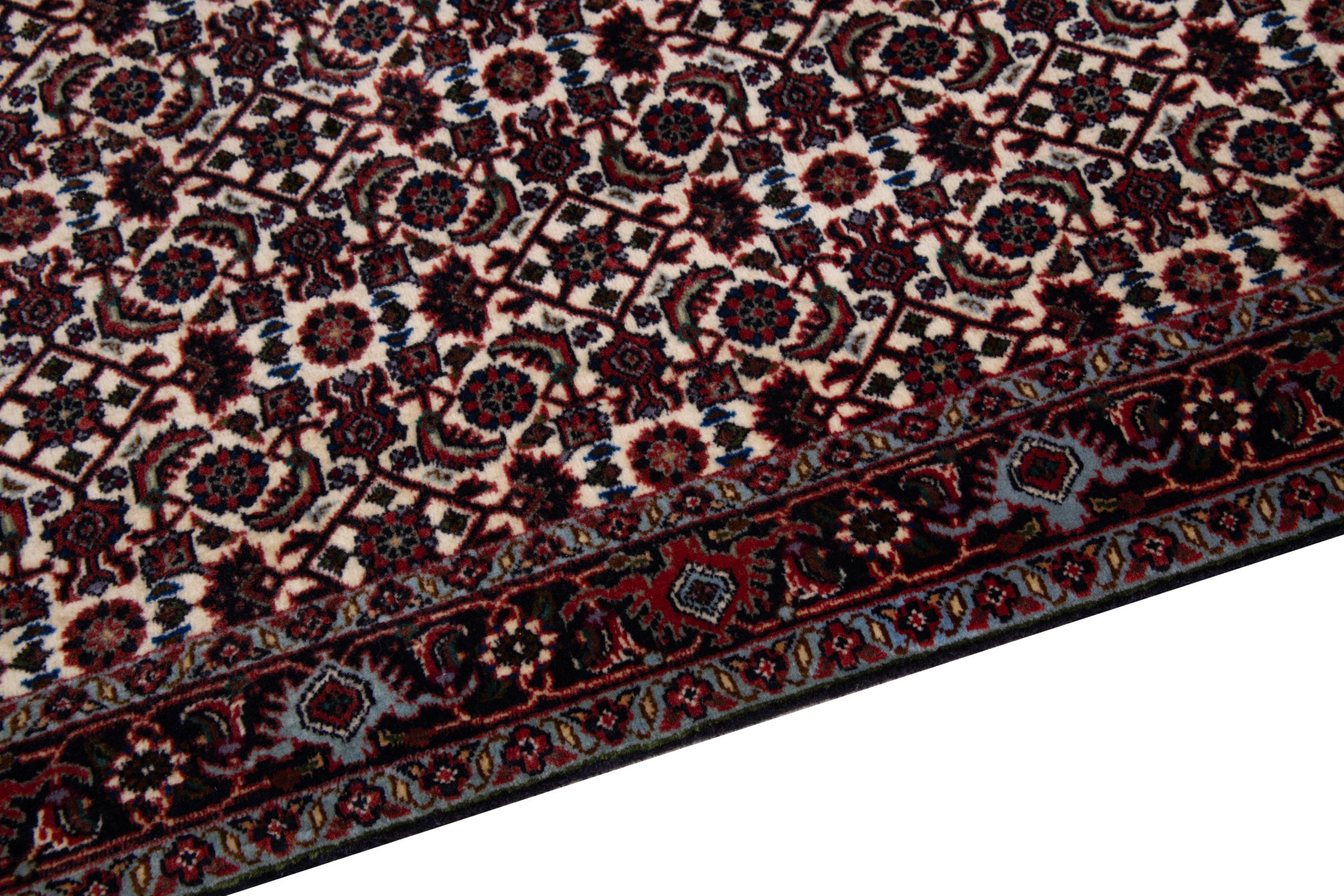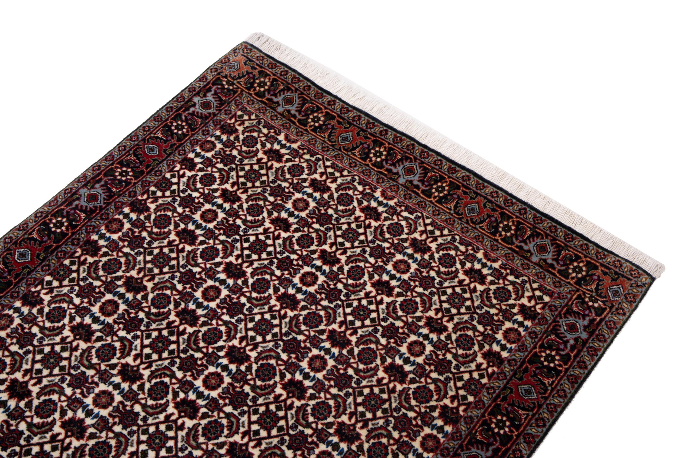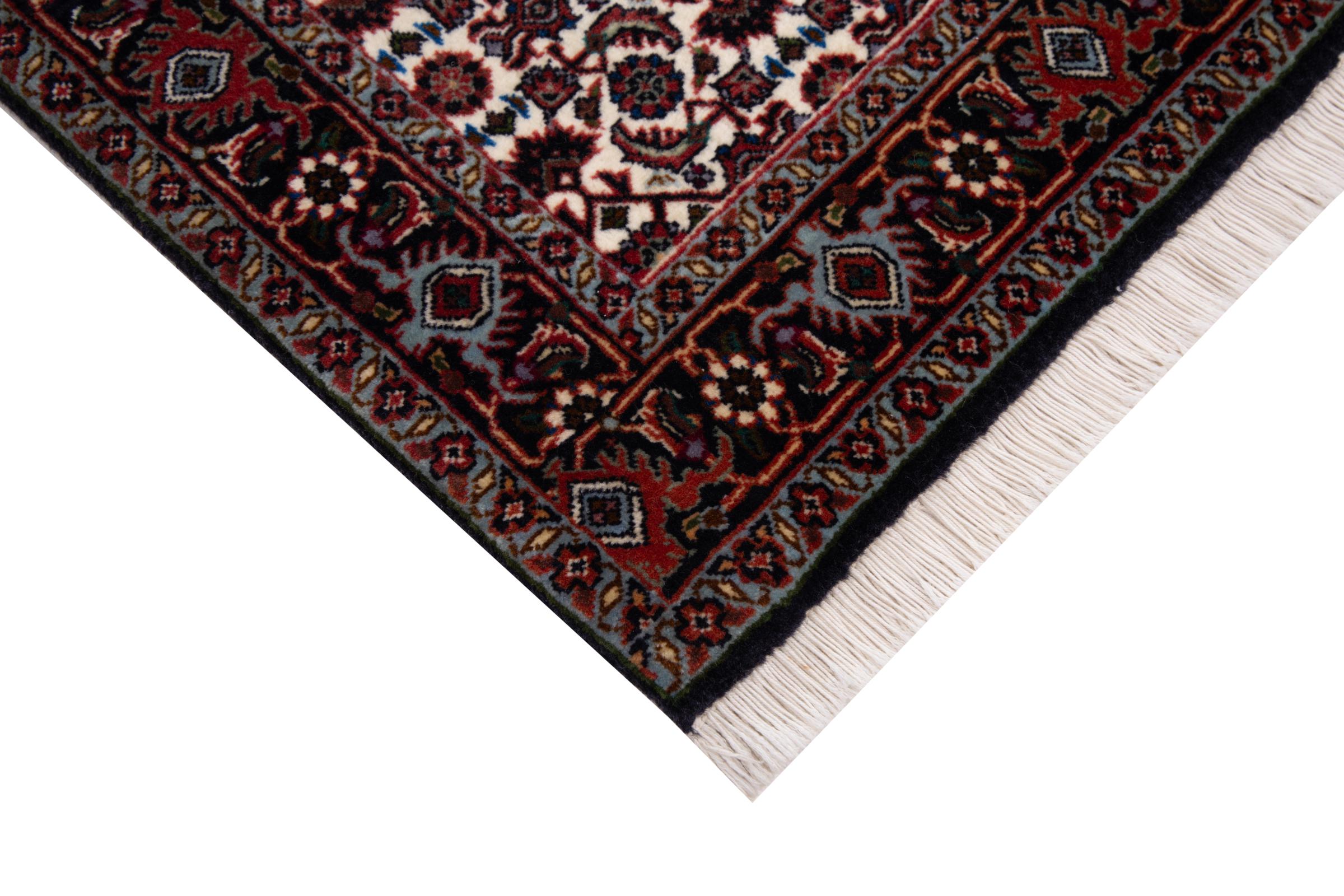 Dieser Perserteppich wurde in einer kurdischen Kleinstadt im westlichen Iran handgeknüpft. Der Bidjar-Teppich steht für hervorragende Qualität. Sein fester Flor besticht durch seine Kompaktheit und damit Verschleißfestigkeit. So wird die Wolle mit einem Kamm so fest zusammengedrückt, dass der Flor nahezu senkrecht nach oben steht. Gröbere Schmutzpartikel haben so kaum eine Chance einzudringen.