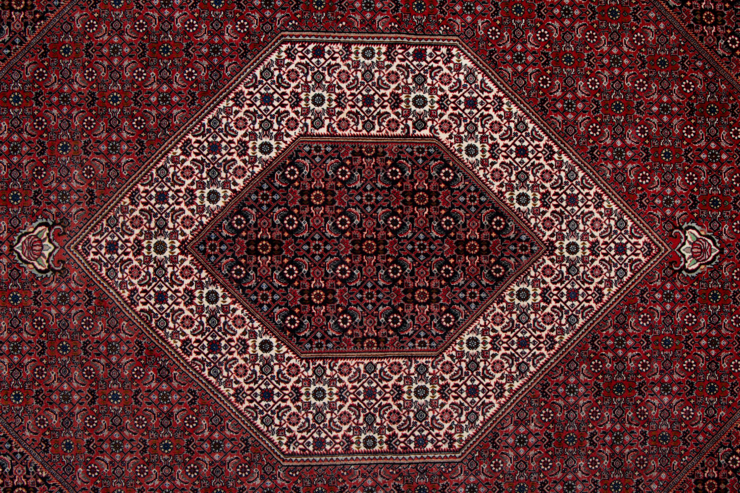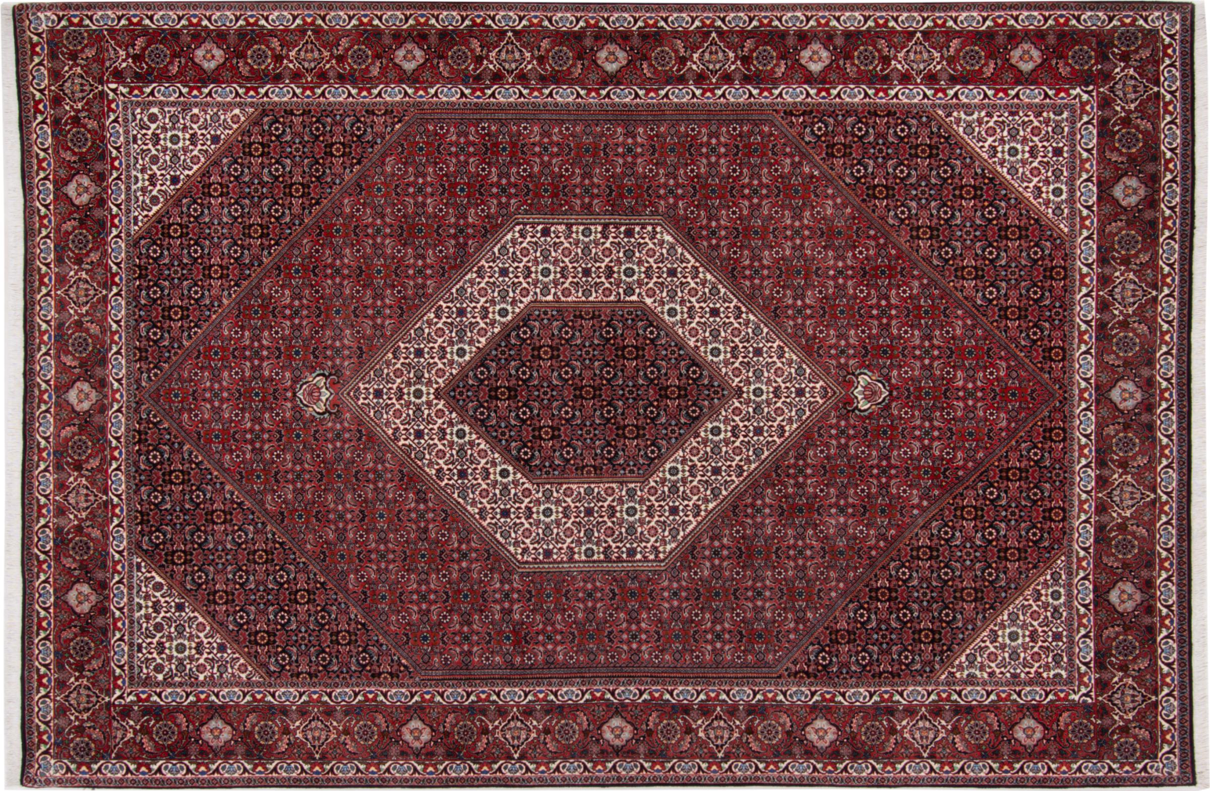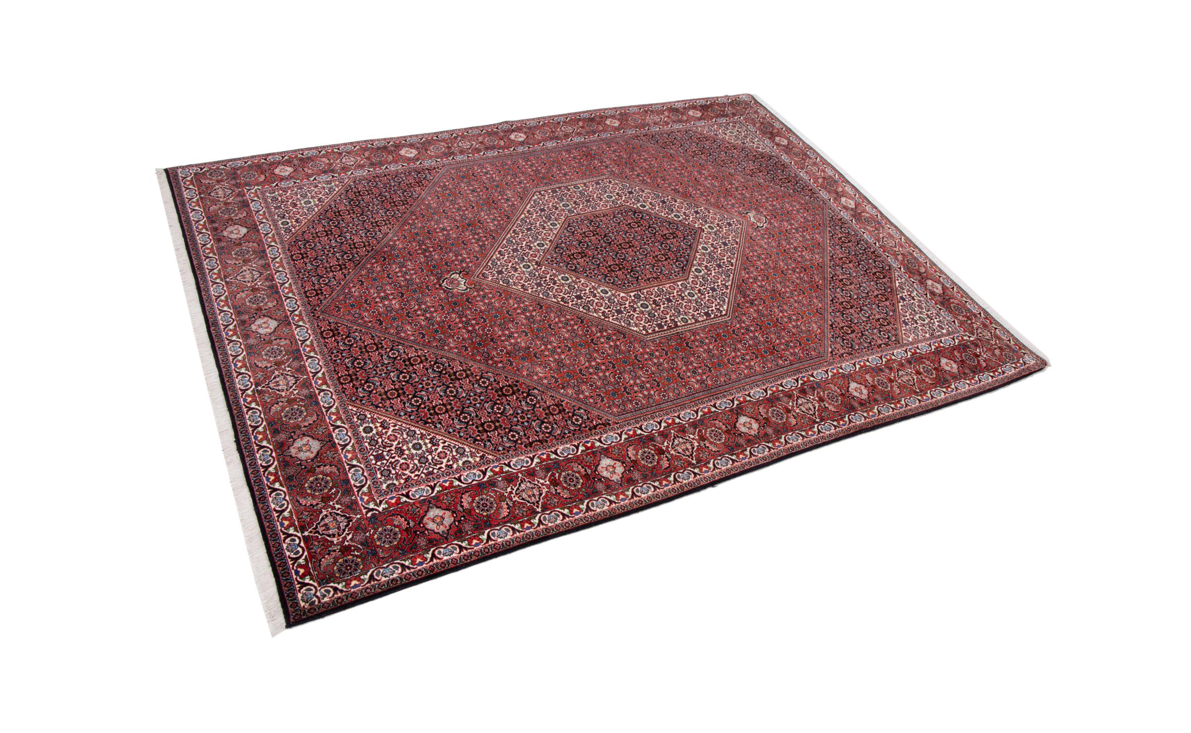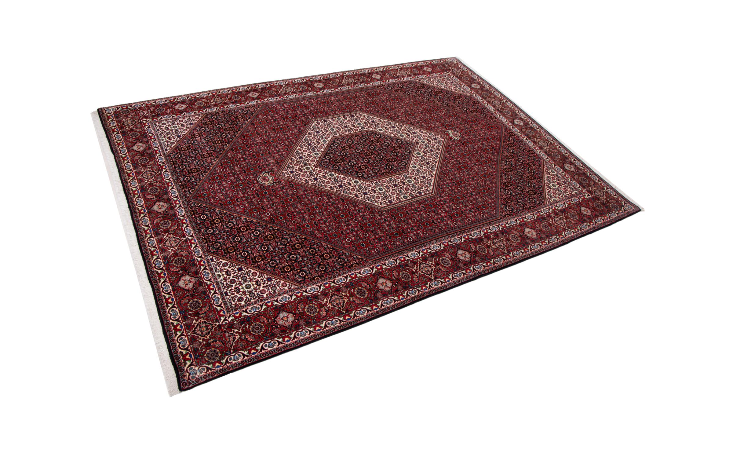 Dieser Perserteppich wurde in einer kurdischen Kleinstadt im westlichen Iran handgeknüpft. Der Bidjar-Teppich steht für hervorragende Qualität. Sein fester Flor besticht durch seine Kompaktheit und damit Verschleißfestigkeit. So wird die Wolle mit einem Kamm so fest zusammengedrückt, dass der Flor nahezu senkrecht nach oben steht. Gröbere Schmutzpartikel haben so kaum eine Chance einzudringen.