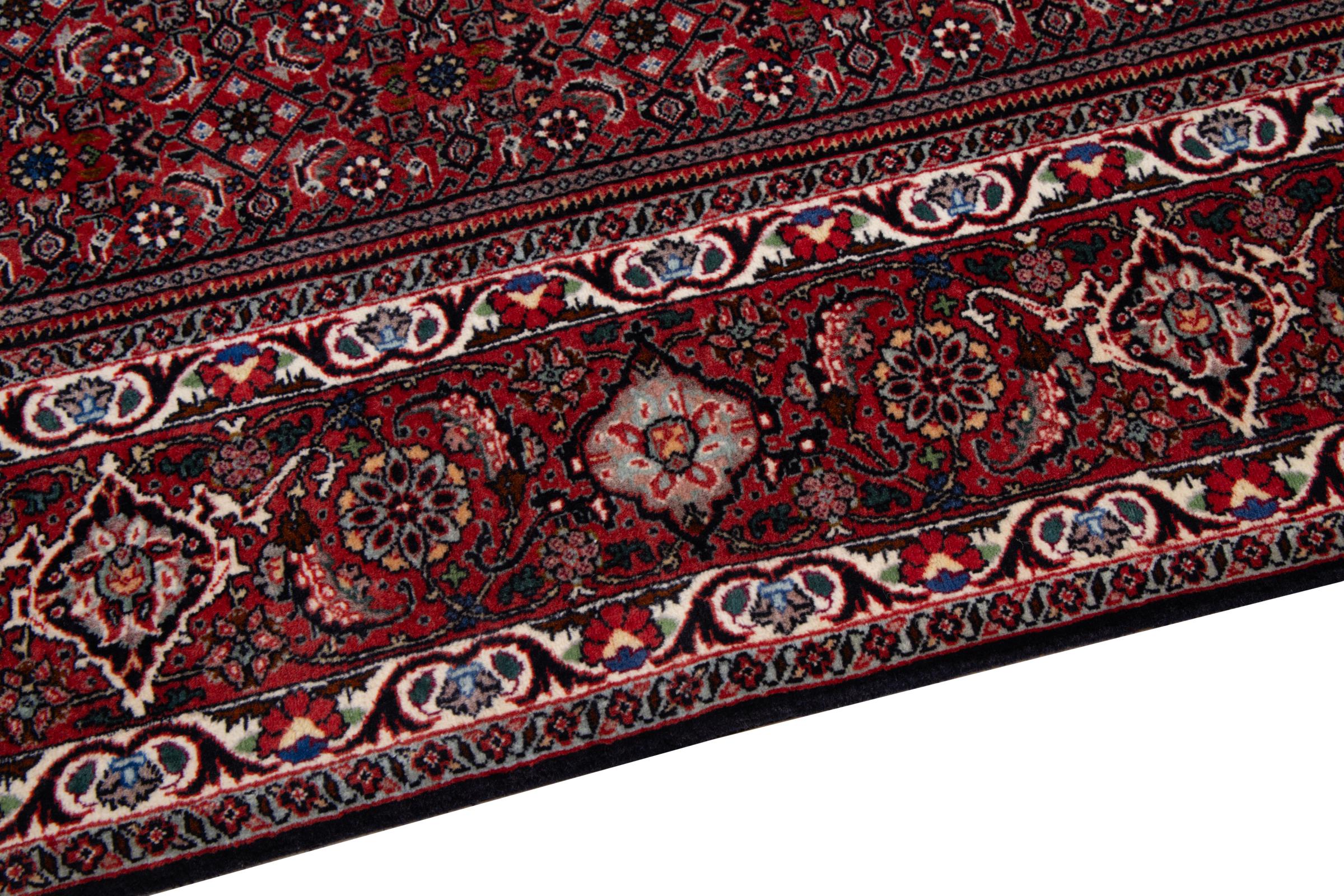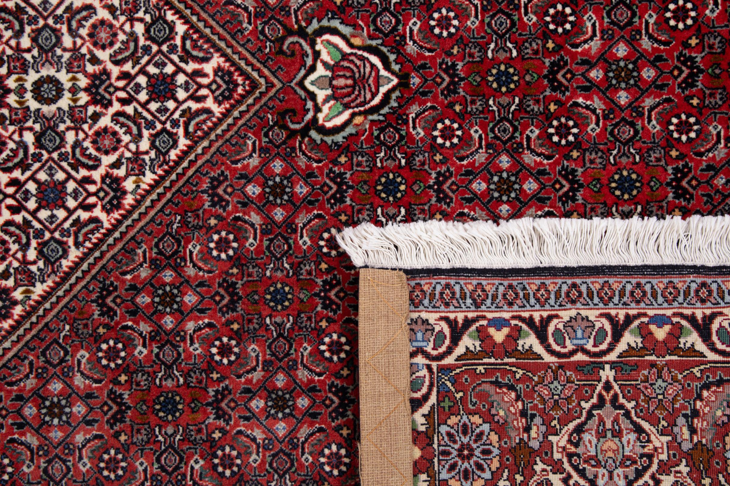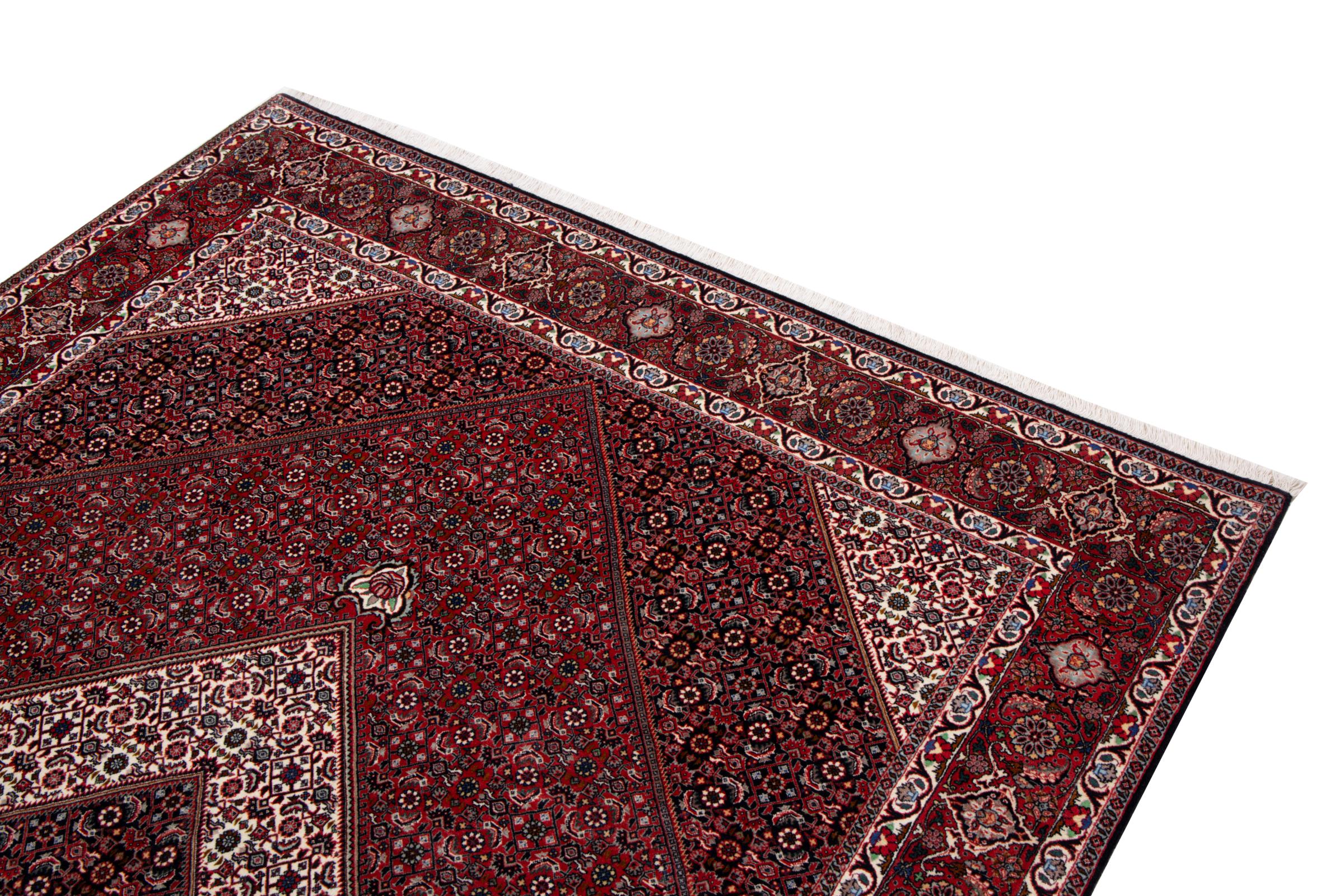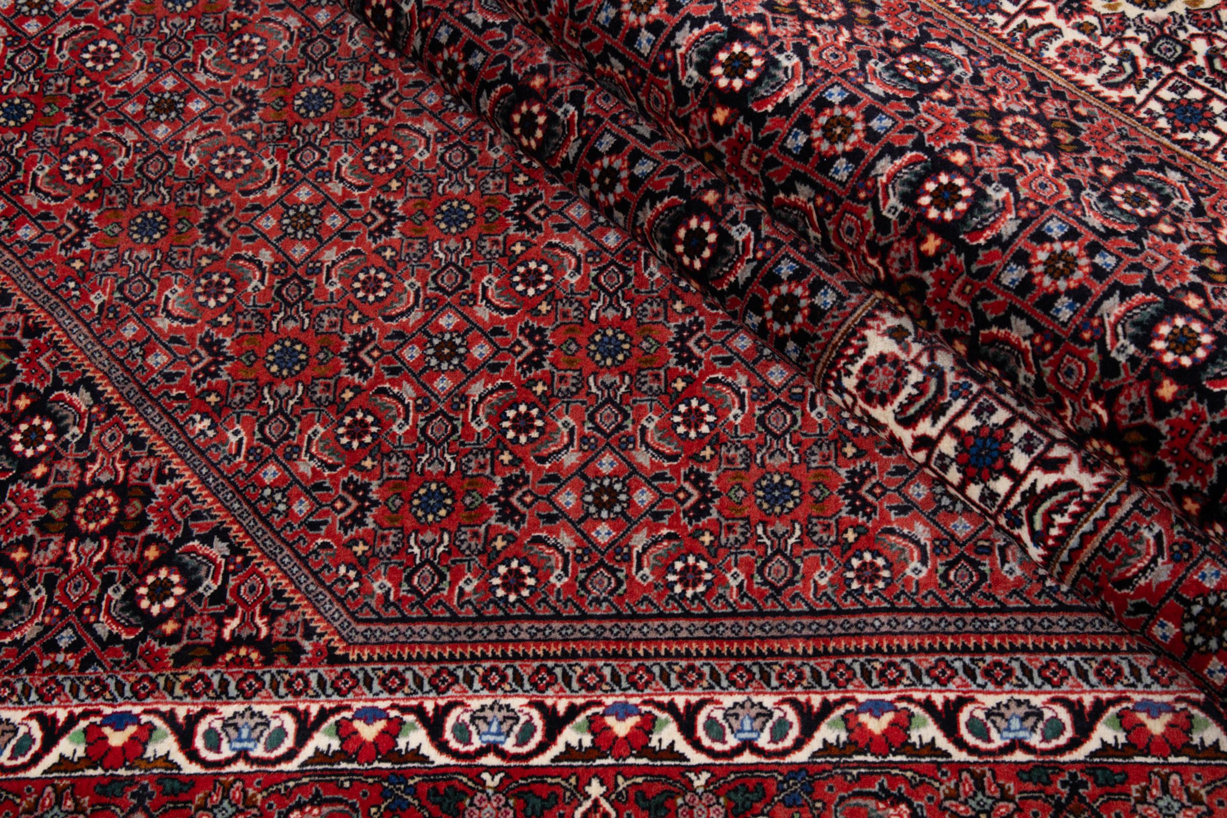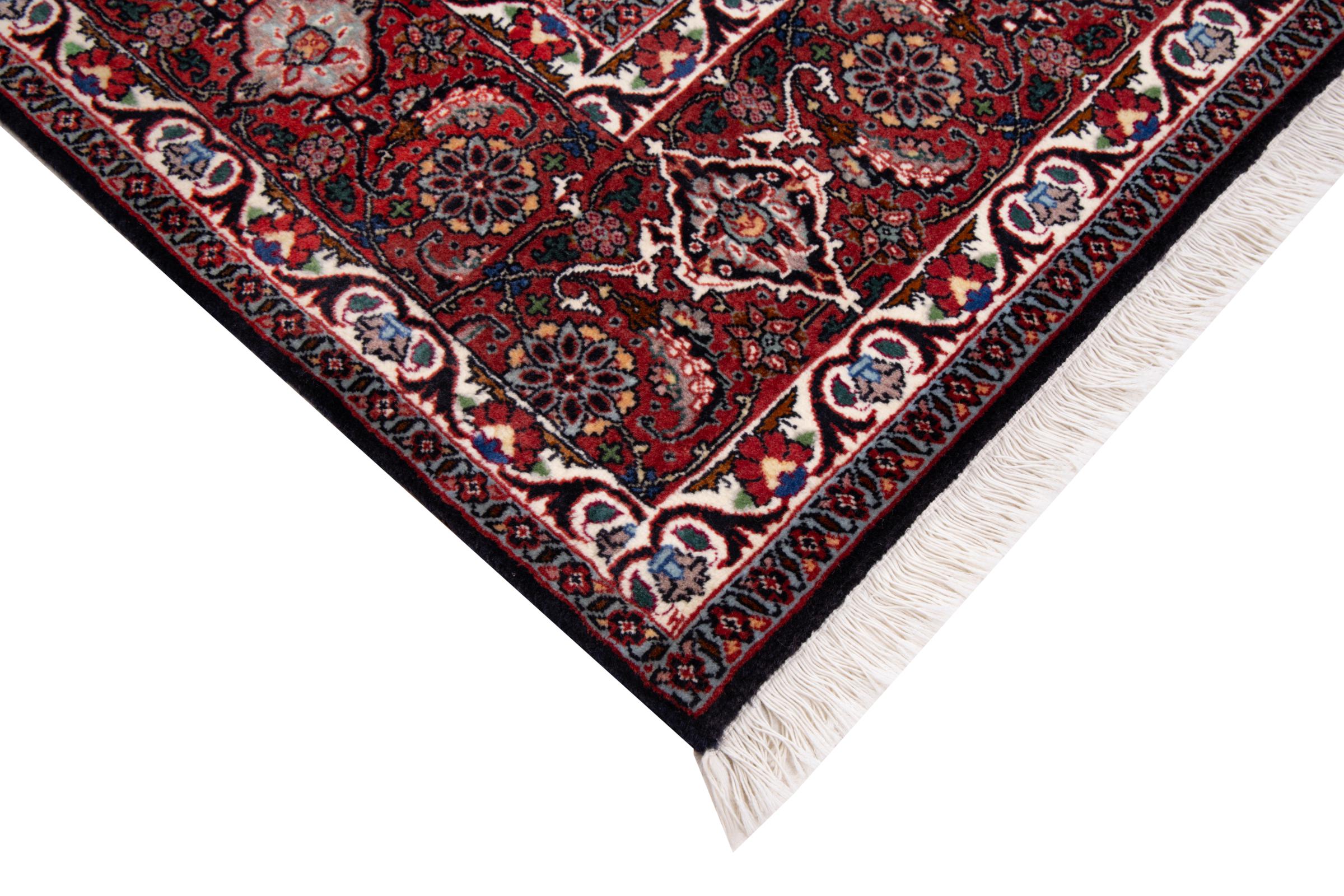 Dieser Perserteppich wurde in einer kurdischen Kleinstadt im westlichen Iran handgeknüpft. Der Bidjar-Teppich steht für hervorragende Qualität. Sein fester Flor besticht durch seine Kompaktheit und damit Verschleißfestigkeit. So wird die Wolle mit einem Kamm so fest zusammengedrückt, dass der Flor nahezu senkrecht nach oben steht. Gröbere Schmutzpartikel haben so kaum eine Chance einzudringen.