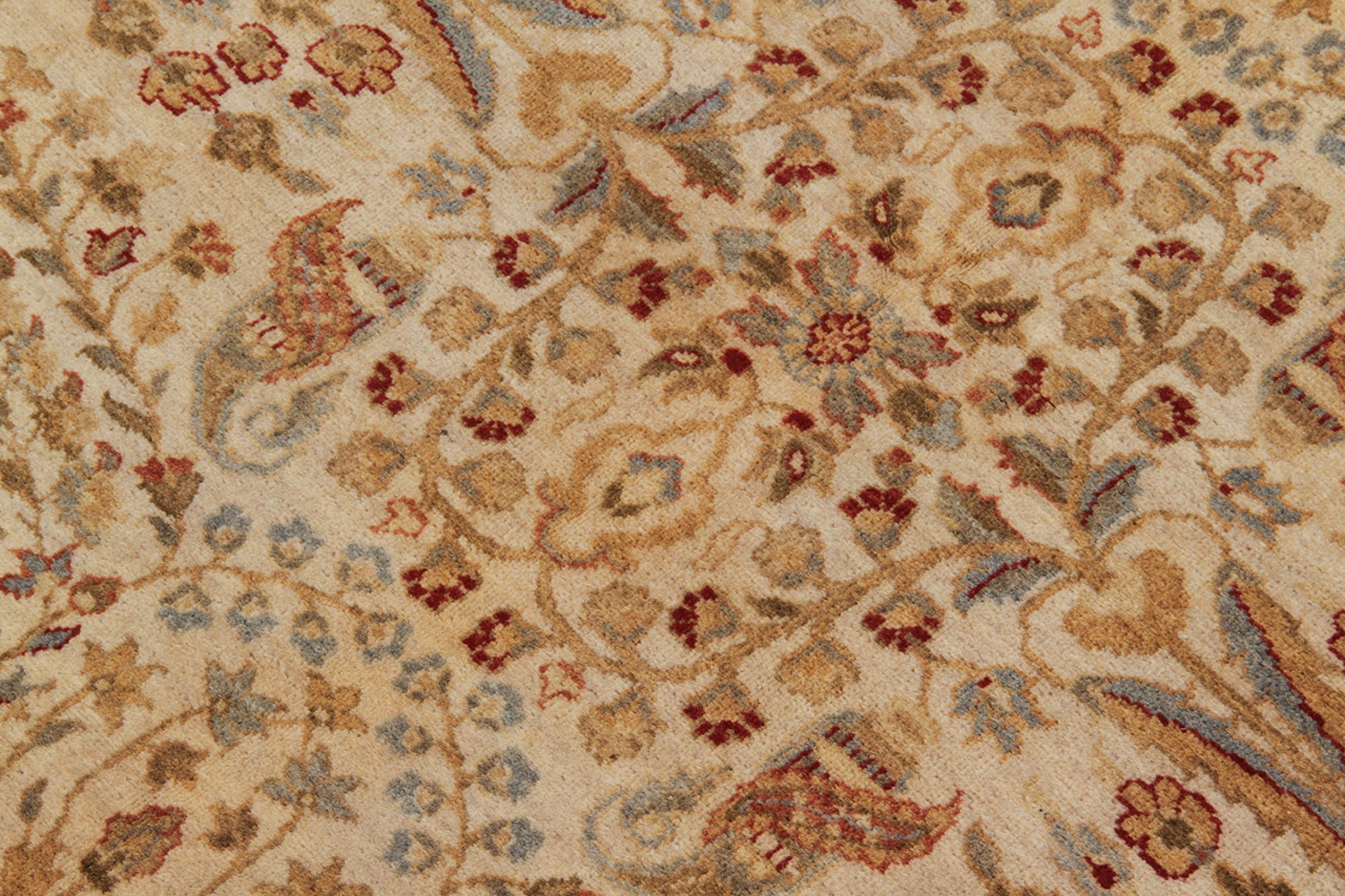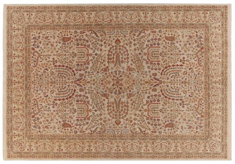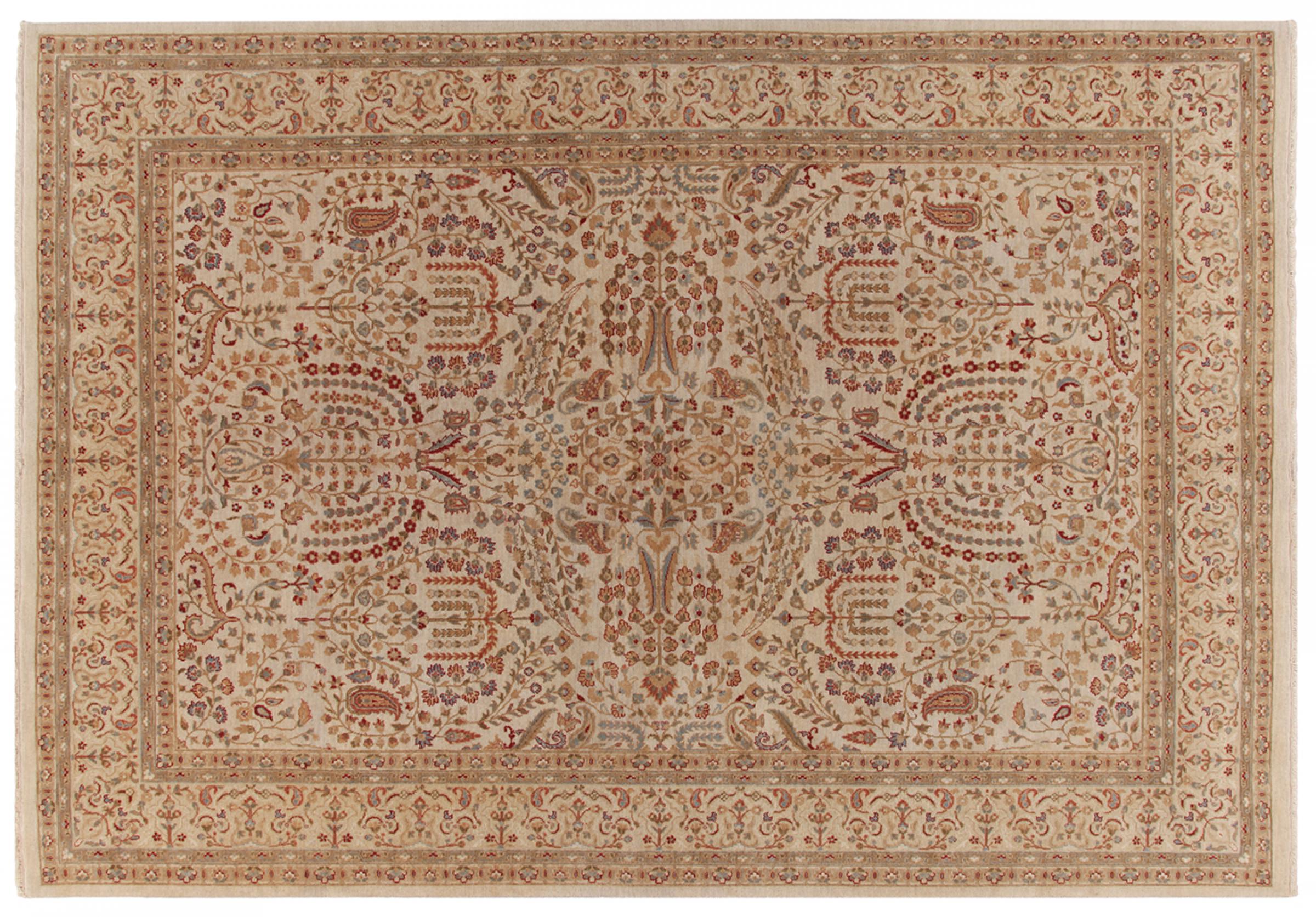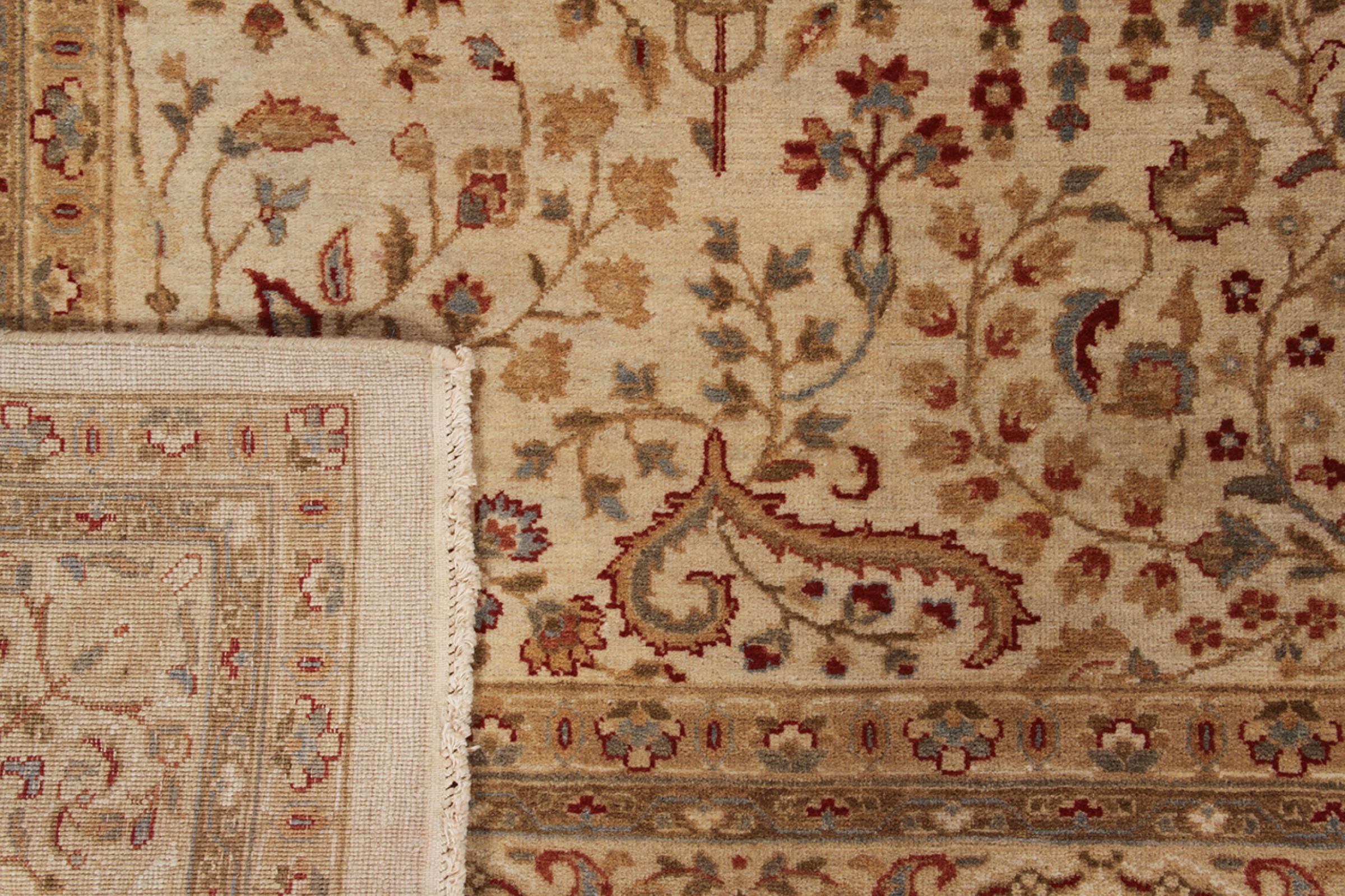 Dieser Indo Tabriz ist ein wunderschönes Exemplar indischen Kunsthandwerks. Von Hand geknüpft und mit hochwertiger Wolle hergestellt, wird er Ihnen über Jahrzehnte treu bleiben. Wie der Name sagt, wurde er den ursprünglichen persischen Tabriz Teppichen nachempfunden. Dieser Teppich ist ein faszinierendes Werk monatelanger Knüpfkunst und Handarbeit.