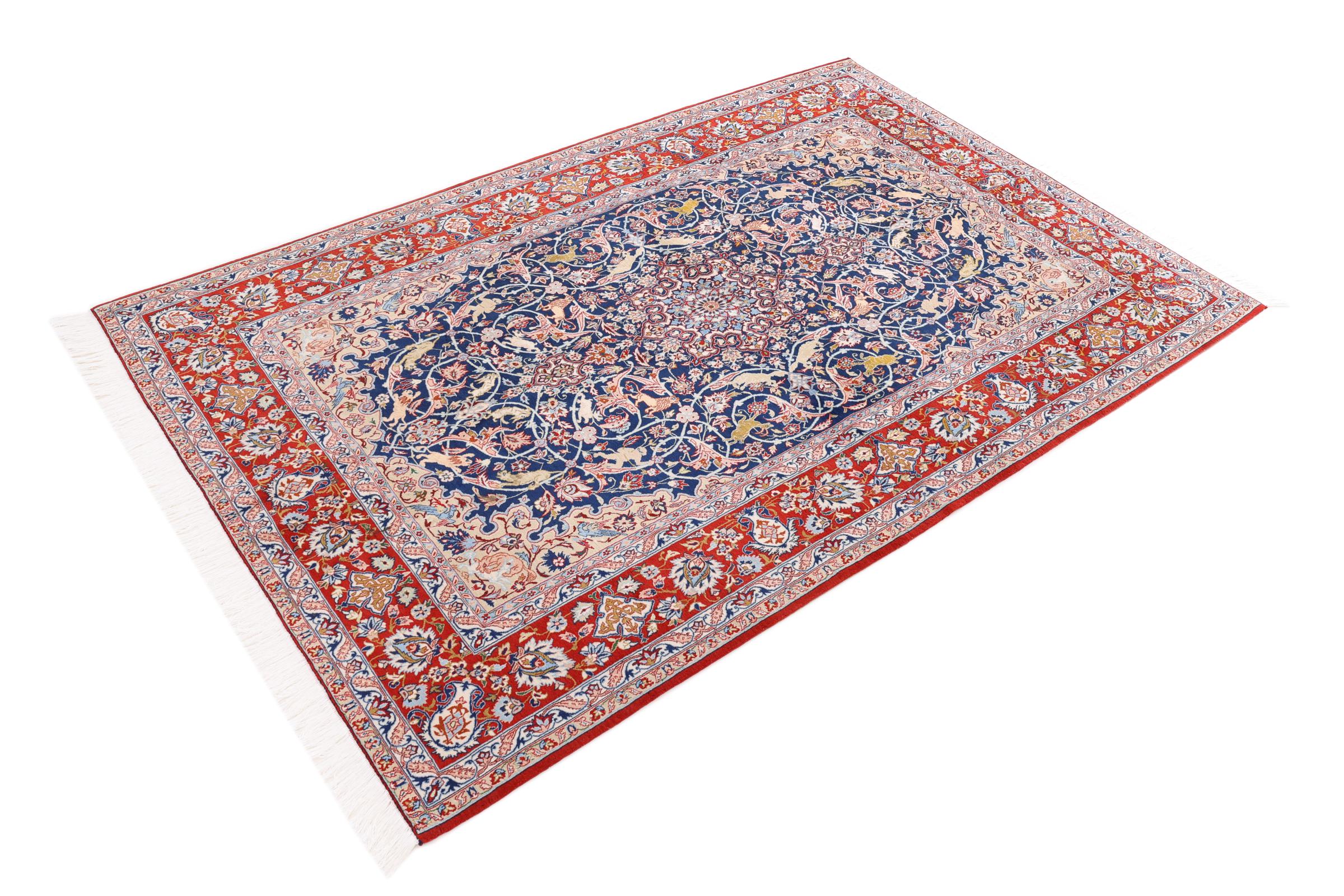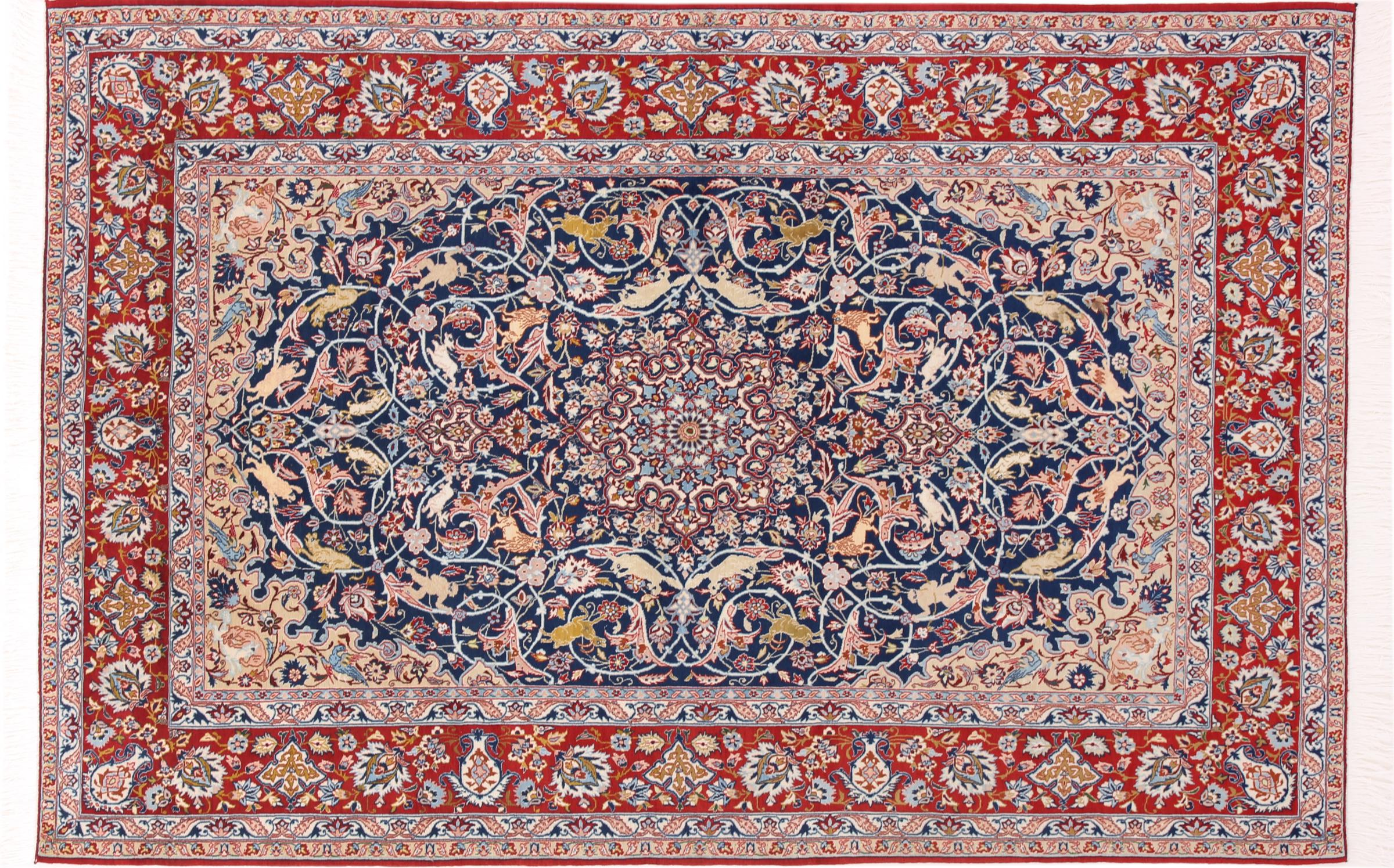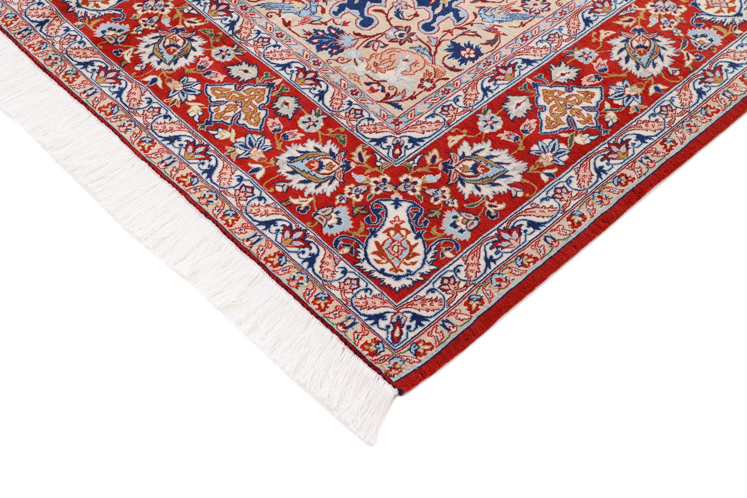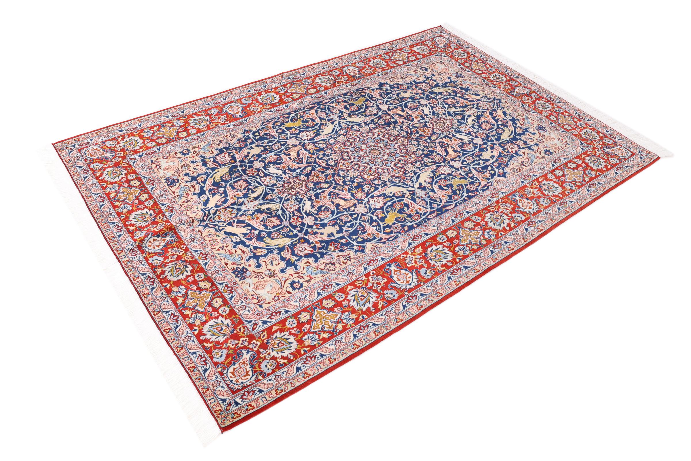 Dieser Isfahan Teppich ist aus traditioneller und höchster Knüpfkunst entstanden. Er wurde meisterlich gefertigt und mit den faszinierenden Ornamenten versehen. Der Perserteppich wurde in Isfahan, der wohl schönsten Stadt im Iran, aus feinstem Garn von Hand geknüpft. Isfahan Teppiche zählen zu den wertvollsten Persern und können eine echte Investition sein.