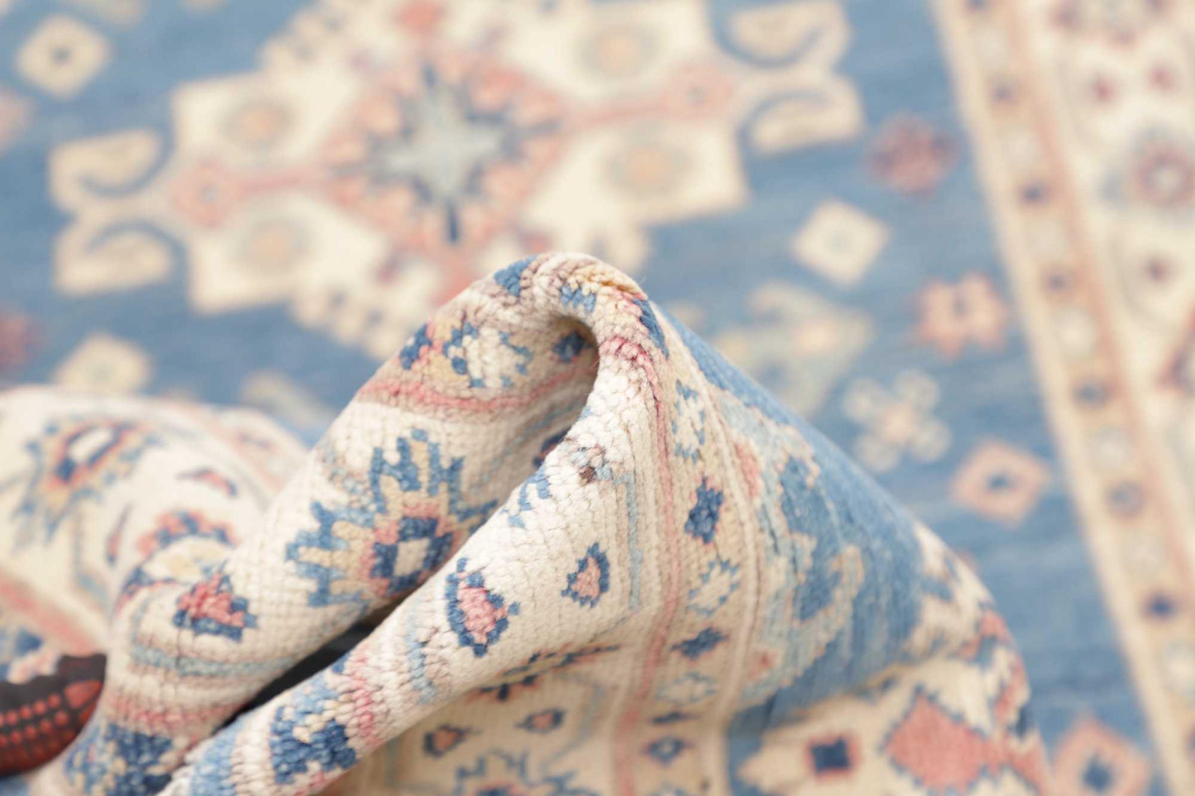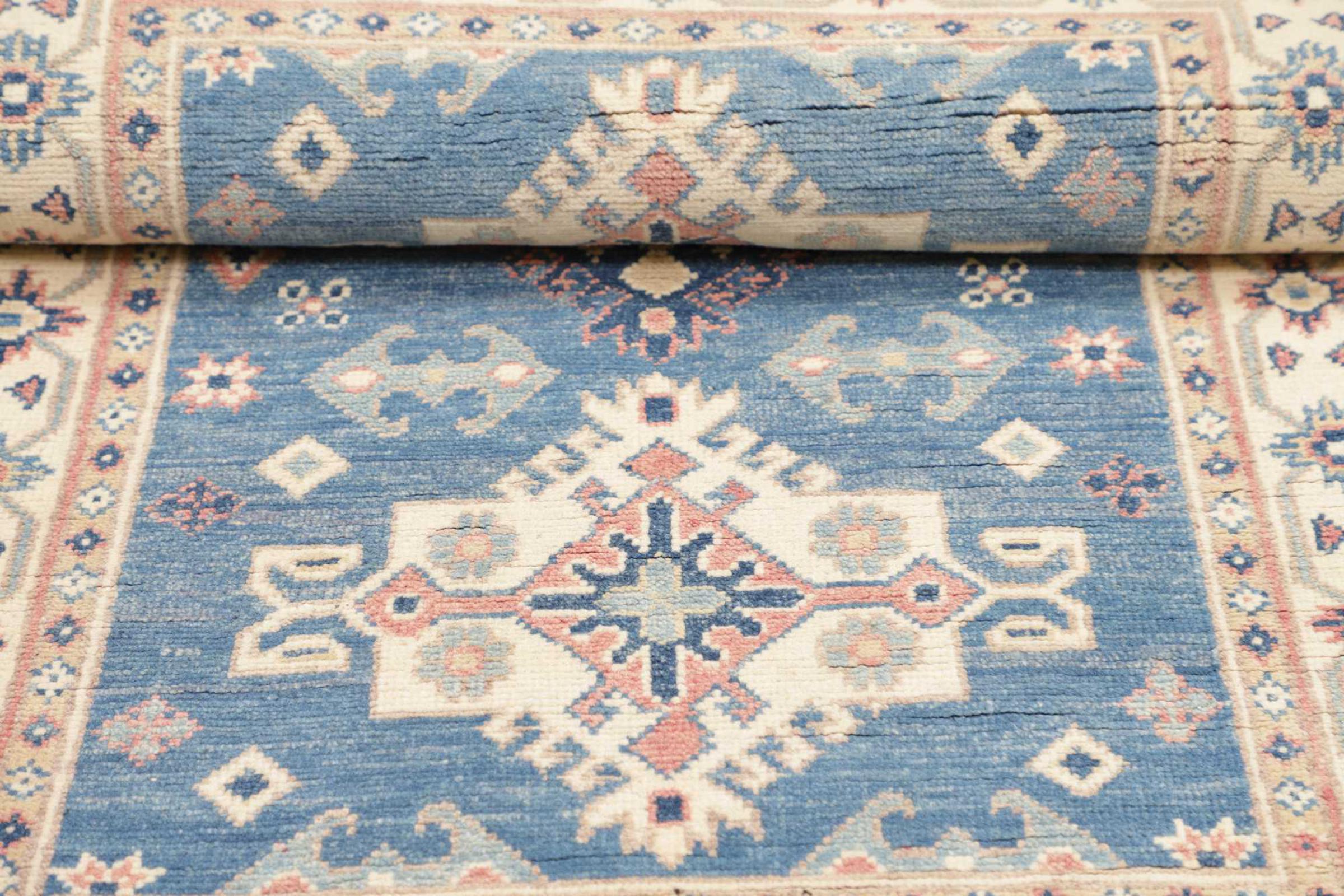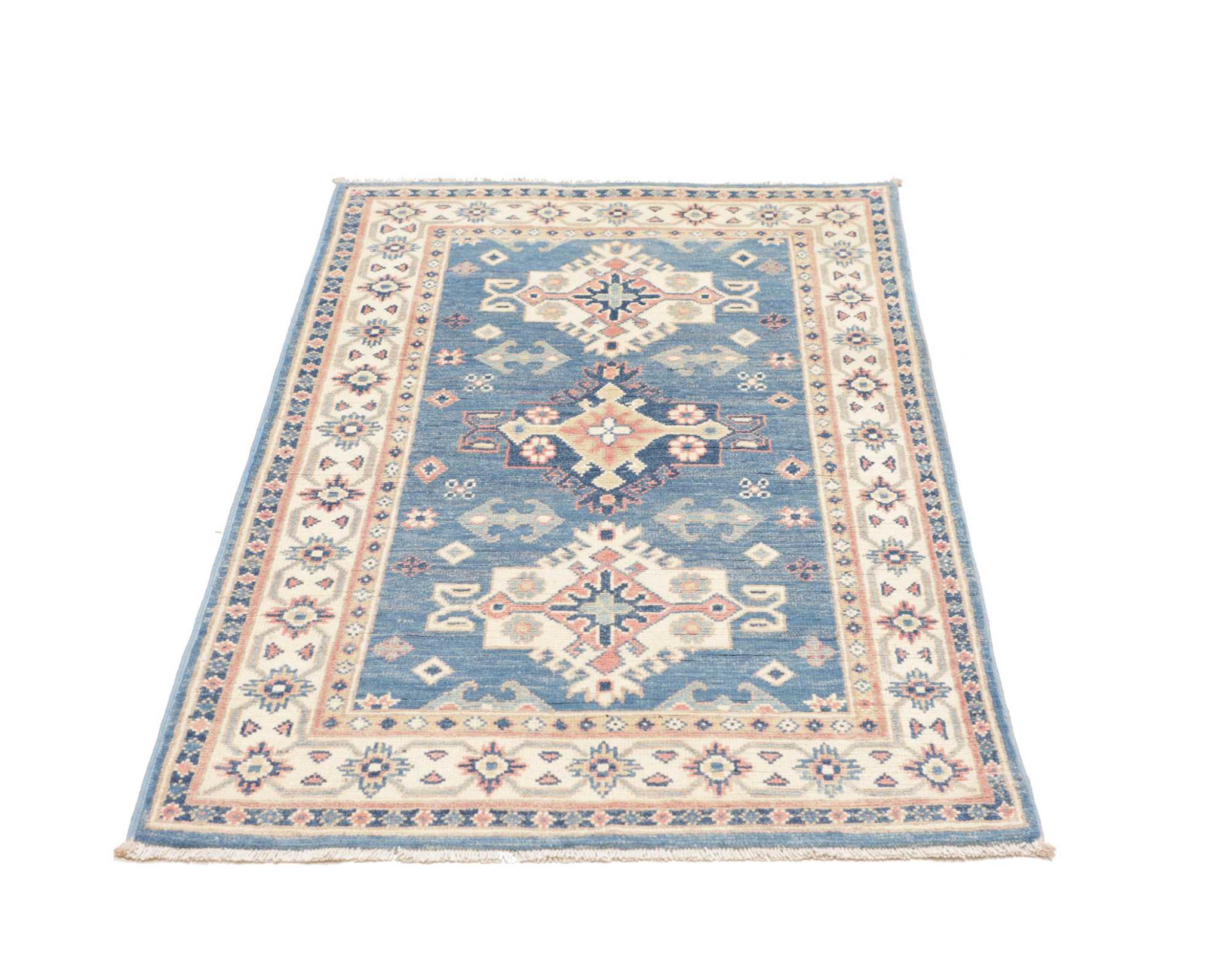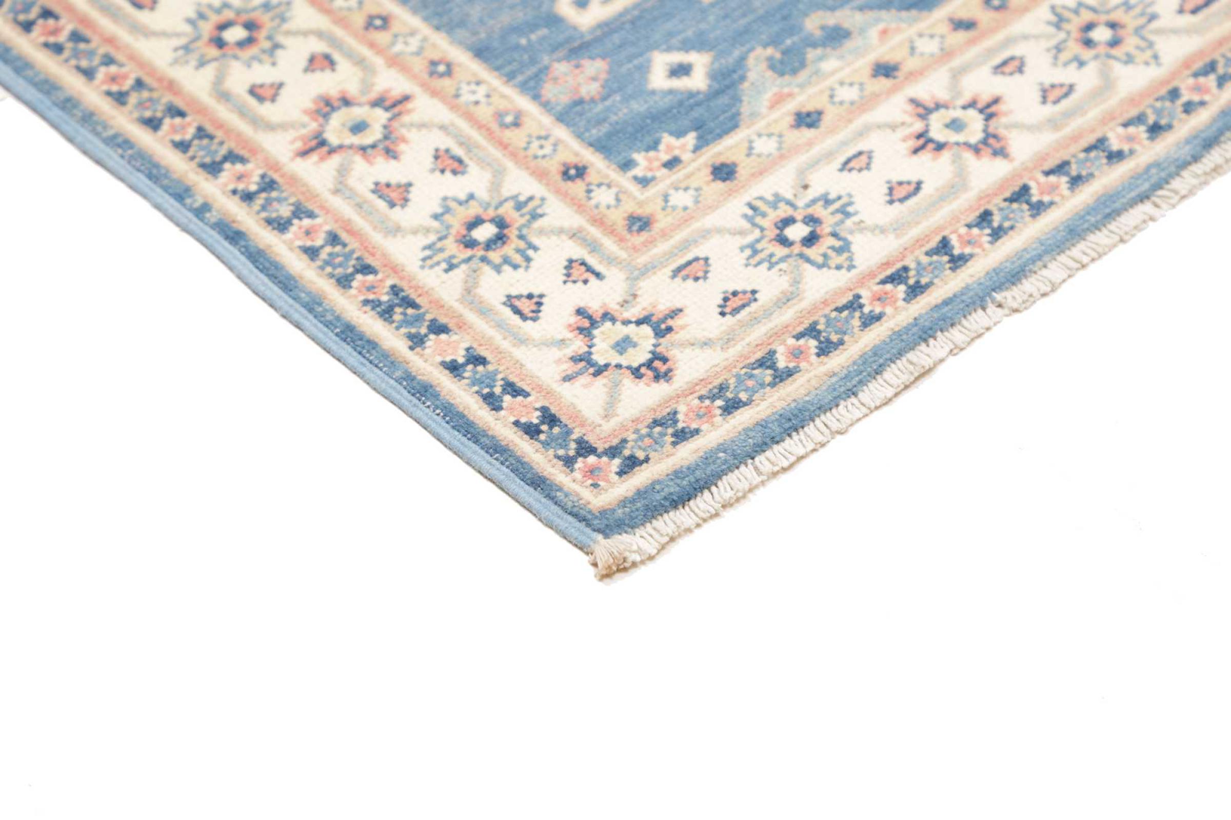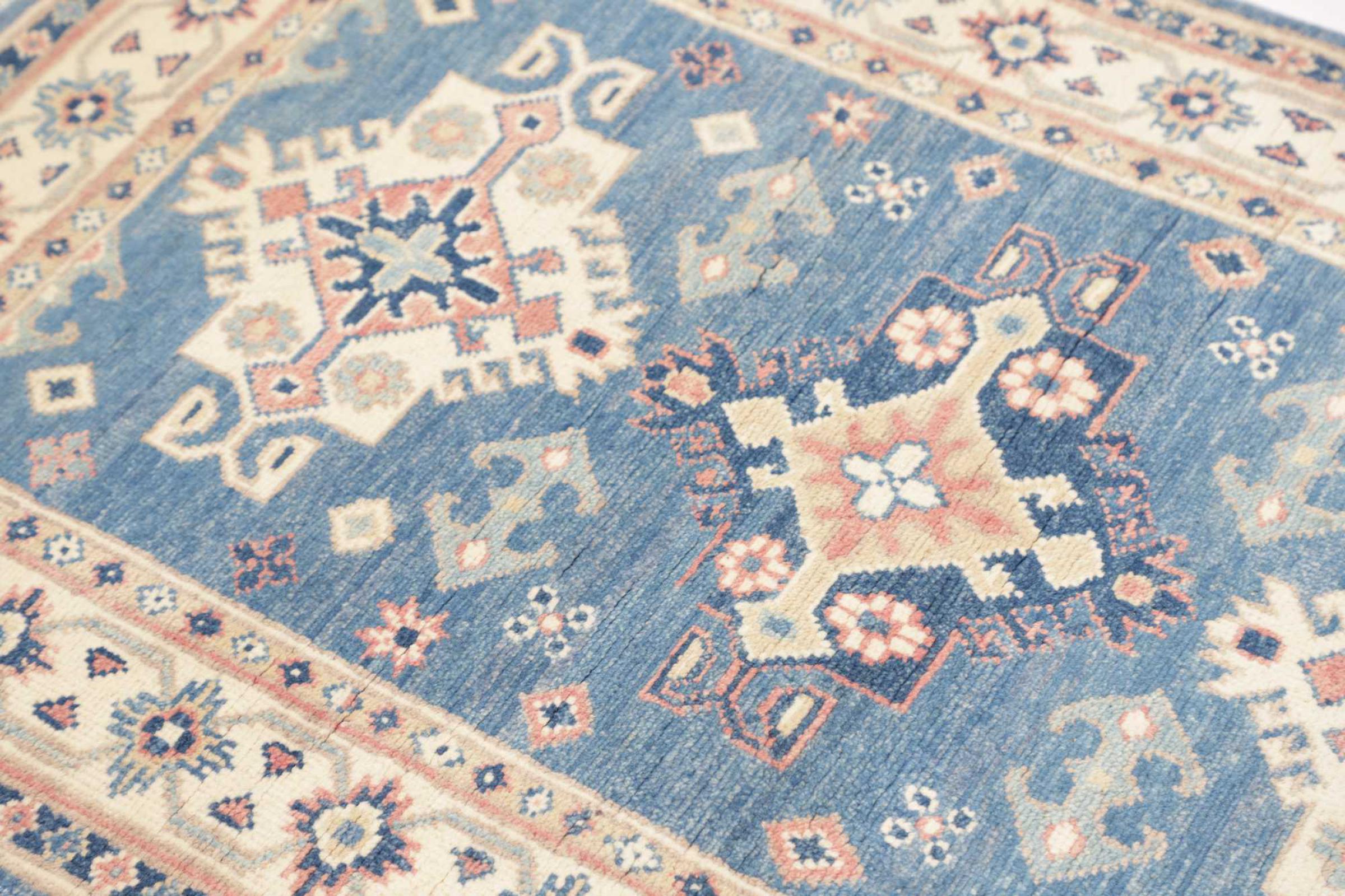 Dieser handgeknüpfte Kazak wurde im Stil der Kaukasus Teppiche von Hand geknüpft und überzeugt mit seiner hohen Robustheit und seinen lebhaften Farbtönen. Somit spiegelt er die Kultur des Kaukasus in einer wunderschönen Komposition wider. Eine Kultur, die seit Jahrhunderten die Kunst des Teppichknüpfens beherrscht und mit reizvoll schlichten Formen in beeindruckend lebendigen Farben nach Außen trägt.