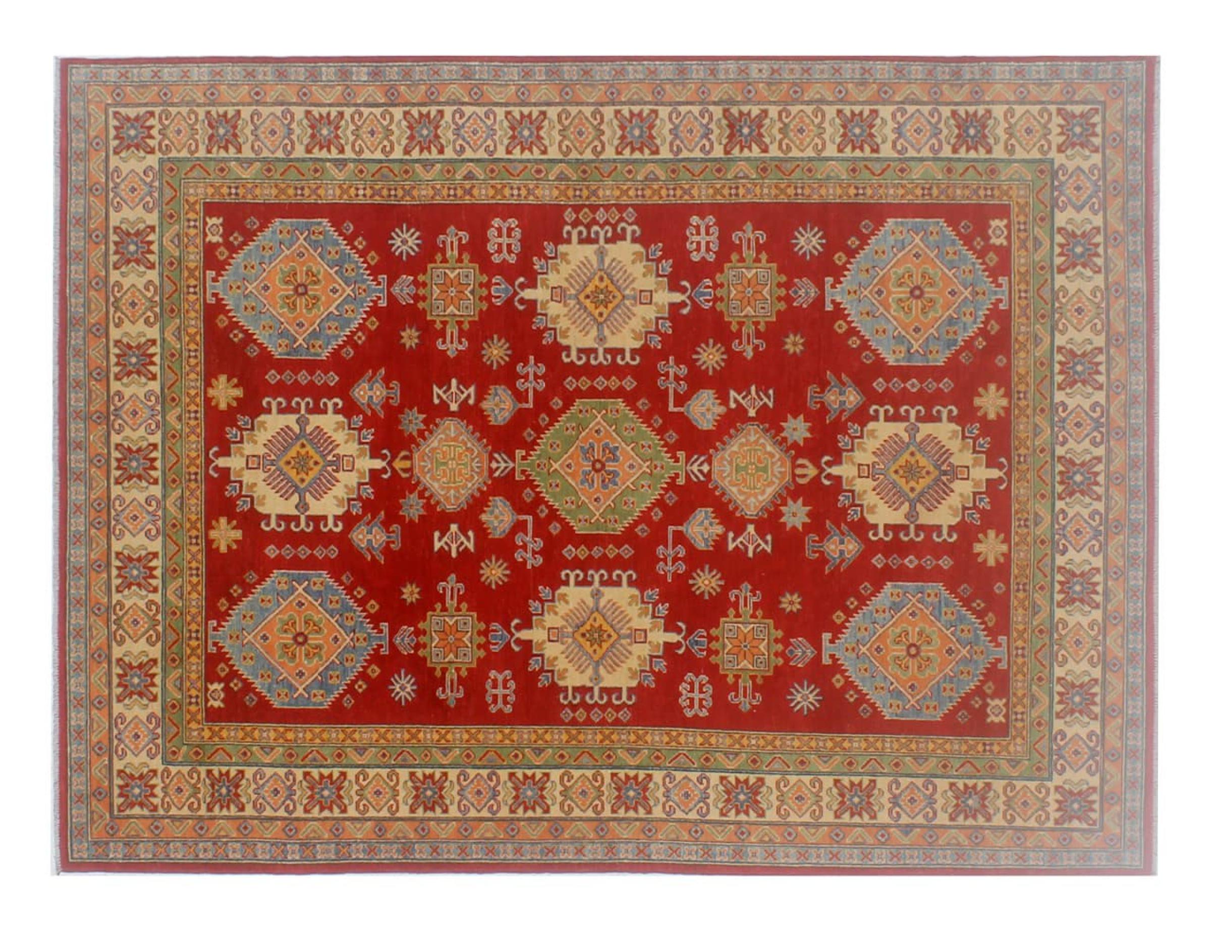 Dieser handgeknüpfte Kazak wurde im Stil der Kaukasus Teppiche von Hand geknüpft und überzeugt mit seiner hohen Robustheit und seinen lebhaften Farbtönen. Somit spiegelt er die Kultur des Kaukasus in einer wunderschönen Komposition wider. Eine Kultur, die seit Jahrhunderten die Kunst des Teppichknüpfens beherrscht und mit reizvoll schlichten Formen in beeindruckend lebendigen Farben nach Außen trägt.