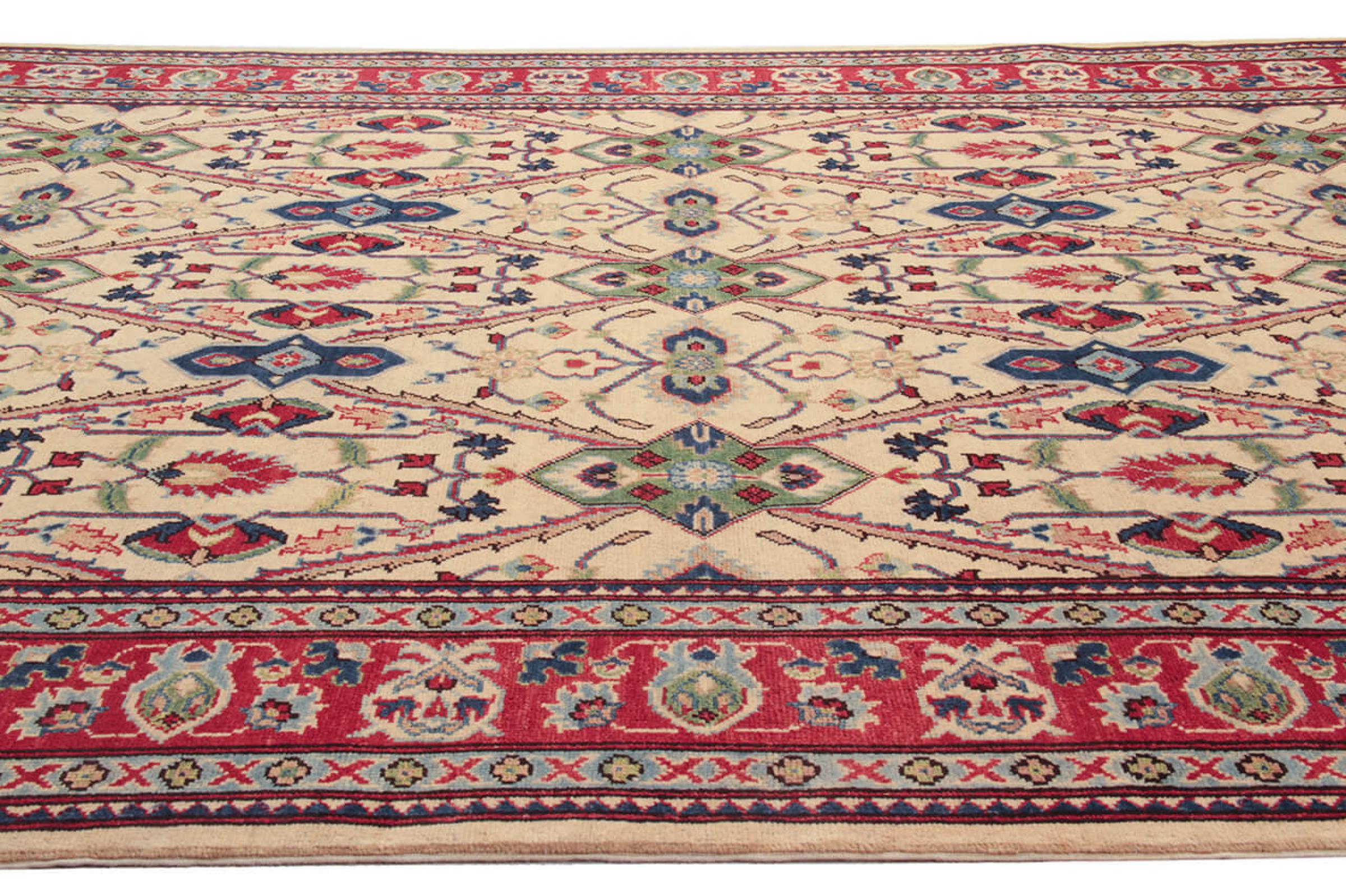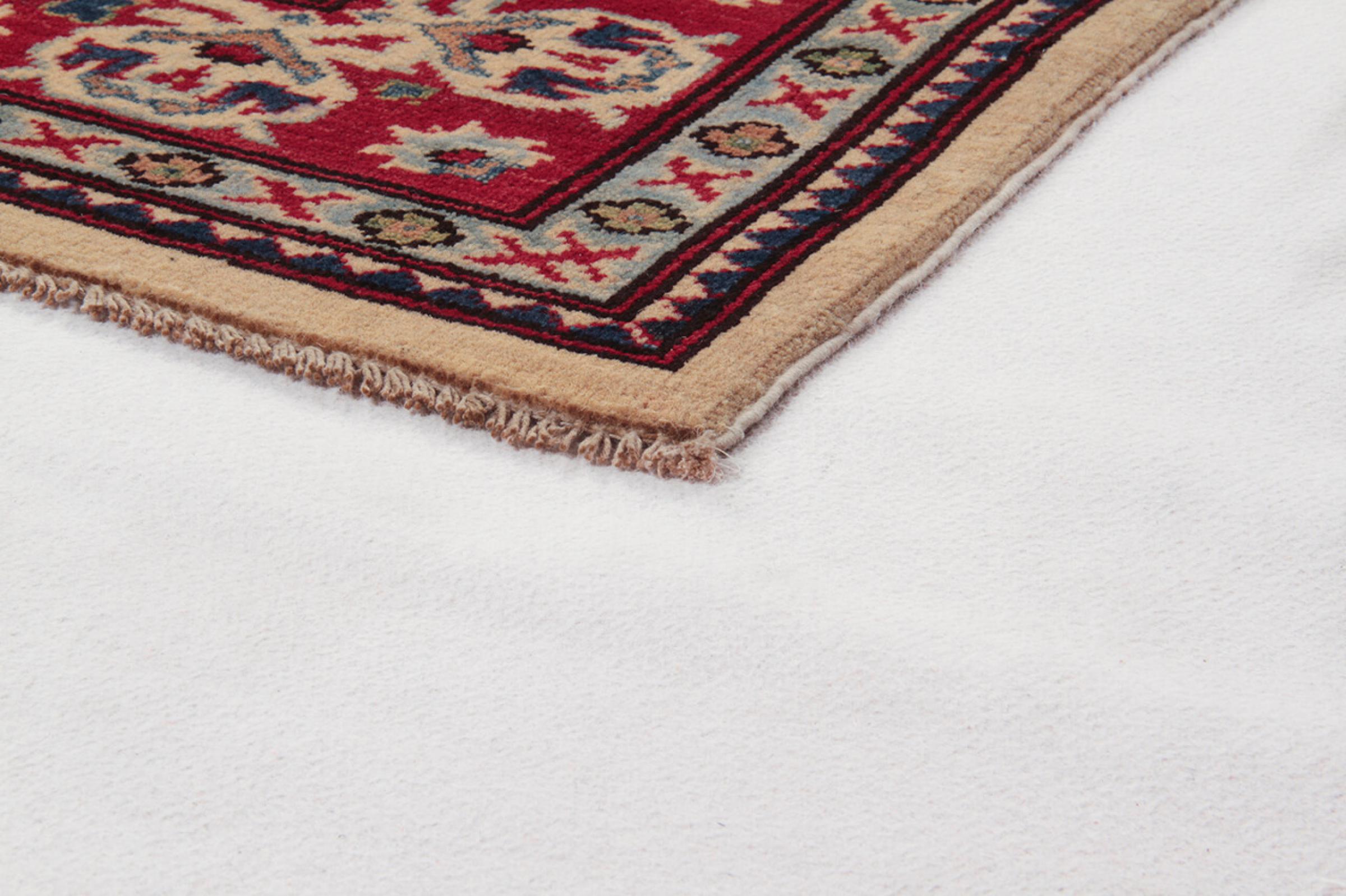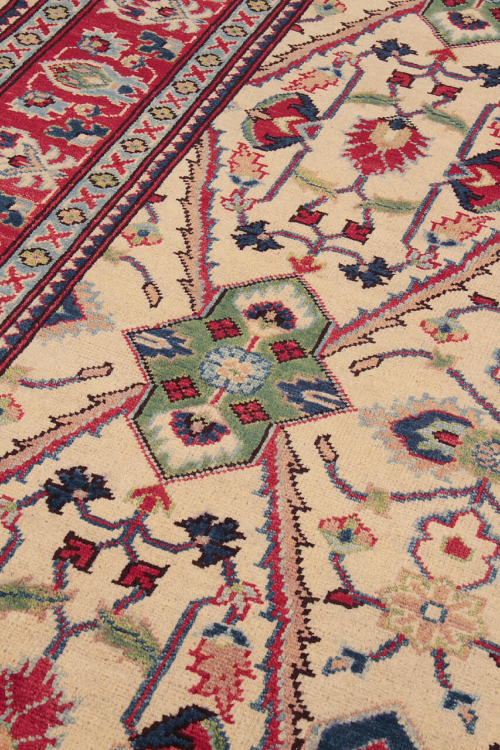 Dieser handgeknüpfte Kazak wurde im Stil der Kaukasus Teppiche von Hand geknüpft und überzeugt mit seiner hohen Robustheit und seinen lebhaften Farbtönen. Somit spiegelt er die Kultur des Kaukasus in einer wunderschönen Komposition wider. Eine Kultur, die seit Jahrhunderten die Kunst des Teppichknüpfens beherrscht und mit reizvoll schlichten Formen in beeindruckend lebendigen Farben nach Außen trägt.