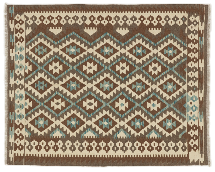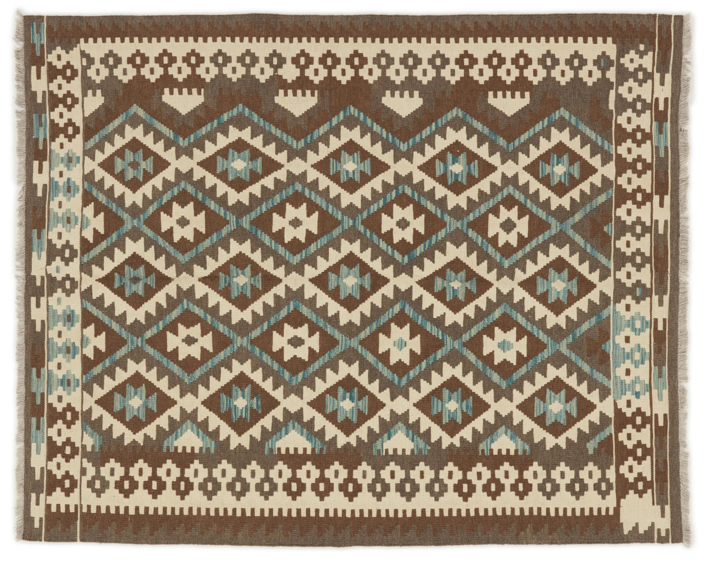 Dieser Teppich ist als Flachgewebe von Hand am Webstuhl gefertigt worden. Als Flachgewebe bezeichnet man Teppiche, die keinen Flor besitzen. Wie der Name verspricht, werden diese Teppiche gewebt und nicht geknotet. Dies hat einen flachen Teppich mit strukturierter Oberfläche zur Folge. Flachgewebe sind nicht so weich und meist dünner als geknüpfte Teppiche. Gleichzeitig sind sie deutlich weniger aufwändig in der Fertigung und lassen sich meist von beiden Seiten (Vorder- und Rückseite) auslegen. Ihre Muster sind in der Regel geometrisch, was durch das Gewebe bedingt ist.