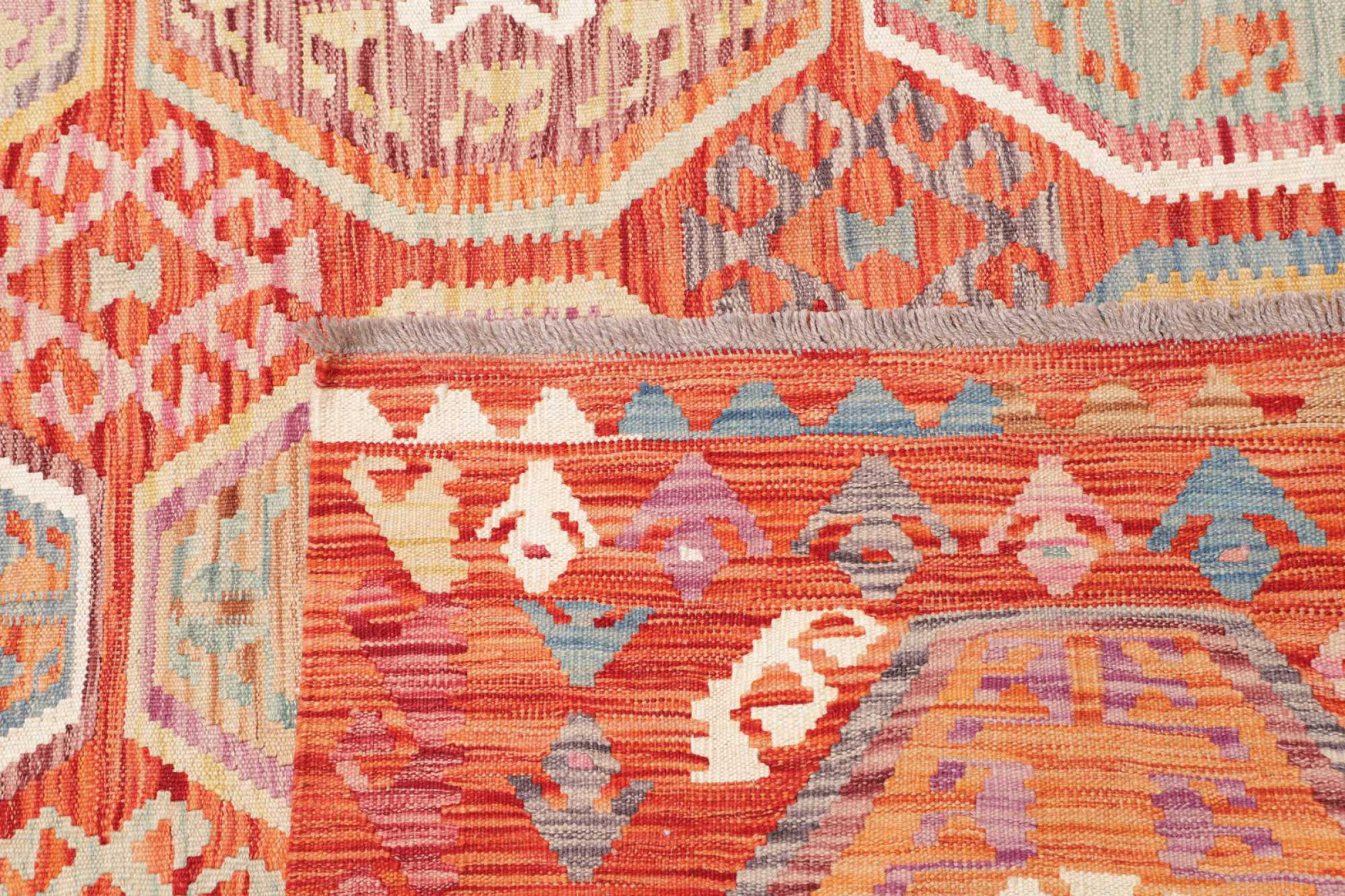 Dieser Teppich ist als Flachgewebe von Hand am Webstuhl gefertigt worden. Als Flachgewebe bezeichnet man Teppiche, die keinen Flor besitzen. Wie der Name verspricht, werden diese Teppiche gewebt und nicht geknotet. Dies hat einen flachen Teppich mit strukturierter Oberfläche zur Folge. Flachgewebe sind nicht so weich und meist dünner als geknüpfte Teppiche. Gleichzeitig sind sie deutlich weniger aufwändig in der Fertigung und lassen sich meist von beiden Seiten (Vorder- und Rückseite) auslegen. Ihre Muster sind in der Regel geometrisch, was durch das Gewebe bedingt ist.