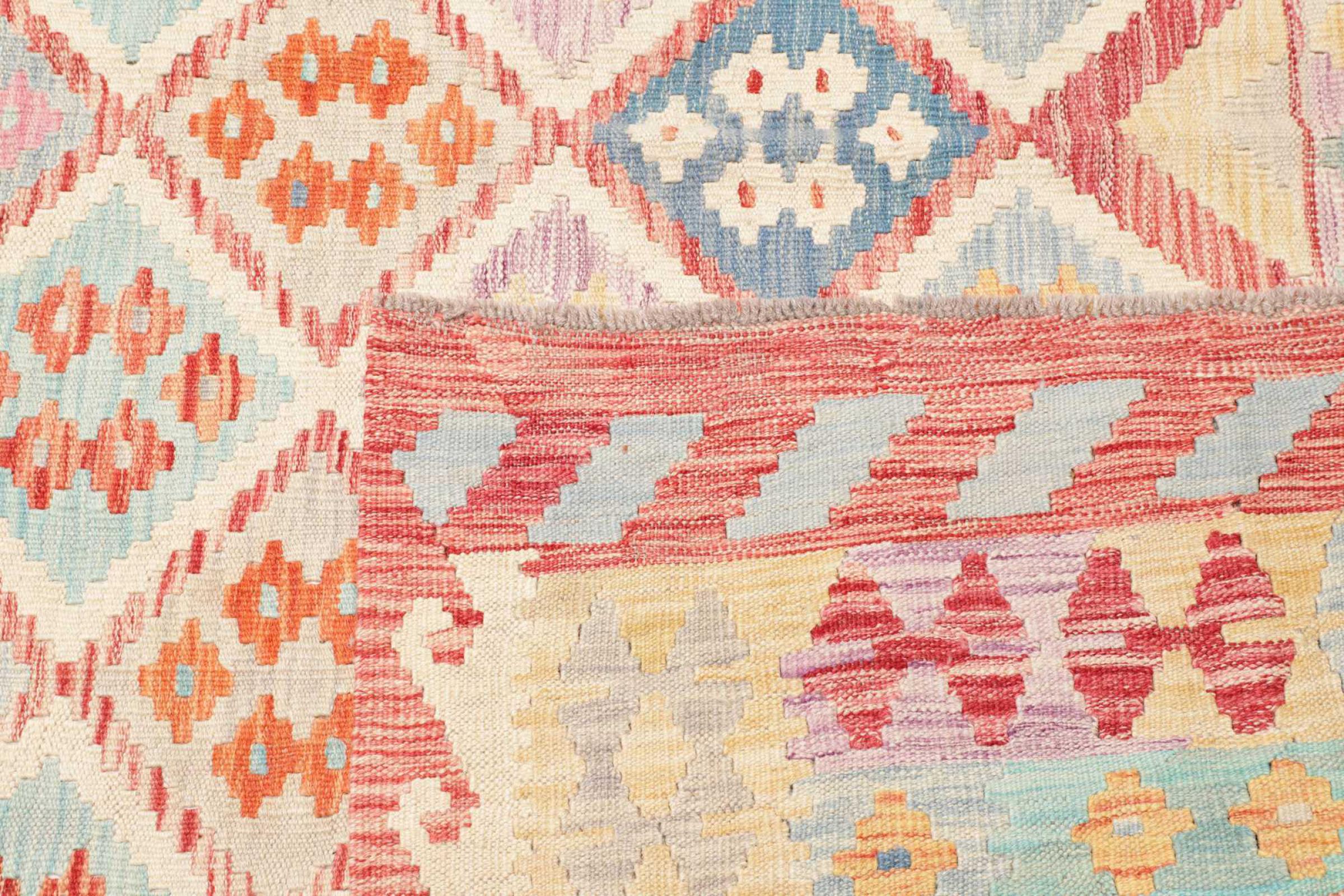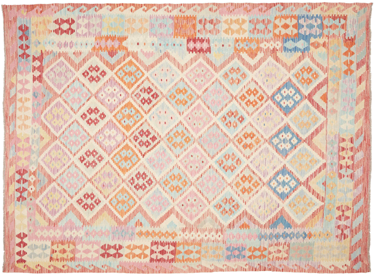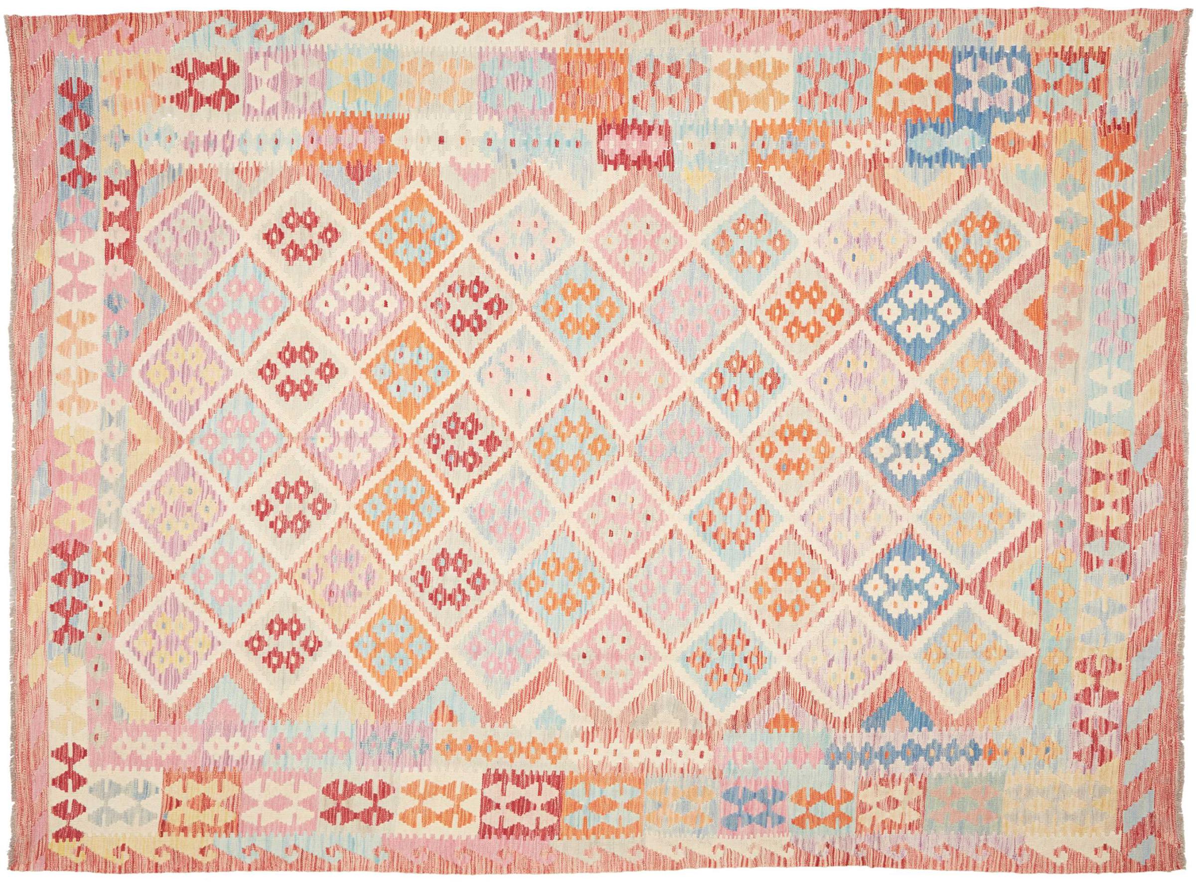 Dieser Teppich ist als Flachgewebe von Hand am Webstuhl gefertigt worden. Als Flachgewebe bezeichnet man Teppiche, die keinen Flor besitzen. Wie der Name verspricht, werden diese Teppiche gewebt und nicht geknotet. Dies hat einen flachen Teppich mit strukturierter Oberfläche zur Folge. Flachgewebe sind nicht so weich und meist dünner als geknüpfte Teppiche. Gleichzeitig sind sie deutlich weniger aufwändig in der Fertigung und lassen sich meist von beiden Seiten (Vorder- und Rückseite) auslegen. Ihre Muster sind in der Regel geometrisch, was durch das Gewebe bedingt ist.