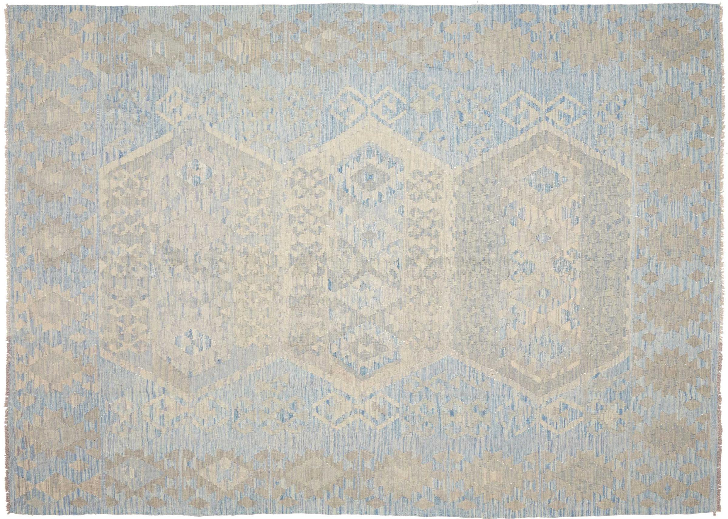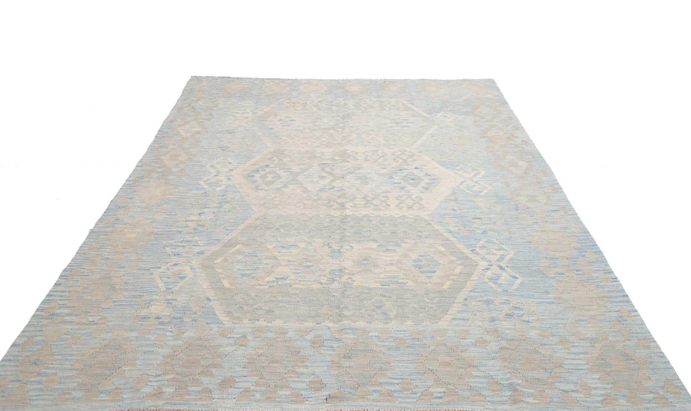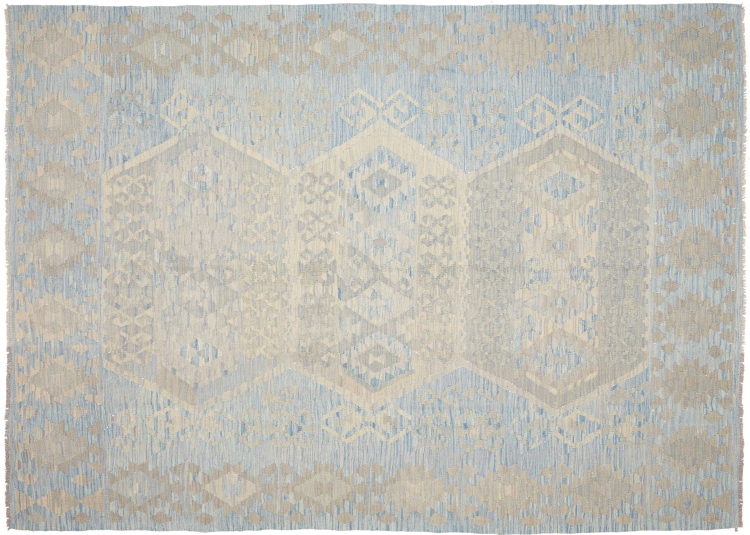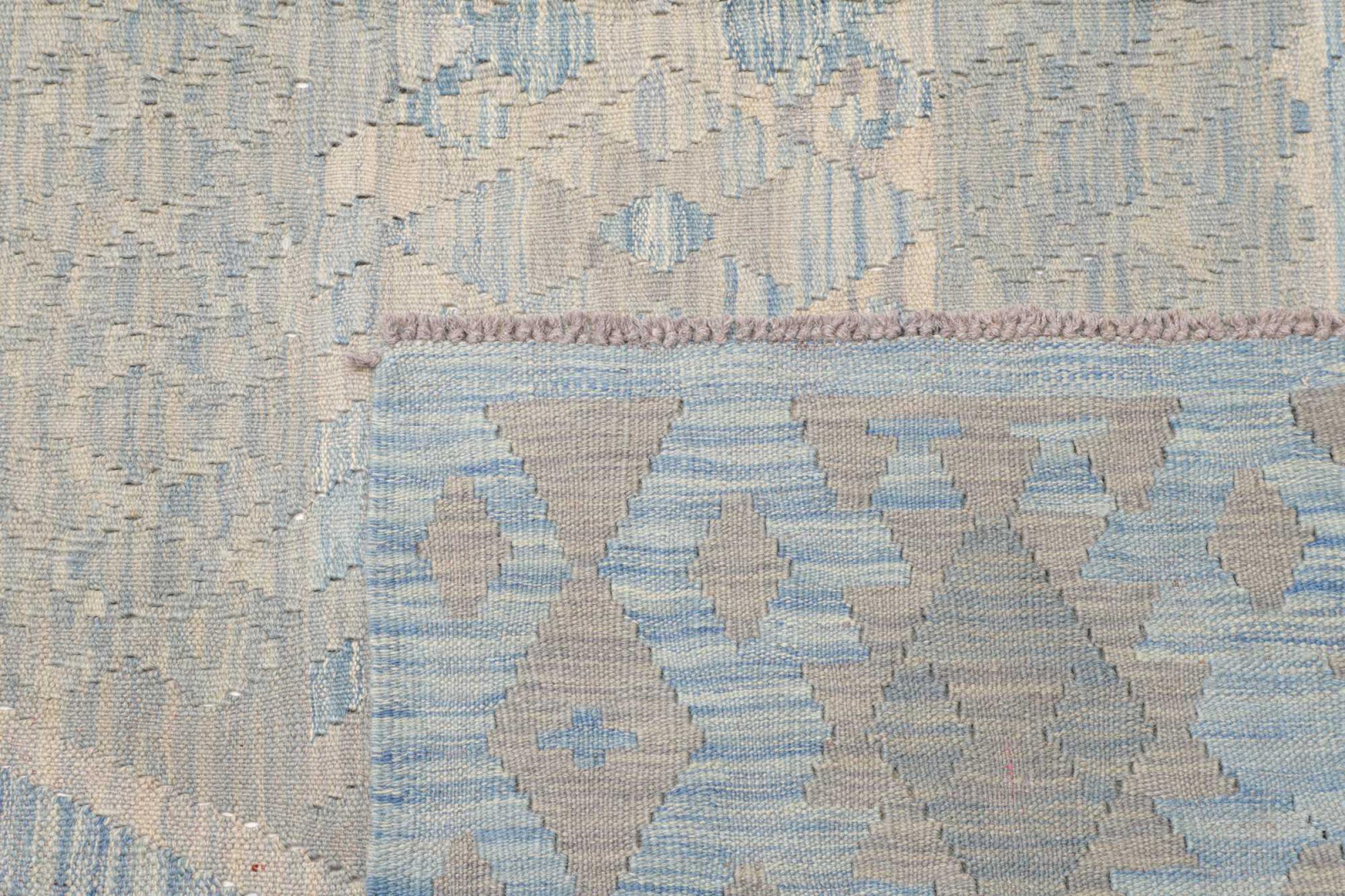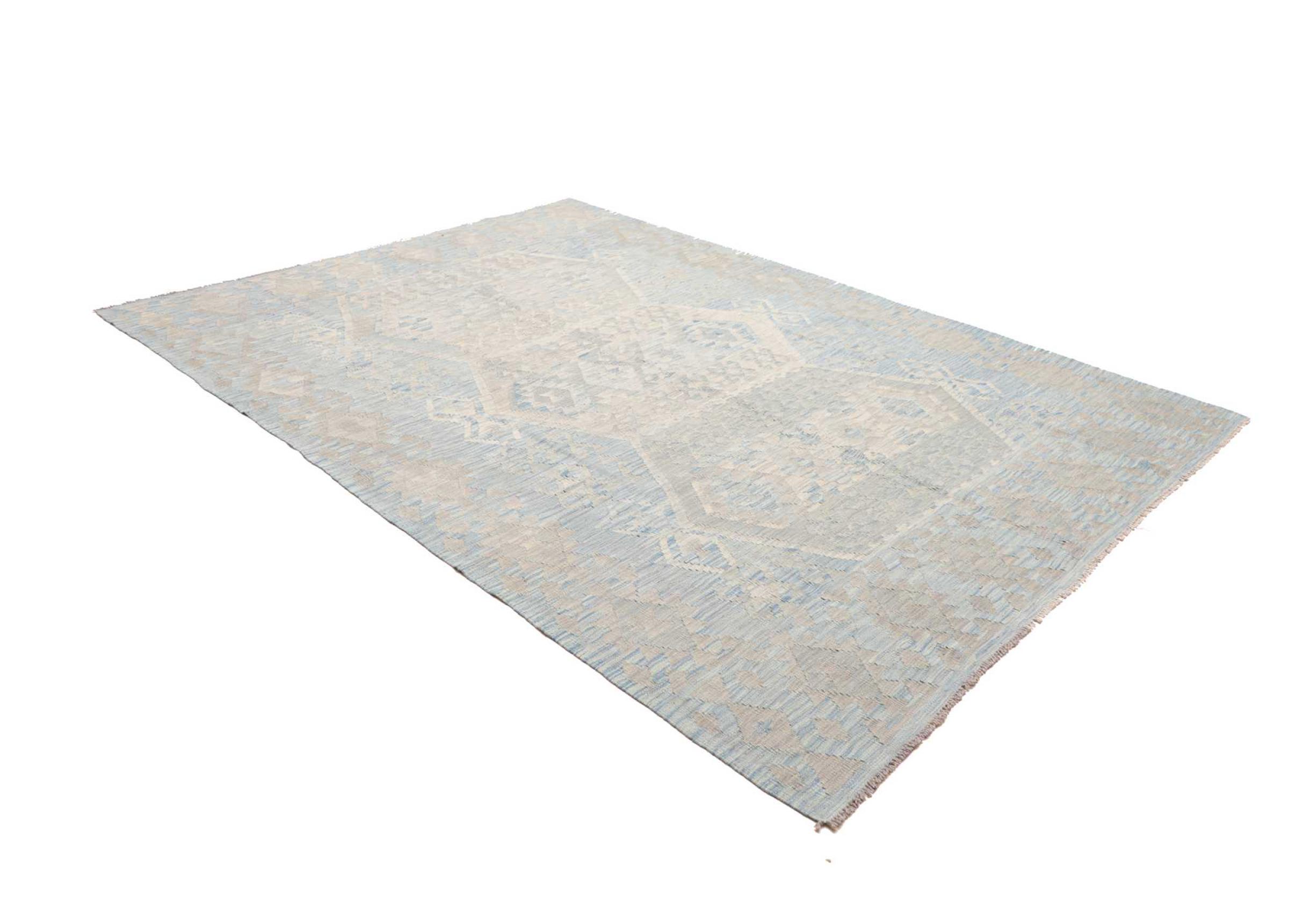 Dieser Teppich ist als Flachgewebe von Hand am Webstuhl gefertigt worden. Als Flachgewebe bezeichnet man Teppiche, die keinen Flor besitzen. Wie der Name verspricht, werden diese Teppiche gewebt und nicht geknotet. Dies hat einen flachen Teppich mit strukturierter Oberfläche zur Folge. Flachgewebe sind nicht so weich und meist dünner als geknüpfte Teppiche. Gleichzeitig sind sie deutlich weniger aufwändig in der Fertigung und lassen sich meist von beiden Seiten (Vorder- und Rückseite) auslegen. Ihre Muster sind in der Regel geometrisch, was durch das Gewebe bedingt ist.