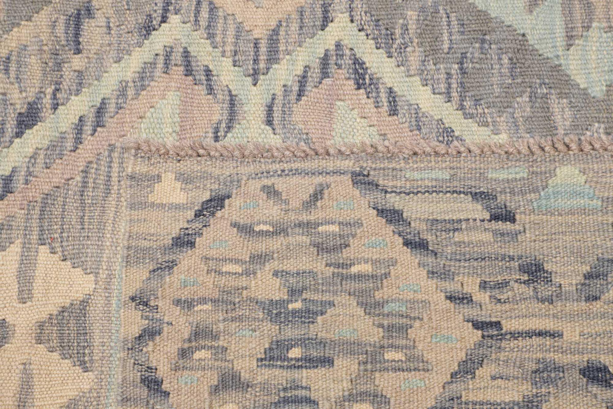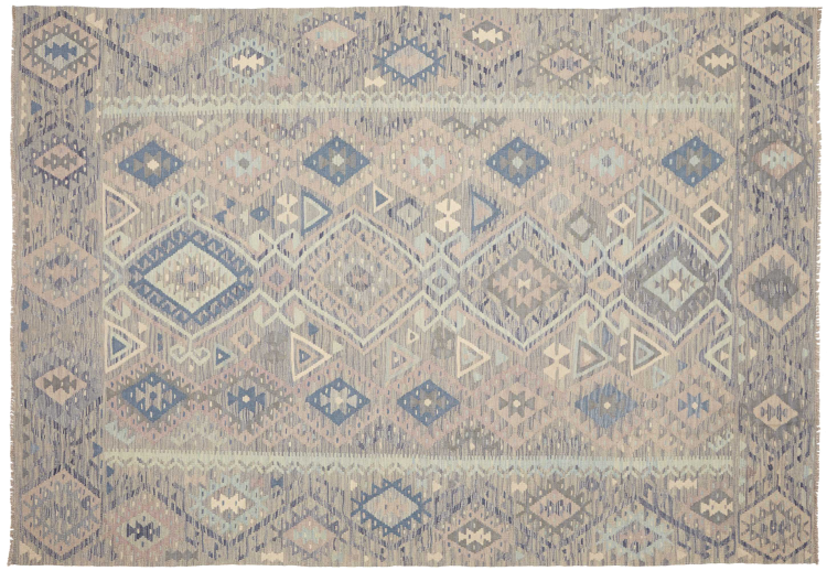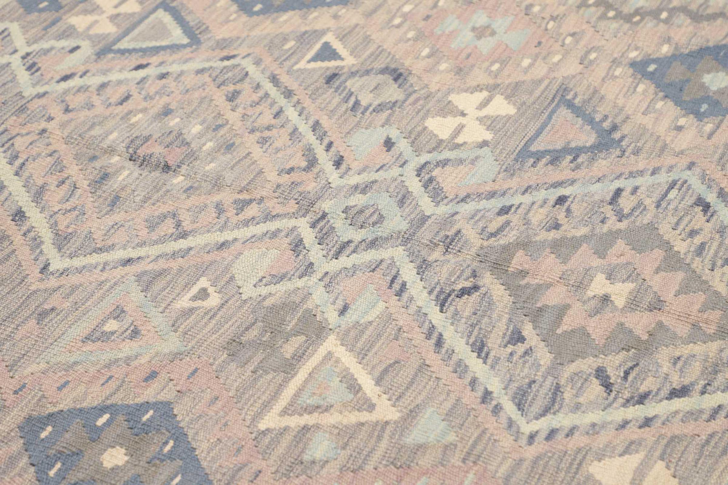 Dieser Teppich ist als Flachgewebe von Hand am Webstuhl gefertigt worden. Als Flachgewebe bezeichnet man Teppiche, die keinen Flor besitzen. Wie der Name verspricht, werden diese Teppiche gewebt und nicht geknotet. Dies hat einen flachen Teppich mit strukturierter Oberfläche zur Folge. Flachgewebe sind nicht so weich und meist dünner als geknüpfte Teppiche. Gleichzeitig sind sie deutlich weniger aufwändig in der Fertigung und lassen sich meist von beiden Seiten (Vorder- und Rückseite) auslegen. Ihre Muster sind in der Regel geometrisch, was durch das Gewebe bedingt ist.