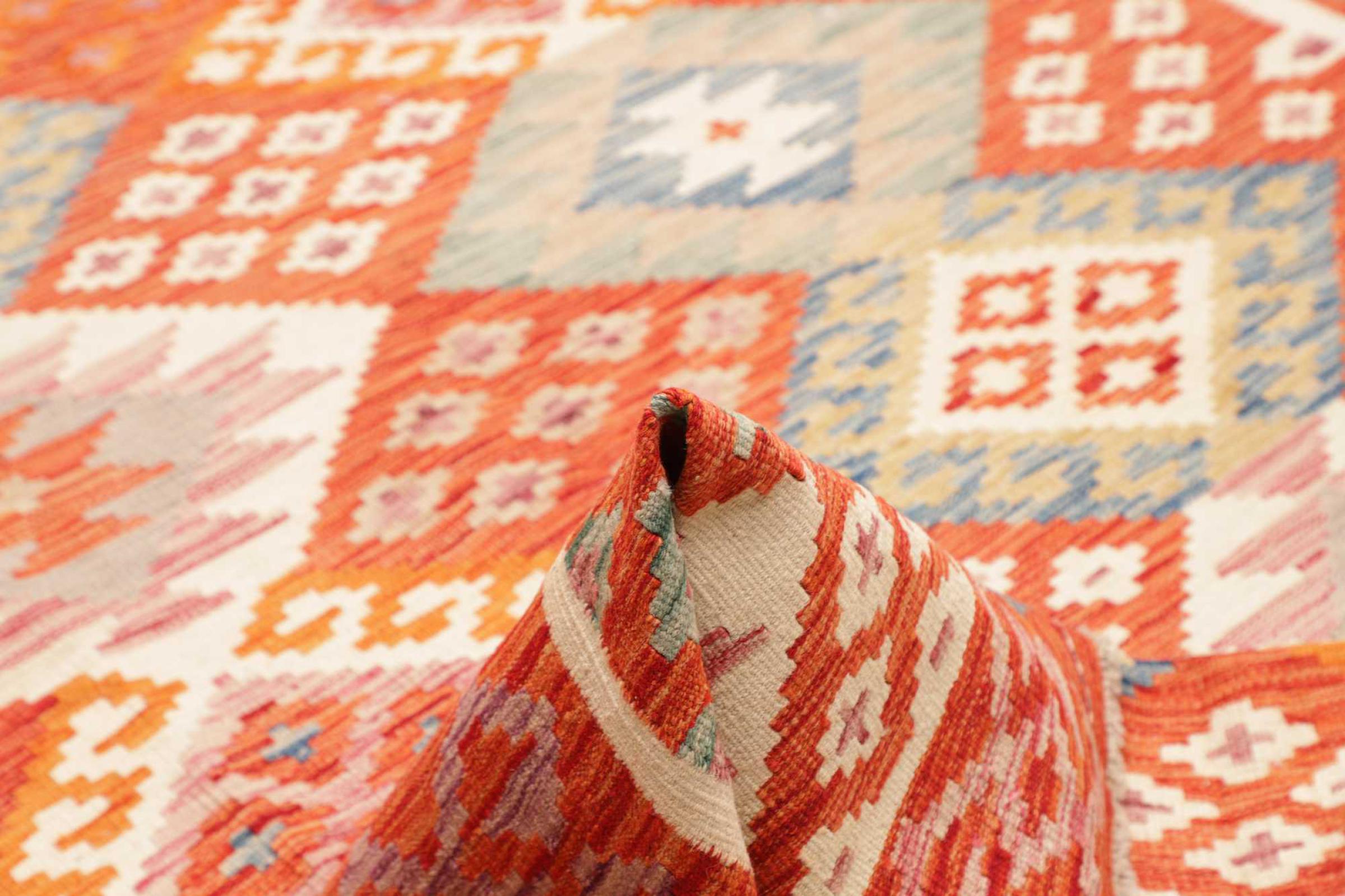 Dieser Teppich ist als Flachgewebe von Hand am Webstuhl gefertigt worden. Als Flachgewebe bezeichnet man Teppiche, die keinen Flor besitzen. Wie der Name verspricht, werden diese Teppiche gewebt und nicht geknotet. Dies hat einen flachen Teppich mit strukturierter Oberfläche zur Folge. Flachgewebe sind nicht so weich und meist dünner als geknüpfte Teppiche. Gleichzeitig sind sie deutlich weniger aufwändig in der Fertigung und lassen sich meist von beiden Seiten (Vorder- und Rückseite) auslegen. Ihre Muster sind in der Regel geometrisch, was durch das Gewebe bedingt ist.