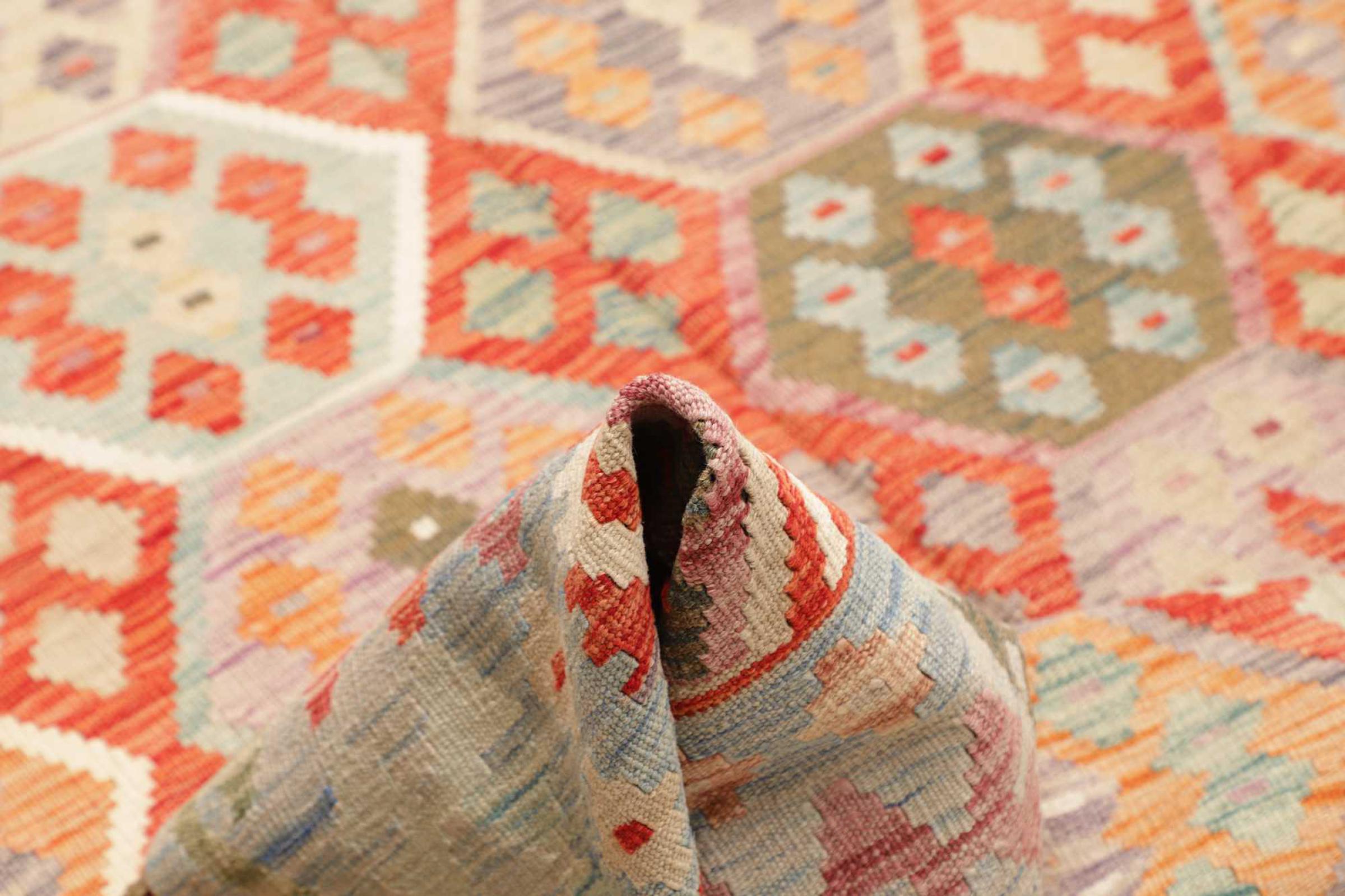Dieser Teppich ist als Flachgewebe von Hand am Webstuhl gefertigt worden. Als Flachgewebe bezeichnet man Teppiche, die keinen Flor besitzen. Wie der Name verspricht, werden diese Teppiche gewebt und nicht geknotet. Dies hat einen flachen Teppich mit strukturierter Oberfläche zur Folge. Flachgewebe sind nicht so weich und meist dünner als geknüpfte Teppiche. Gleichzeitig sind sie deutlich weniger aufwändig in der Fertigung und lassen sich meist von beiden Seiten (Vorder- und Rückseite) auslegen. Ihre Muster sind in der Regel geometrisch, was durch das Gewebe bedingt ist.