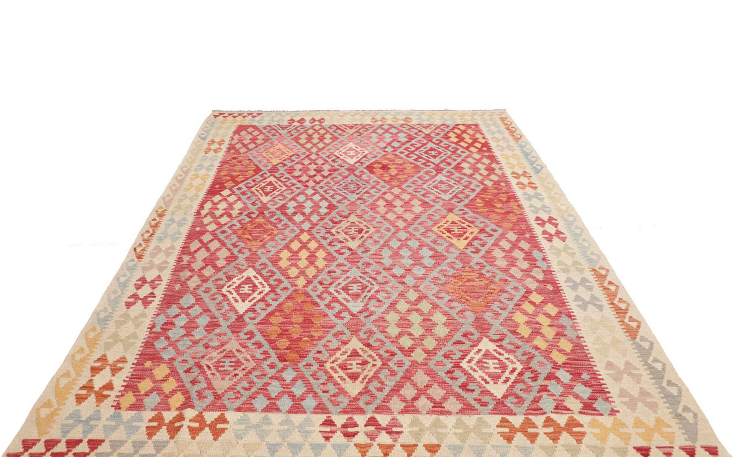Dieser Teppich ist als Flachgewebe von Hand am Webstuhl gefertigt worden. Als Flachgewebe bezeichnet man Teppiche, die keinen Flor besitzen. Wie der Name verspricht, werden diese Teppiche gewebt und nicht geknotet. Dies hat einen flachen Teppich mit strukturierter Oberfläche zur Folge. Flachgewebe sind nicht so weich und meist dünner als geknüpfte Teppiche. Gleichzeitig sind sie deutlich weniger aufwändig in der Fertigung und lassen sich meist von beiden Seiten (Vorder- und Rückseite) auslegen. Ihre Muster sind in der Regel geometrisch, was durch das Gewebe bedingt ist.
