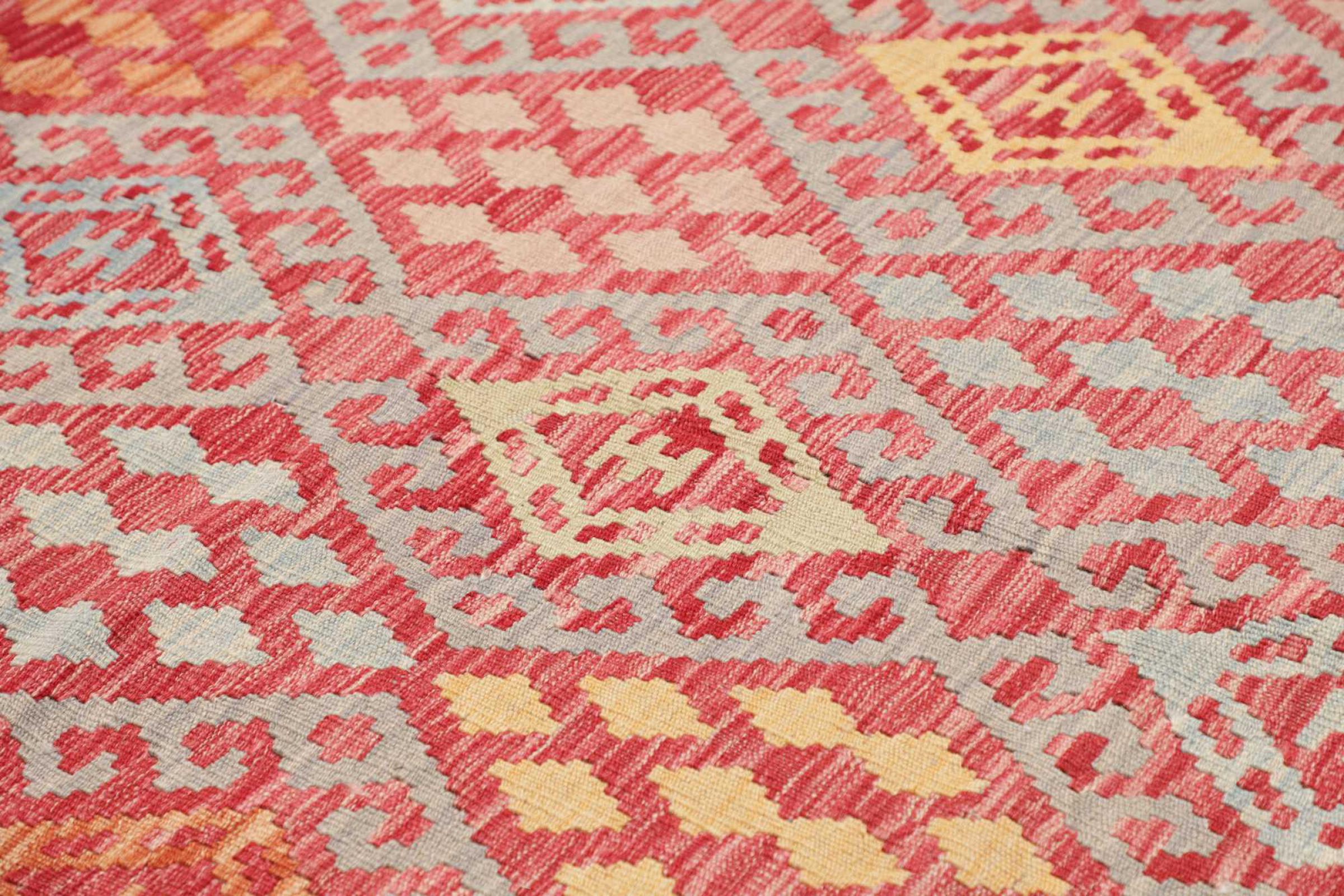 Diese Kelim Teppiche weisen einen entscheidenden Unterschied zu handgeknüpften Teppichen auf - sie werden von Hand gewebt. So besitzen sie keinen hochstehenden Flor aus Wolle und sind oft flacher und rauer als geknüpfte Wollteppiche. Ihre Machart ist weniger aufwändig und so sind sie in der Regel auf deutlich kostengünstiger. Als Vorteil sind Kelim Teppiche zudem viel leichter und können von der Vorder- und Rückseite ausgelegt werden. Handgewebte Kelims stammen ursprünglich aus dem ehemaligen Persien und werden heute auch viel in Afghanistan gefertigt. Sie haben eher schlichte geradlinige Muster, die durch ihre Webtechnik bedingt sind.