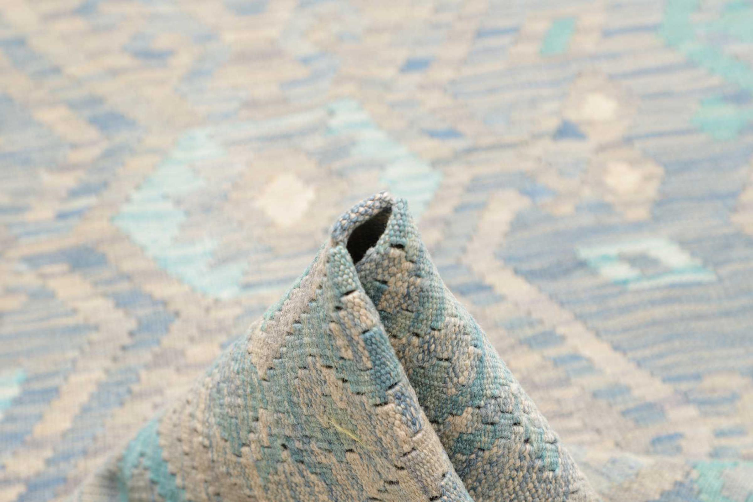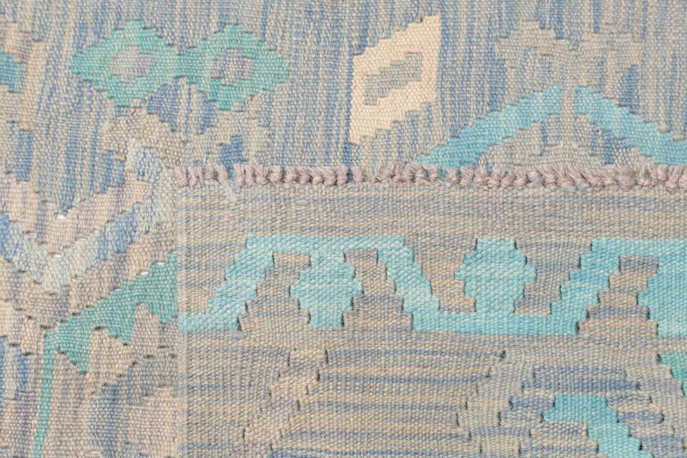 Dieser Teppich ist als Flachgewebe von Hand am Webstuhl gefertigt worden. Als Flachgewebe bezeichnet man Teppiche, die keinen Flor besitzen. Wie der Name verspricht, werden diese Teppiche gewebt und nicht geknotet. Dies hat einen flachen Teppich mit strukturierter Oberfläche zur Folge. Flachgewebe sind nicht so weich und meist dünner als geknüpfte Teppiche. Gleichzeitig sind sie deutlich weniger aufwändig in der Fertigung und lassen sich meist von beiden Seiten (Vorder- und Rückseite) auslegen. Ihre Muster sind in der Regel geometrisch, was durch das Gewebe bedingt ist.