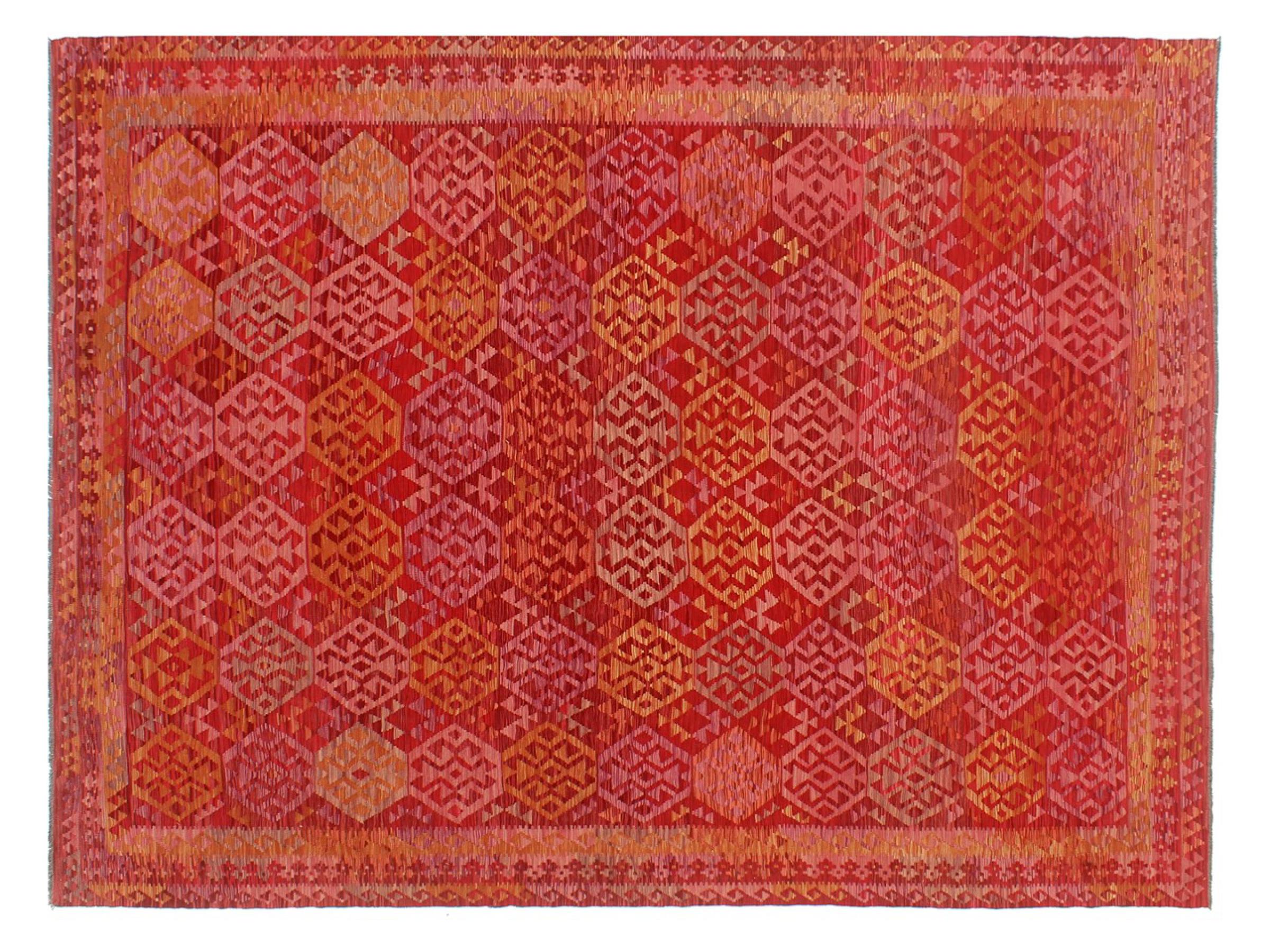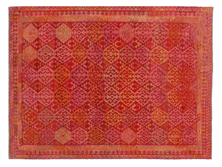 Dieser Teppich ist als Flachgewebe von Hand am Webstuhl gefertigt worden. Als Flachgewebe bezeichnet man Teppiche, die keinen Flor besitzen. Wie der Name verspricht, werden diese Teppiche gewebt und nicht geknotet. Dies hat einen flachen Teppich mit strukturierter Oberfläche zur Folge. Flachgewebe sind nicht so weich und meist dünner als geknüpfte Teppiche. Gleichzeitig sind sie deutlich weniger aufwändig in der Fertigung und lassen sich meist von beiden Seiten (Vorder- und Rückseite) auslegen. Ihre Muster sind in der Regel geometrisch, was durch das Gewebe bedingt ist.