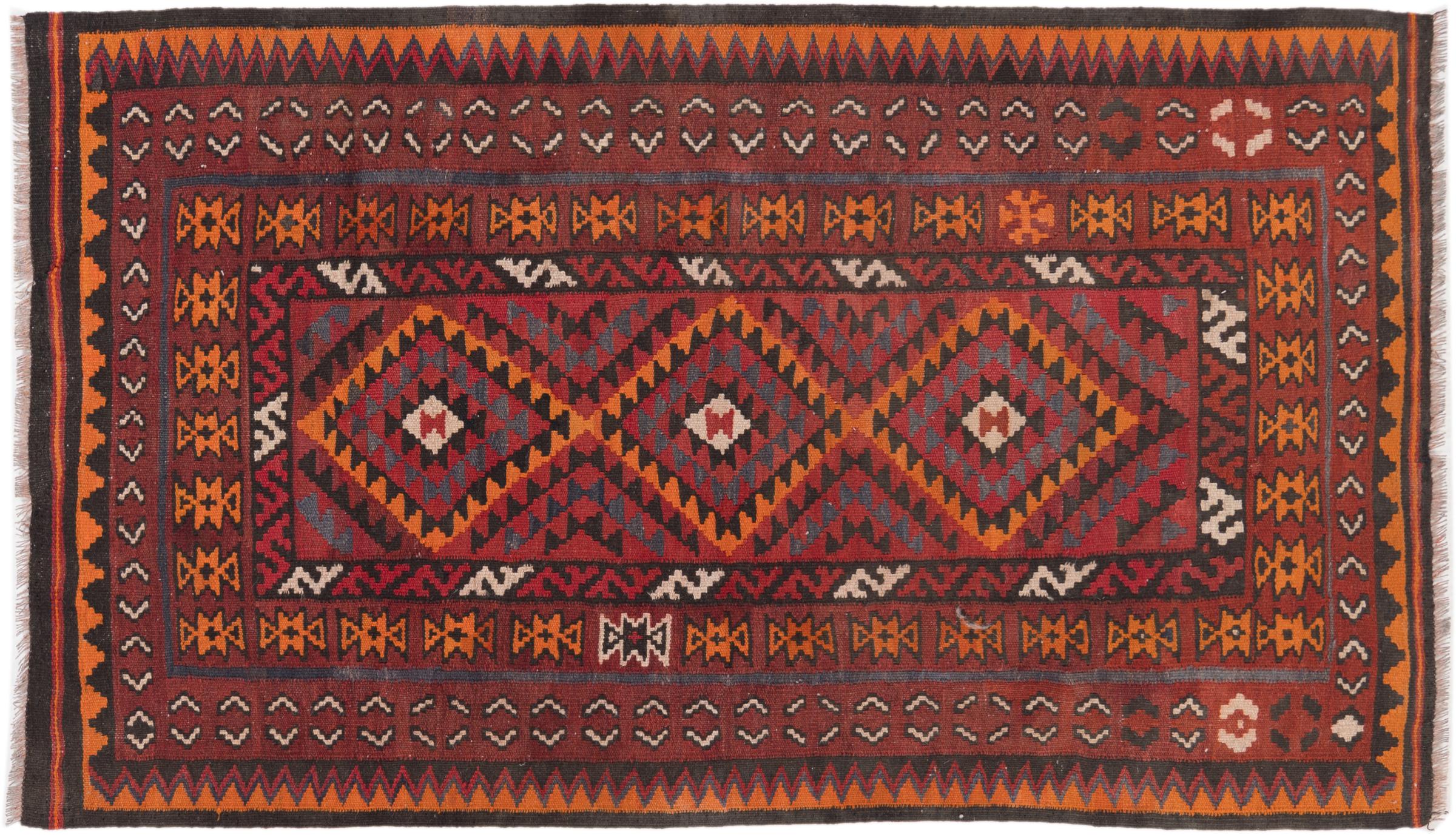Dieser Teppich ist als Flachgewebe von Hand am Webstuhl gefertigt worden. Als Flachgewebe bezeichnet man Teppiche, die keinen Flor besitzen. Wie der Name verspricht, werden diese Teppiche gewebt und nicht geknotet. Dies hat einen flachen Teppich mit strukturierter Oberfläche zur Folge. Flachgewebe sind nicht so weich und meist dünner als geknüpfte Teppiche. Gleichzeitig sind sie deutlich weniger aufwändig in der Fertigung und lassen sich meist von beiden Seiten (Vorder- und Rückseite) auslegen. Ihre Muster sind in der Regel geometrisch, was durch das Gewebe bedingt ist.