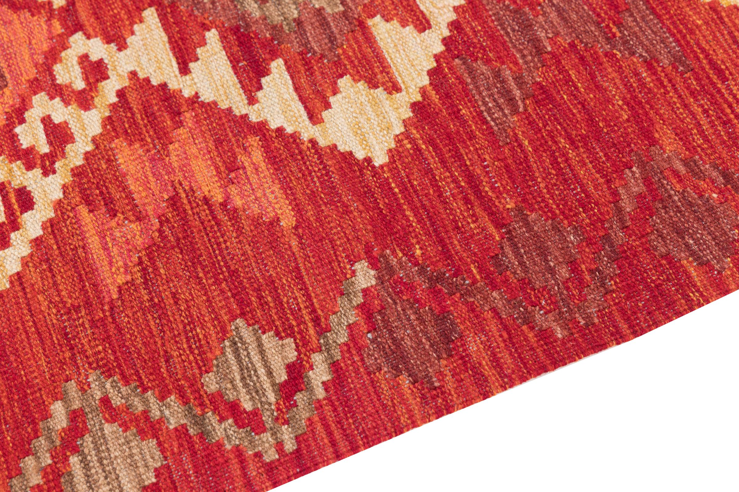 Dieser Teppich ist als Flachgewebe von Hand am Webstuhl gefertigt worden. Als Flachgewebe bezeichnet man Teppiche, die keinen Flor besitzen. Wie der Name verspricht, werden diese Teppiche gewebt und nicht geknotet. Dies hat einen flachen Teppich mit strukturierter Oberfläche zur Folge. Flachgewebe sind nicht so weich und meist dünner als geknüpfte Teppiche. Gleichzeitig sind sie deutlich weniger aufwändig in der Fertigung und lassen sich meist von beiden Seiten (Vorder- und Rückseite) auslegen. Ihre Muster sind in der Regel geometrisch, was durch das Gewebe bedingt ist.