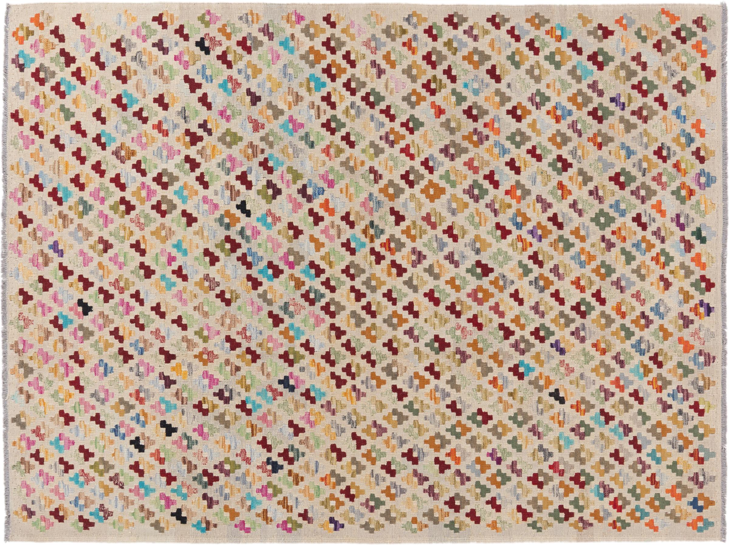 Dieser Teppich ist als Flachgewebe von Hand am Webstuhl gefertigt worden. Als Flachgewebe bezeichnet man Teppiche, die keinen Flor besitzen. Wie der Name verspricht, werden diese Teppiche gewebt und nicht geknotet. Dies hat einen flachen Teppich mit strukturierter Oberfläche zur Folge. Flachgewebe sind nicht so weich und meist dünner als geknüpfte Teppiche. Gleichzeitig sind sie deutlich weniger aufwändig in der Fertigung und lassen sich meist von beiden Seiten (Vorder- und Rückseite) auslegen. Ihre Muster sind in der Regel geometrisch, was durch das Gewebe bedingt ist.