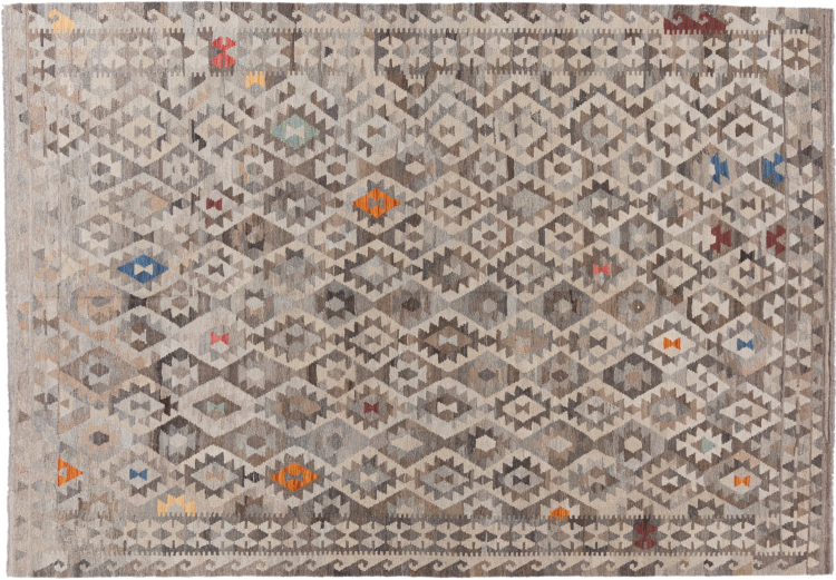 Dieser Teppich ist als Flachgewebe von Hand am Webstuhl gefertigt worden. Als Flachgewebe bezeichnet man Teppiche, die keinen Flor besitzen. Wie der Name verspricht, werden diese Teppiche gewebt und nicht geknotet. Dies hat einen flachen Teppich mit strukturierter Oberfläche zur Folge. Flachgewebe sind nicht so weich und meist dünner als geknüpfte Teppiche. Gleichzeitig sind sie deutlich weniger aufwändig in der Fertigung und lassen sich meist von beiden Seiten (Vorder- und Rückseite) auslegen. Ihre Muster sind in der Regel geometrisch, was durch das Gewebe bedingt ist.