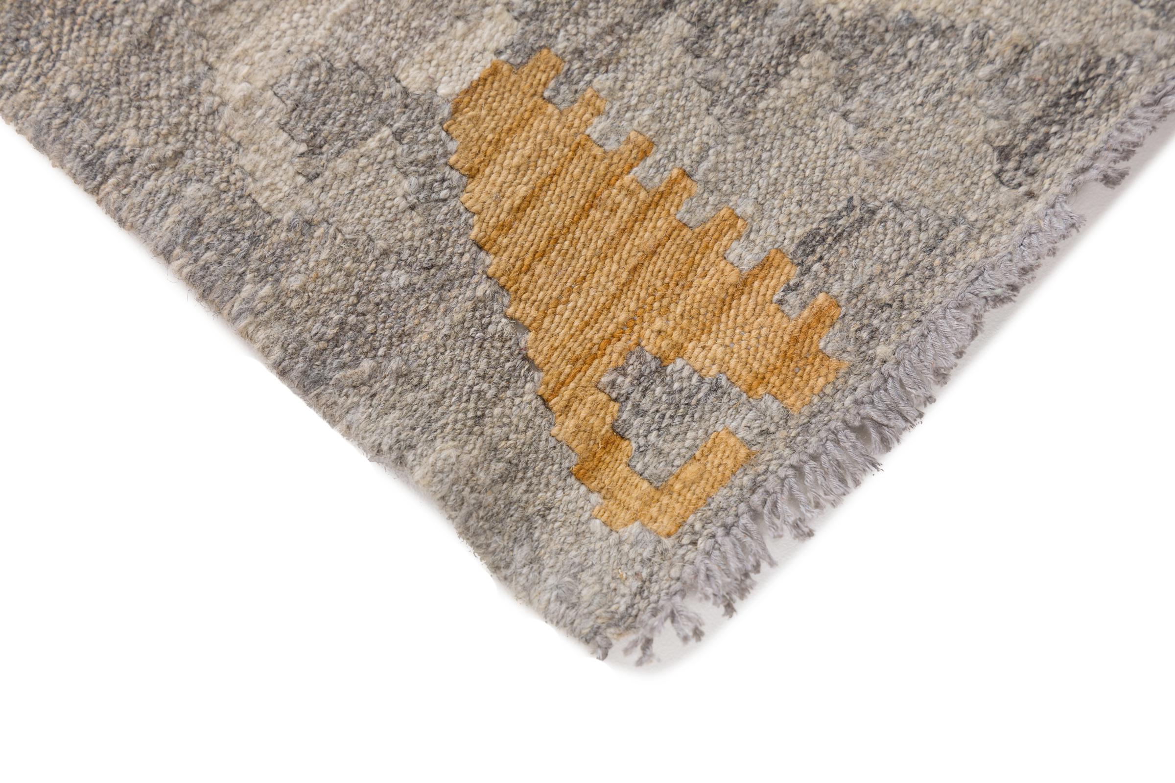 Dieser Teppich ist als Flachgewebe von Hand am Webstuhl gefertigt worden. Als Flachgewebe bezeichnet man Teppiche, die keinen Flor besitzen. Wie der Name verspricht, werden diese Teppiche gewebt und nicht geknotet. Dies hat einen flachen Teppich mit strukturierter Oberfläche zur Folge. Flachgewebe sind nicht so weich und meist dünner als geknüpfte Teppiche. Gleichzeitig sind sie deutlich weniger aufwändig in der Fertigung und lassen sich meist von beiden Seiten (Vorder- und Rückseite) auslegen. Ihre Muster sind in der Regel geometrisch, was durch das Gewebe bedingt ist.