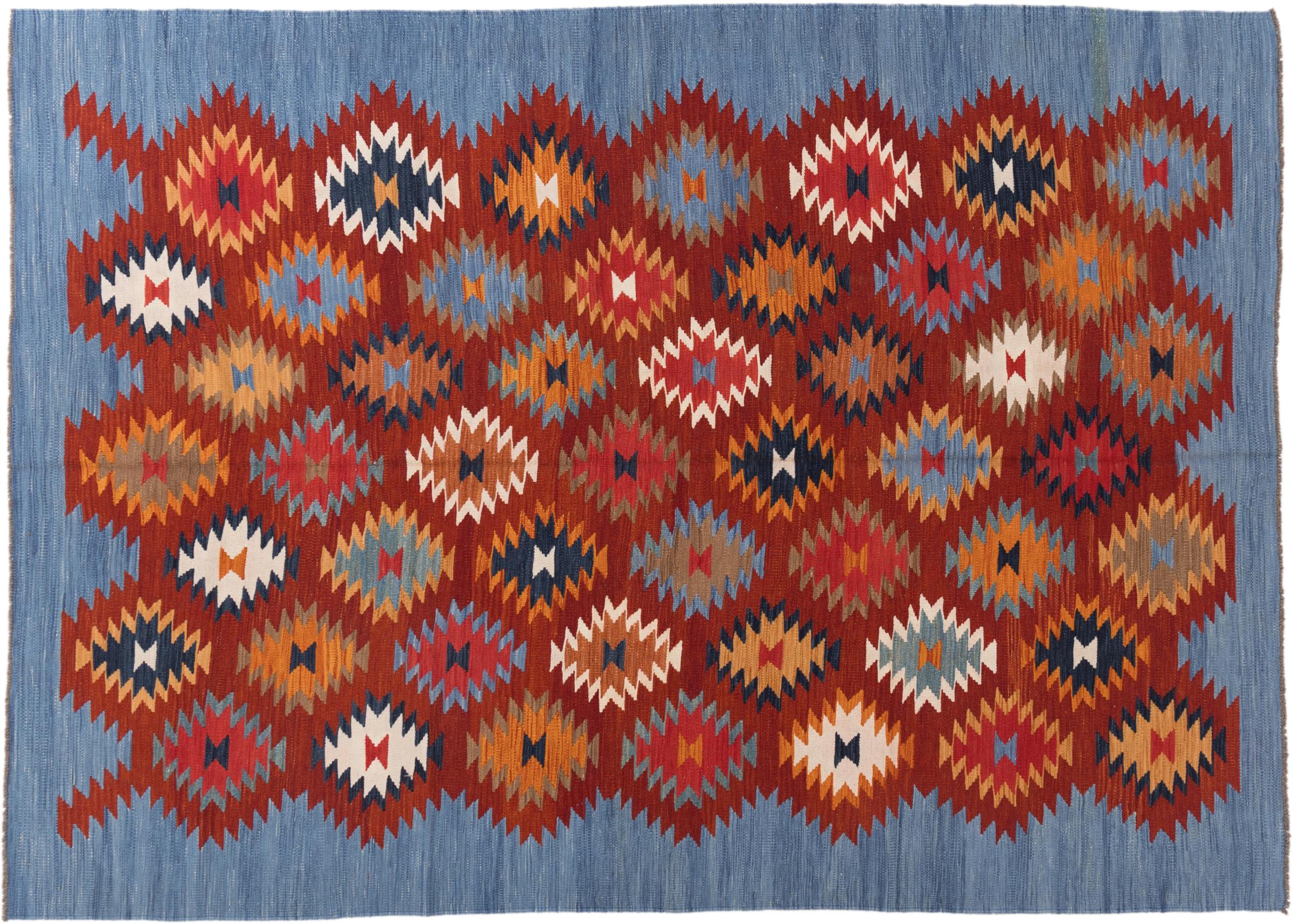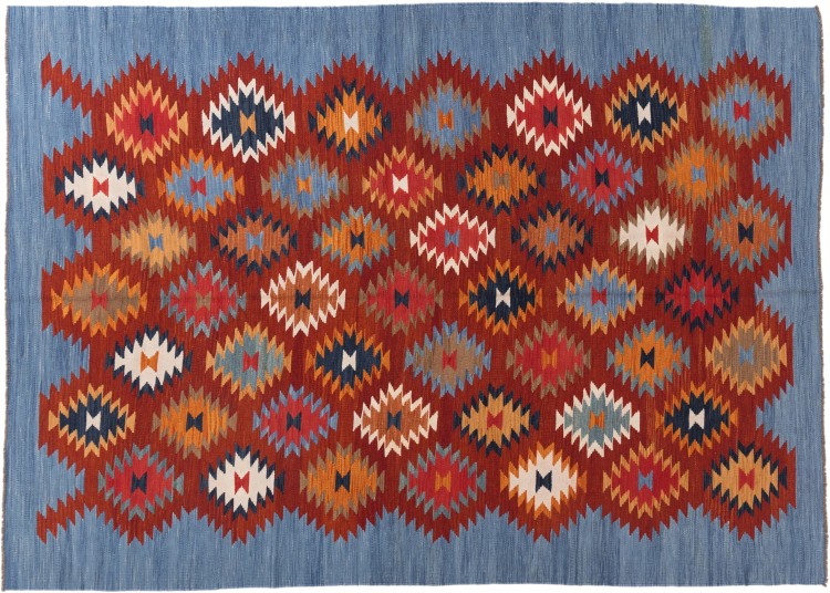 Dieser Teppich ist als Flachgewebe von Hand am Webstuhl gefertigt worden. Als Flachgewebe bezeichnet man Teppiche, die keinen Flor besitzen. Wie der Name verspricht, werden diese Teppiche gewebt und nicht geknotet. Dies hat einen flachen Teppich mit strukturierter Oberfläche zur Folge. Flachgewebe sind nicht so weich und meist dünner als geknüpfte Teppiche. Gleichzeitig sind sie deutlich weniger aufwändig in der Fertigung und lassen sich meist von beiden Seiten (Vorder- und Rückseite) auslegen. Ihre Muster sind in der Regel geometrisch, was durch das Gewebe bedingt ist.