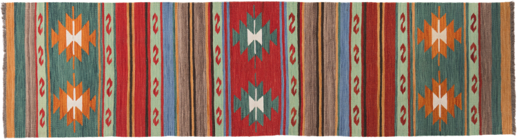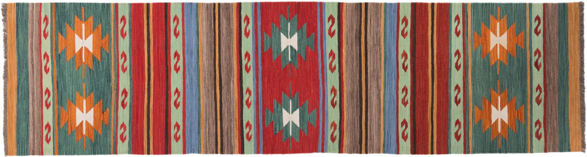 Teppich-Nr.: 2943000051209 Größe: 10'0"x2'8" ft Dicke: ca. 0.12 in Verarbeitung: Handgewebt Flor: Handgesponnene Wolle Kette: Natürliche Wolle Ursprung: Afghanistan Alter: Neu Gewicht: ca. 9 lb Auch bekannt als Kilim, Qilim, Chilim, Afgan, Afghán Anzahl auf Lager: Unikat - Nur 1 auf Lager