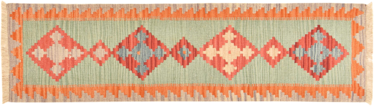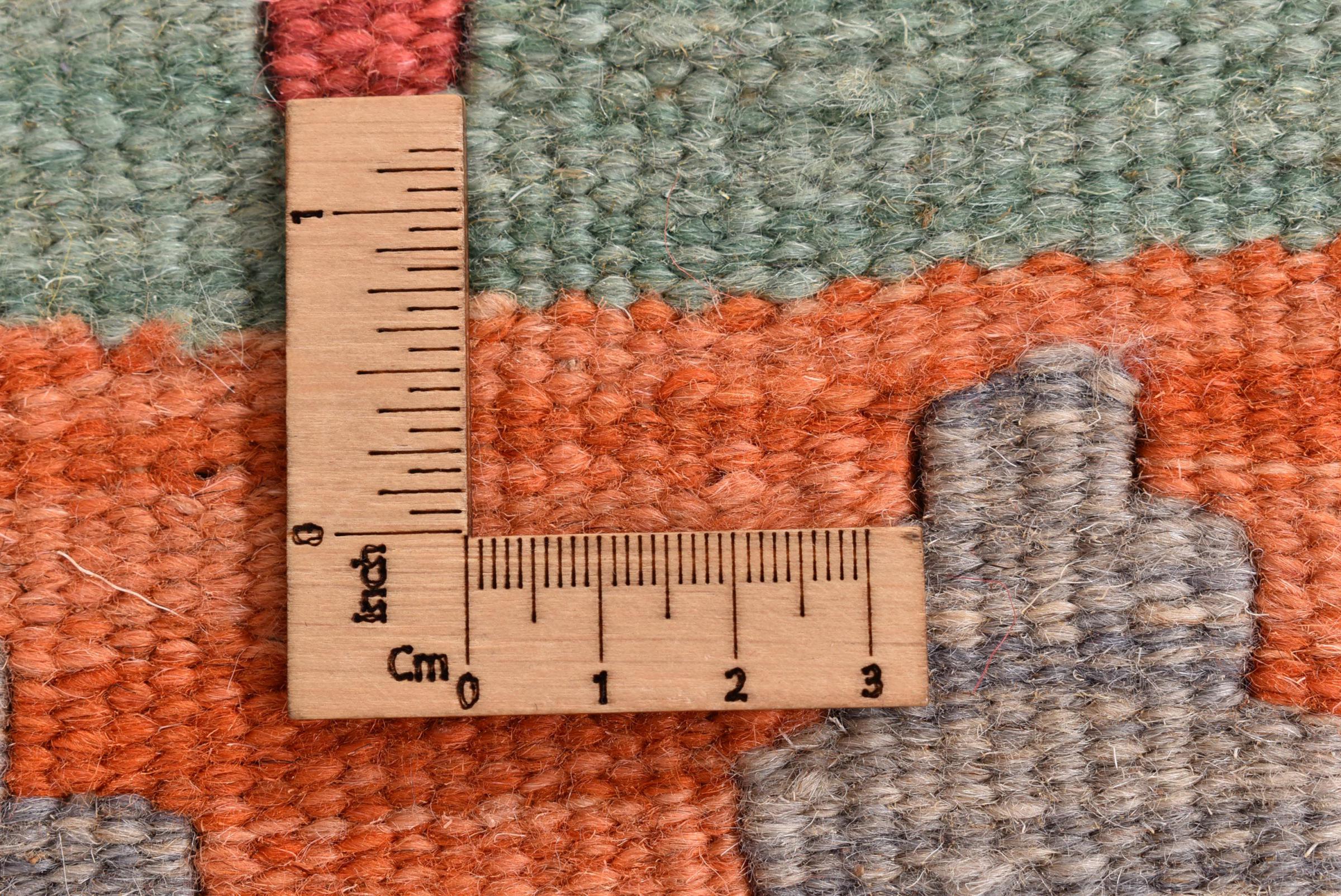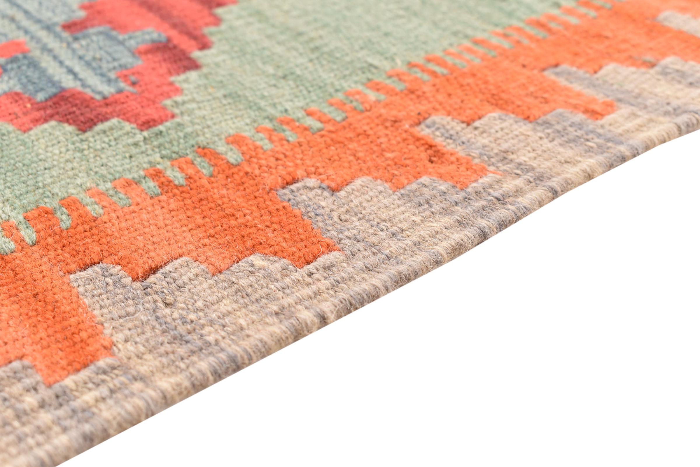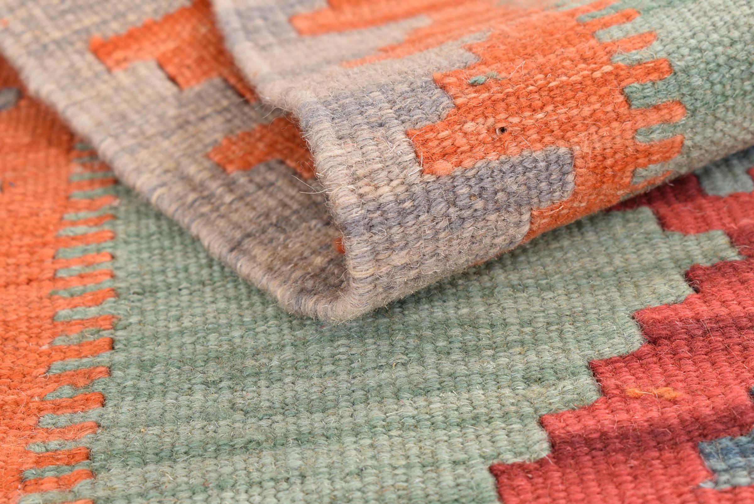 Dieser Teppich ist als Flachgewebe von Hand am Webstuhl gefertigt worden. Als Flachgewebe bezeichnet man Teppiche, die keinen Flor besitzen. Wie der Name verspricht, werden diese Teppiche gewebt und nicht geknotet. Dies hat einen flachen Teppich mit strukturierter Oberfläche zur Folge. Flachgewebe sind nicht so weich und meist dünner als geknüpfte Teppiche. Gleichzeitig sind sie deutlich weniger aufwändig in der Fertigung und lassen sich meist von beiden Seiten (Vorder- und Rückseite) auslegen. Ihre Muster sind in der Regel geometrisch, was durch das Gewebe bedingt ist.