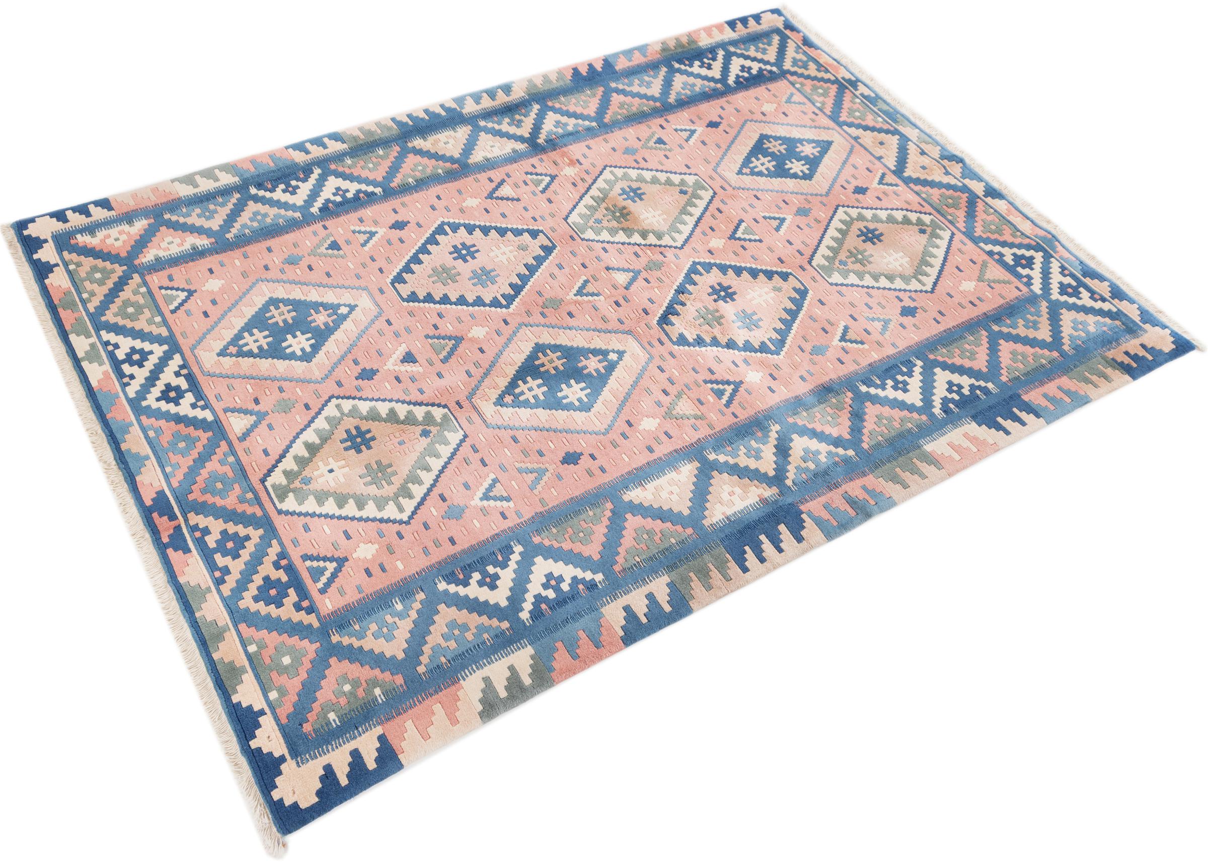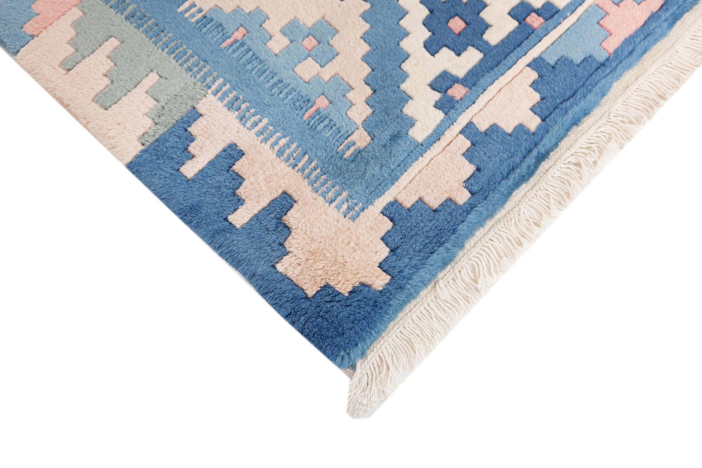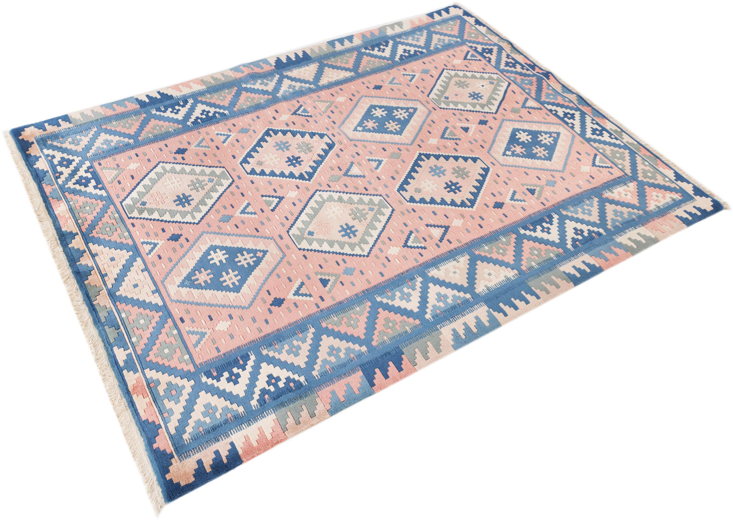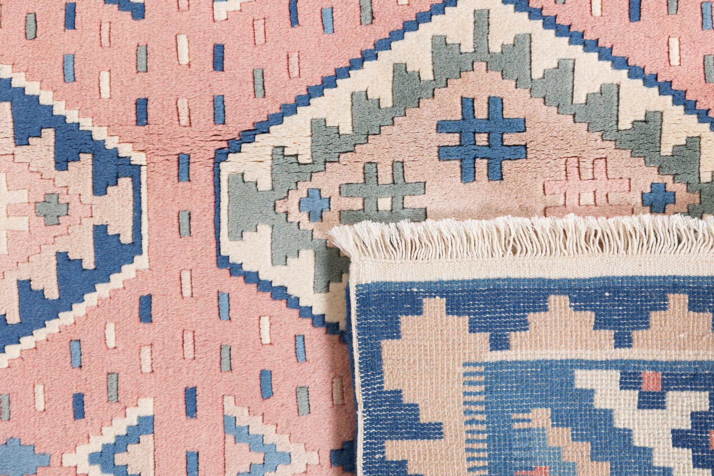 Dieser Teppich ist als Flachgewebe von Hand am Webstuhl gefertigt worden. Als Flachgewebe bezeichnet man Teppiche, die keinen Flor besitzen. Wie der Name verspricht, werden diese Teppiche gewebt und nicht geknotet. Dies hat einen flachen Teppich mit strukturierter Oberfläche zur Folge. Flachgewebe sind nicht so weich und meist dünner als geknüpfte Teppiche. Gleichzeitig sind sie deutlich weniger aufwändig in der Fertigung und lassen sich meist von beiden Seiten (Vorder- und Rückseite) auslegen. Ihre Muster sind in der Regel geometrisch, was durch das Gewebe bedingt ist.