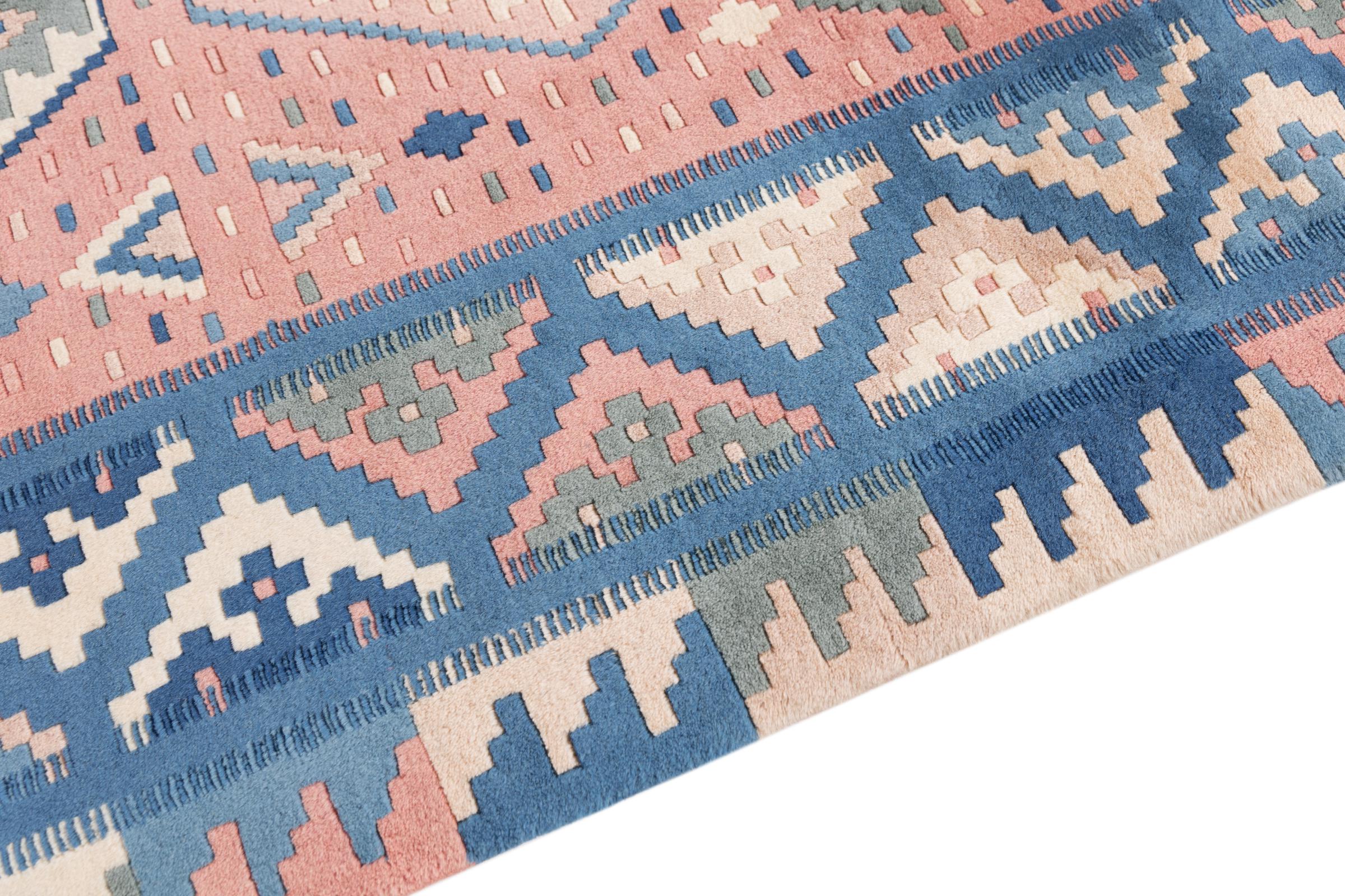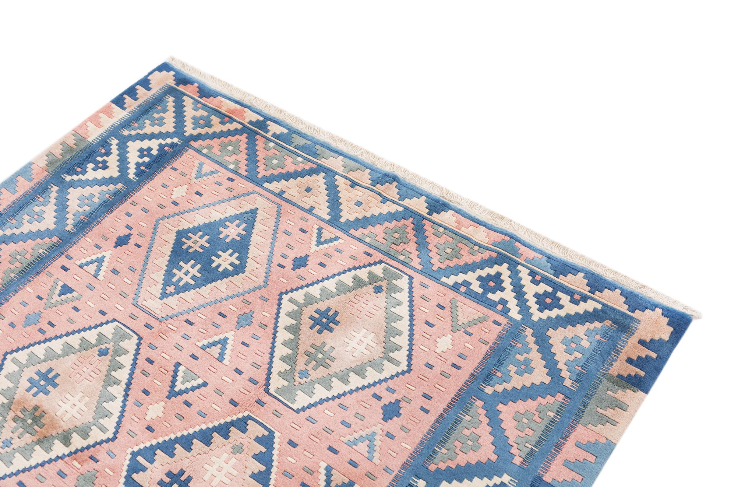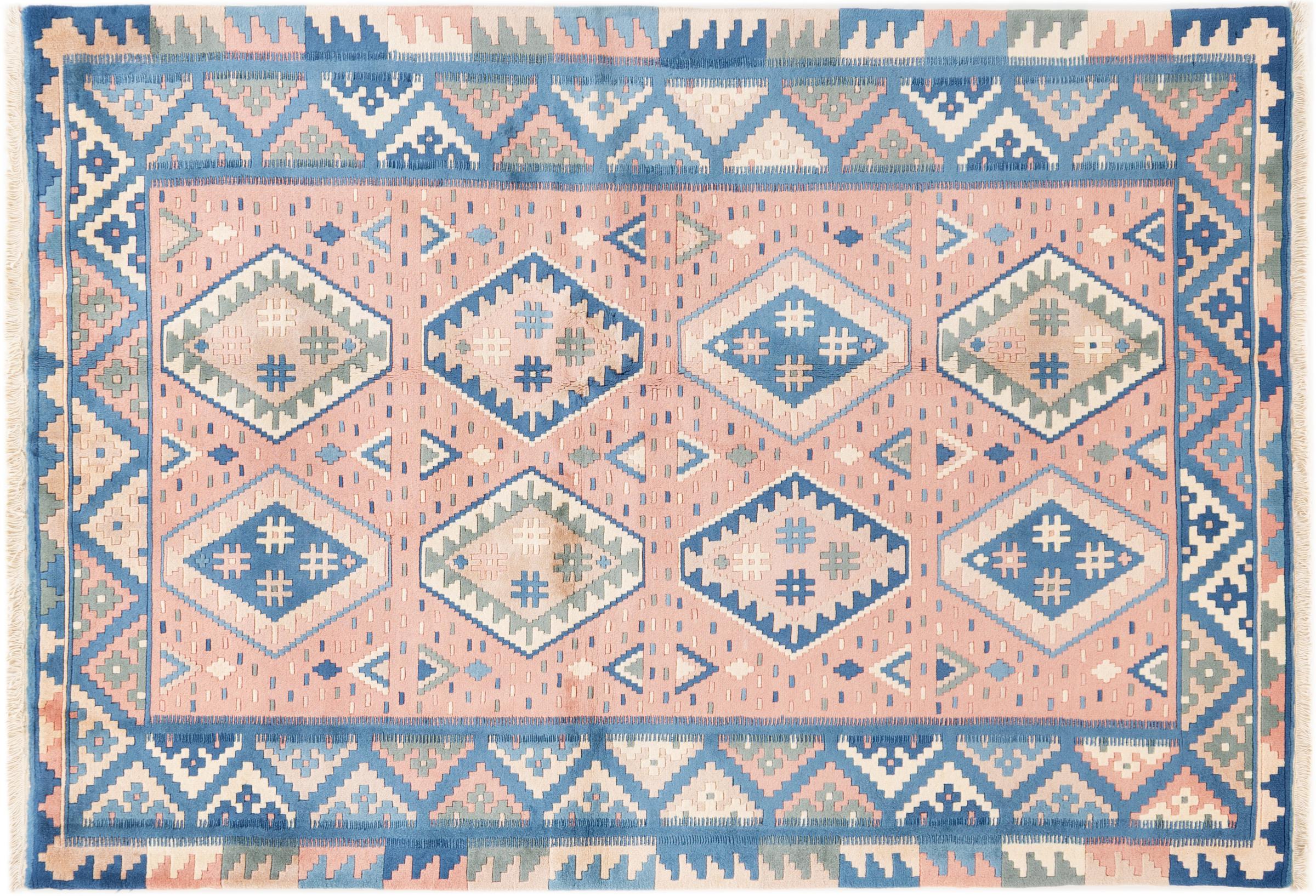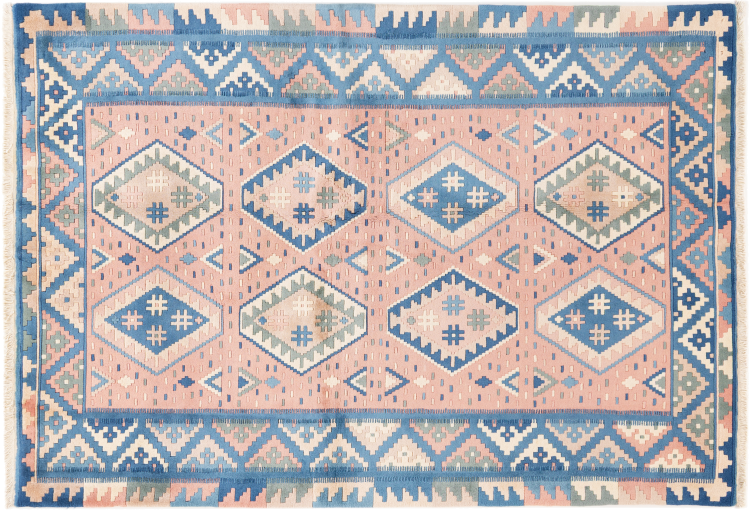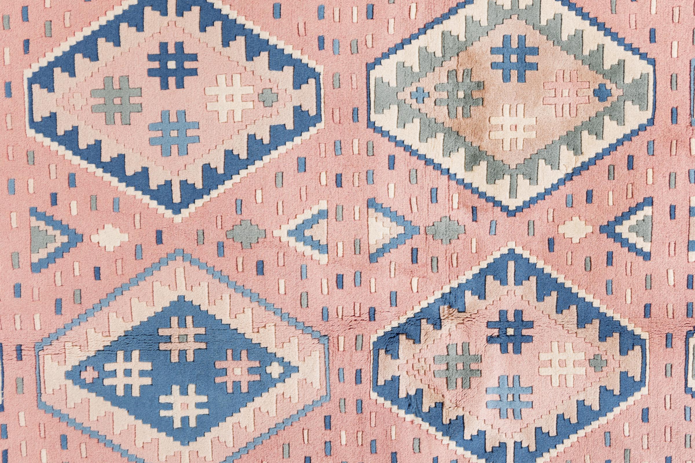 Dieser Teppich ist als Flachgewebe von Hand am Webstuhl gefertigt worden. Als Flachgewebe bezeichnet man Teppiche, die keinen Flor besitzen. Wie der Name verspricht, werden diese Teppiche gewebt und nicht geknotet. Dies hat einen flachen Teppich mit strukturierter Oberfläche zur Folge. Flachgewebe sind nicht so weich und meist dünner als geknüpfte Teppiche. Gleichzeitig sind sie deutlich weniger aufwändig in der Fertigung und lassen sich meist von beiden Seiten (Vorder- und Rückseite) auslegen. Ihre Muster sind in der Regel geometrisch, was durch das Gewebe bedingt ist.