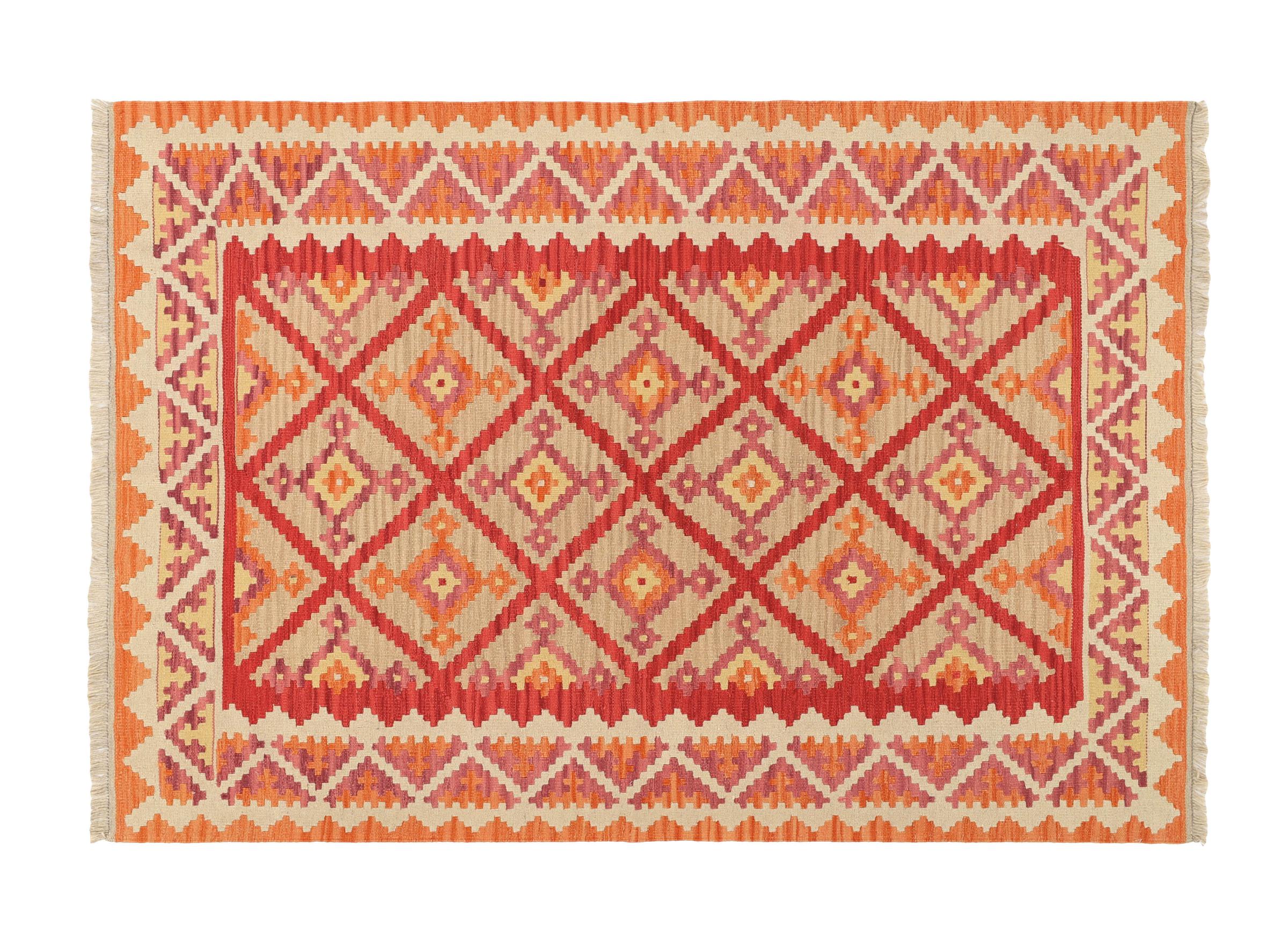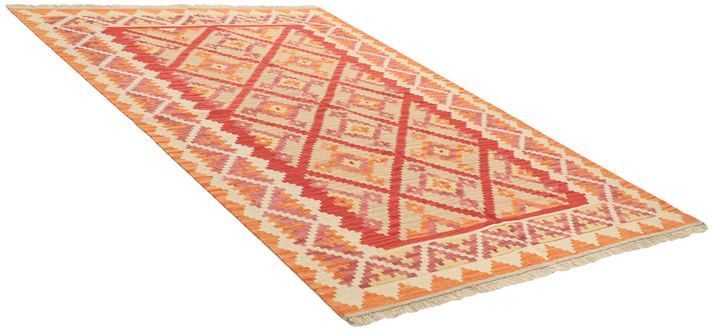 Diese Kelim Teppiche weisen einen entscheidenden Unterschied zu handgeknüpften Teppichen auf - sie werden von Hand gewebt. So besitzen sie keinen hochstehenden Flor aus Wolle und sind oft flacher und rauer als geknüpfte Wollteppiche. Ihre Machart ist weniger aufwändig und so sind sie in der Regel auf deutlich kostengünstiger. Als Vorteil sind Kelim Teppiche zudem viel leichter und können von der Vorder- und Rückseite ausgelegt werden. Handgewebte Kelims stammen ursprünglich aus dem ehemaligen Persien und werden heute auch viel in Afghanistan gefertigt. Sie haben eher schlichte geradlinige Muster, die durch ihre Webtechnik bedingt sind.