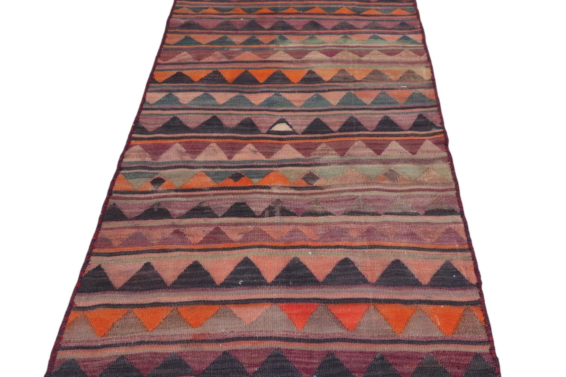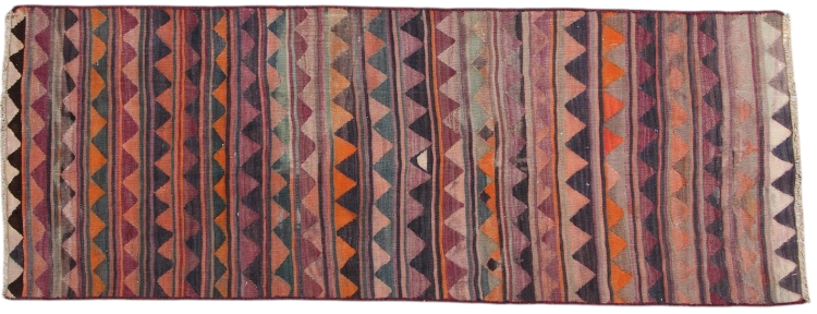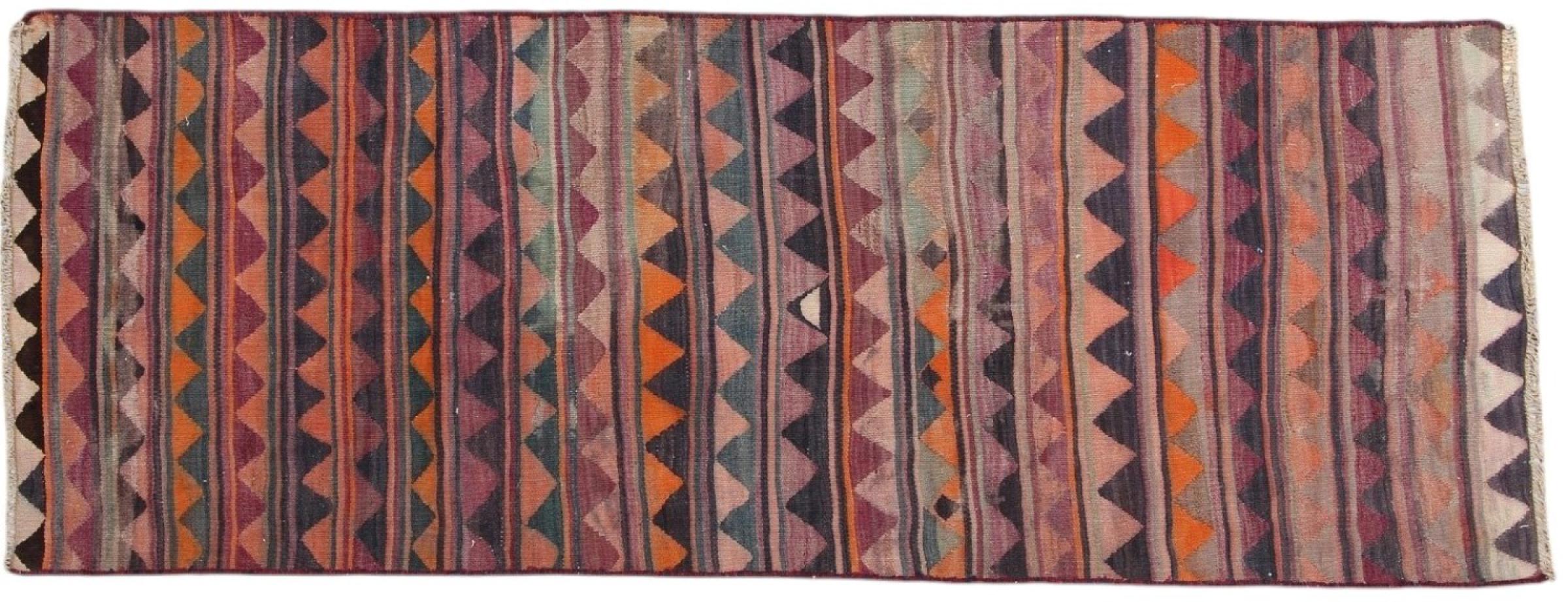 Dieser Teppich ist als Flachgewebe von Hand am Webstuhl gefertigt worden. Als Flachgewebe bezeichnet man Teppiche, die keinen Flor besitzen. Wie der Name verspricht, werden diese Teppiche gewebt und nicht geknotet. Dies hat einen flachen Teppich mit strukturierter Oberfläche zur Folge. Flachgewebe sind nicht so weich und meist dünner als geknüpfte Teppiche. Gleichzeitig sind sie deutlich weniger aufwändig in der Fertigung und lassen sich meist von beiden Seiten (Vorder- und Rückseite) auslegen. Ihre Muster sind in der Regel geometrisch, was durch das Gewebe bedingt ist.