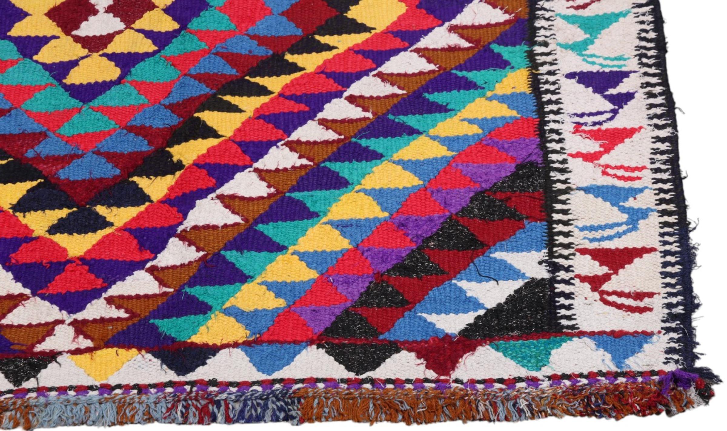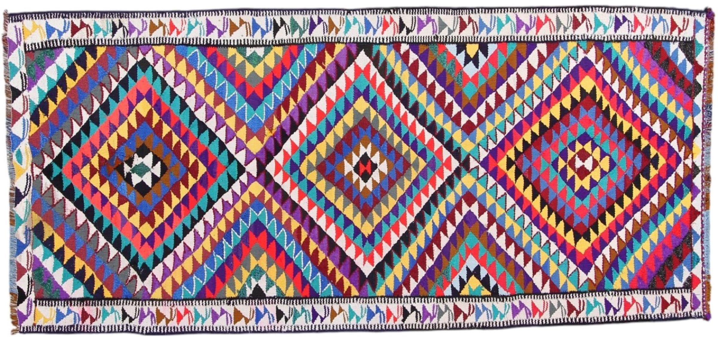Dieser Teppich ist als Flachgewebe von Hand am Webstuhl gefertigt worden. Als Flachgewebe bezeichnet man Teppiche, die keinen Flor besitzen. Wie der Name verspricht, werden diese Teppiche gewebt und nicht geknotet. Dies hat einen flachen Teppich mit strukturierter Oberfläche zur Folge. Flachgewebe sind nicht so weich und meist dünner als geknüpfte Teppiche. Gleichzeitig sind sie deutlich weniger aufwändig in der Fertigung und lassen sich meist von beiden Seiten (Vorder- und Rückseite) auslegen. Ihre Muster sind in der Regel geometrisch, was durch das Gewebe bedingt ist.