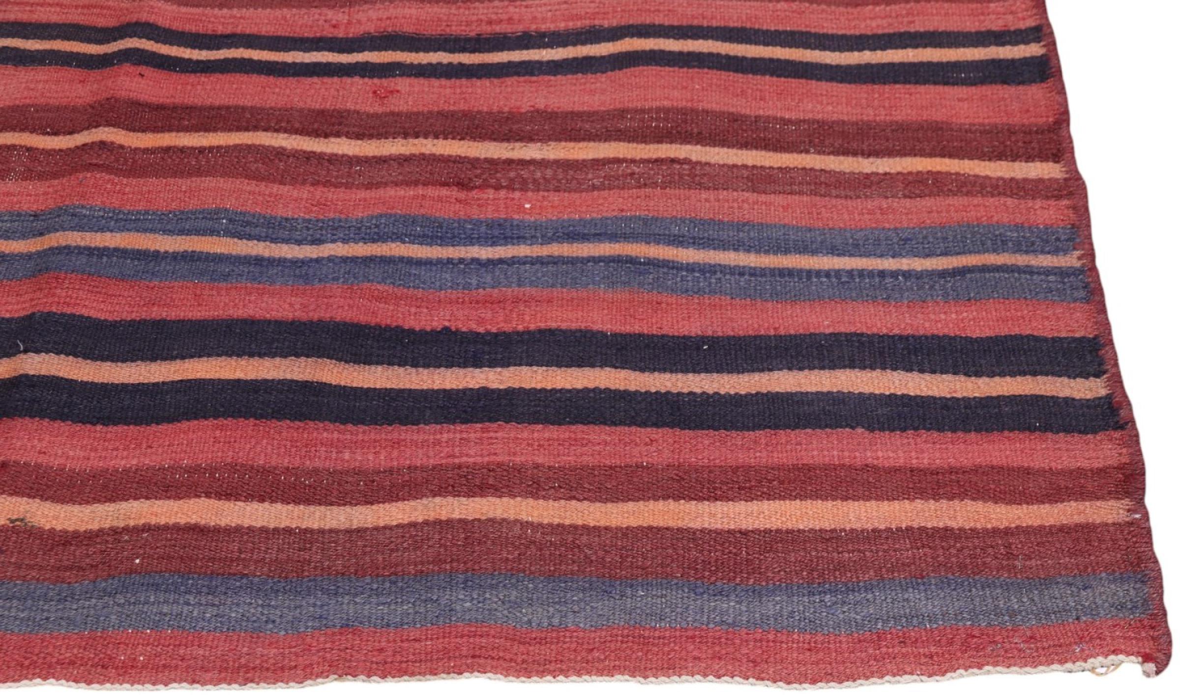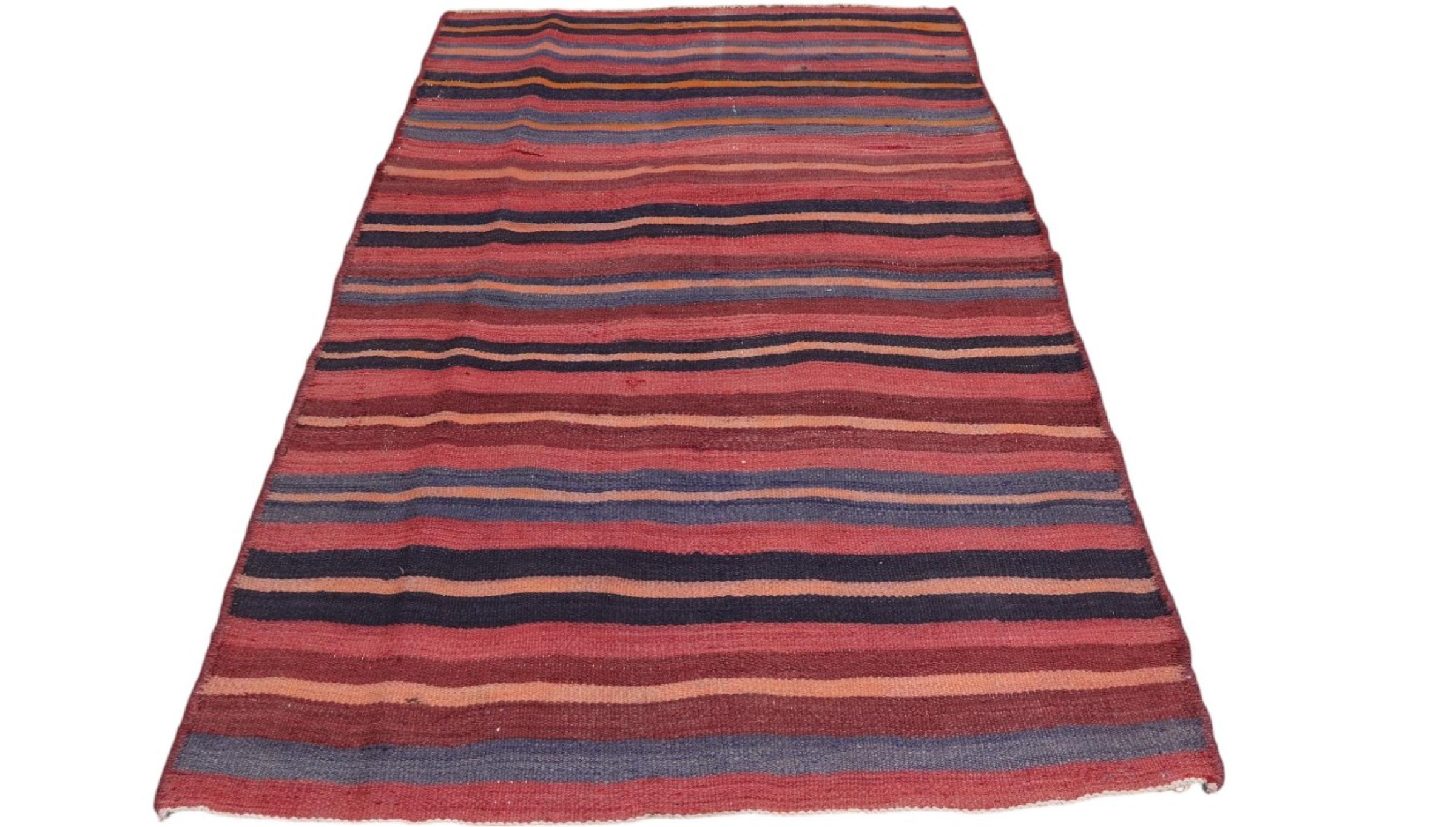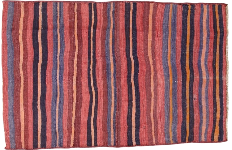 Dieser Teppich ist als Flachgewebe von Hand am Webstuhl gefertigt worden. Als Flachgewebe bezeichnet man Teppiche, die keinen Flor besitzen. Wie der Name verspricht, werden diese Teppiche gewebt und nicht geknotet. Dies hat einen flachen Teppich mit strukturierter Oberfläche zur Folge. Flachgewebe sind nicht so weich und meist dünner als geknüpfte Teppiche. Gleichzeitig sind sie deutlich weniger aufwändig in der Fertigung und lassen sich meist von beiden Seiten (Vorder- und Rückseite) auslegen. Ihre Muster sind in der Regel geometrisch, was durch das Gewebe bedingt ist.