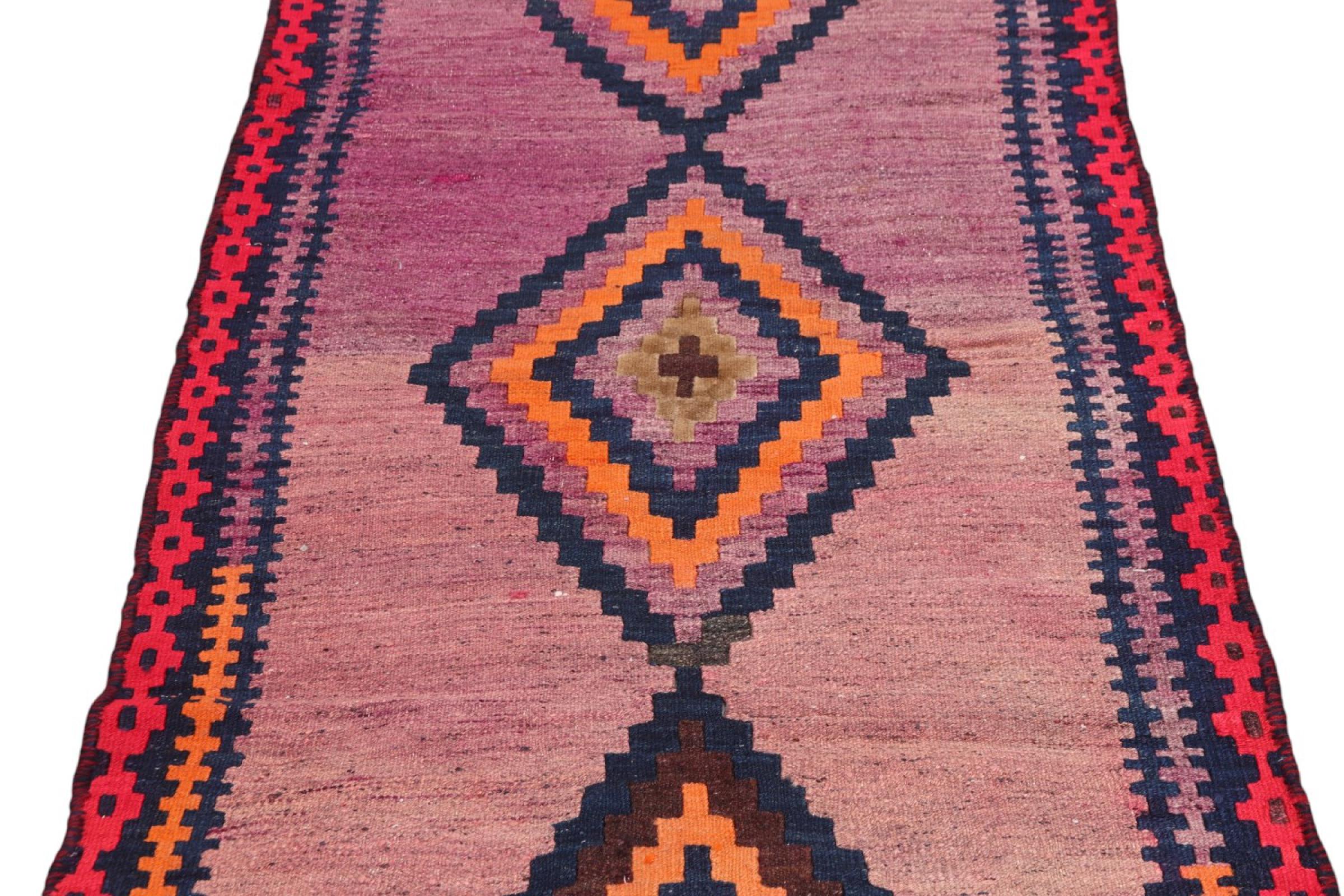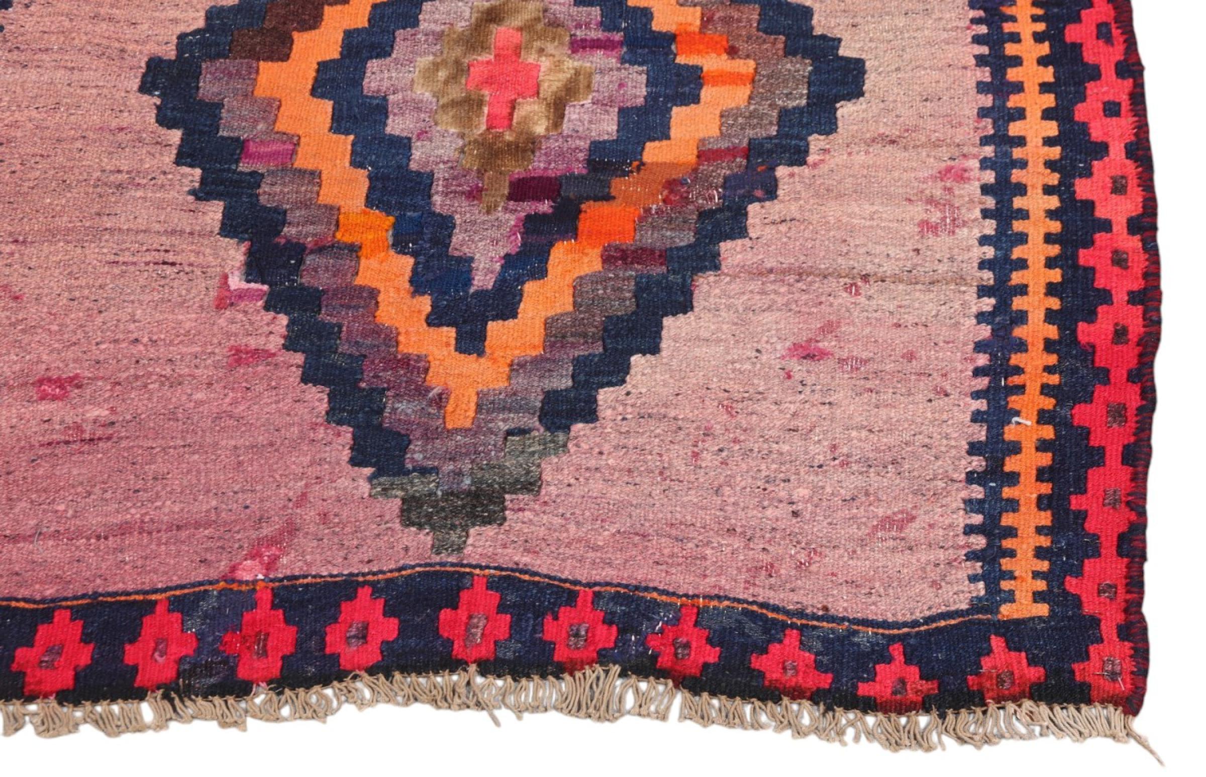 Dieser Teppich ist als Flachgewebe von Hand am Webstuhl gefertigt worden. Als Flachgewebe bezeichnet man Teppiche, die keinen Flor besitzen. Wie der Name verspricht, werden diese Teppiche gewebt und nicht geknotet. Dies hat einen flachen Teppich mit strukturierter Oberfläche zur Folge. Flachgewebe sind nicht so weich und meist dünner als geknüpfte Teppiche. Gleichzeitig sind sie deutlich weniger aufwändig in der Fertigung und lassen sich meist von beiden Seiten (Vorder- und Rückseite) auslegen. Ihre Muster sind in der Regel geometrisch, was durch das Gewebe bedingt ist.